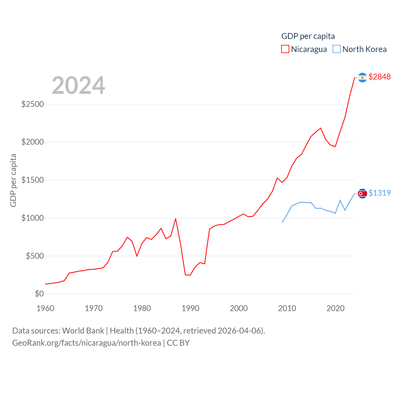 By GDP, Nicaragua ranks 131/197 ($19.7B) and North Korea ranks 106/197 ($34.9B). By GDP per capita, Nicaragua ranks 141/197 ($2,848), while North Korea ranks 168/197 ($1,319).