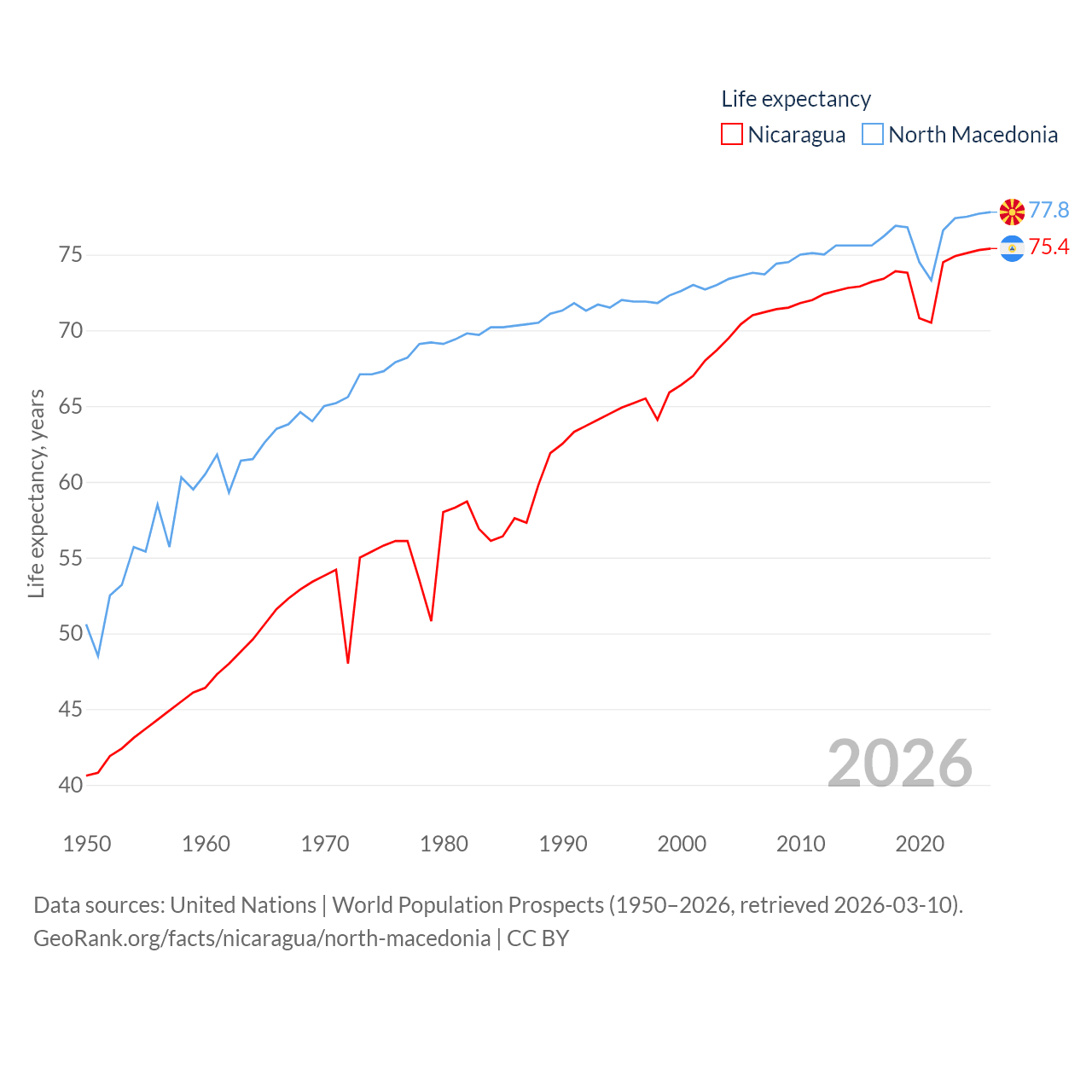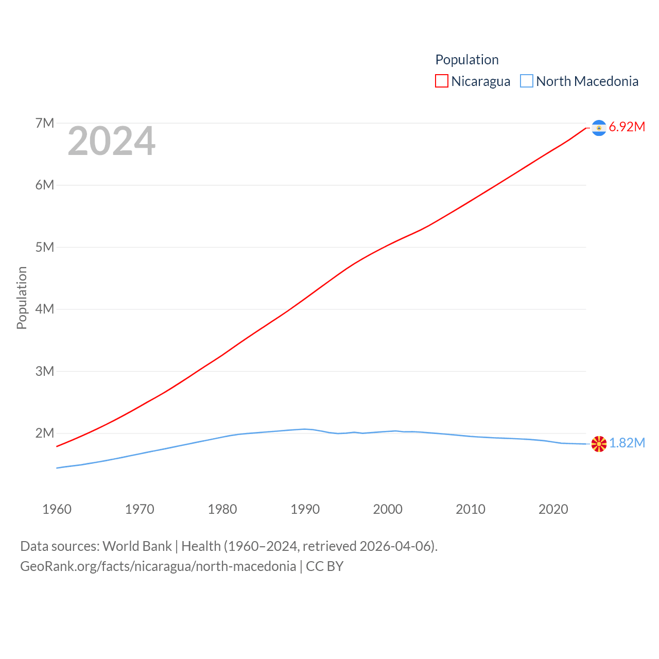 Nicaragua has a population of 6.92M (ranked 108/197), compared with 1.82M in North Macedonia (ranked 150/197). Nicaragua's land area is 46,464 sq mi versus 9,737 sq mi for North Macedonia (ranked 98th vs. 145th).