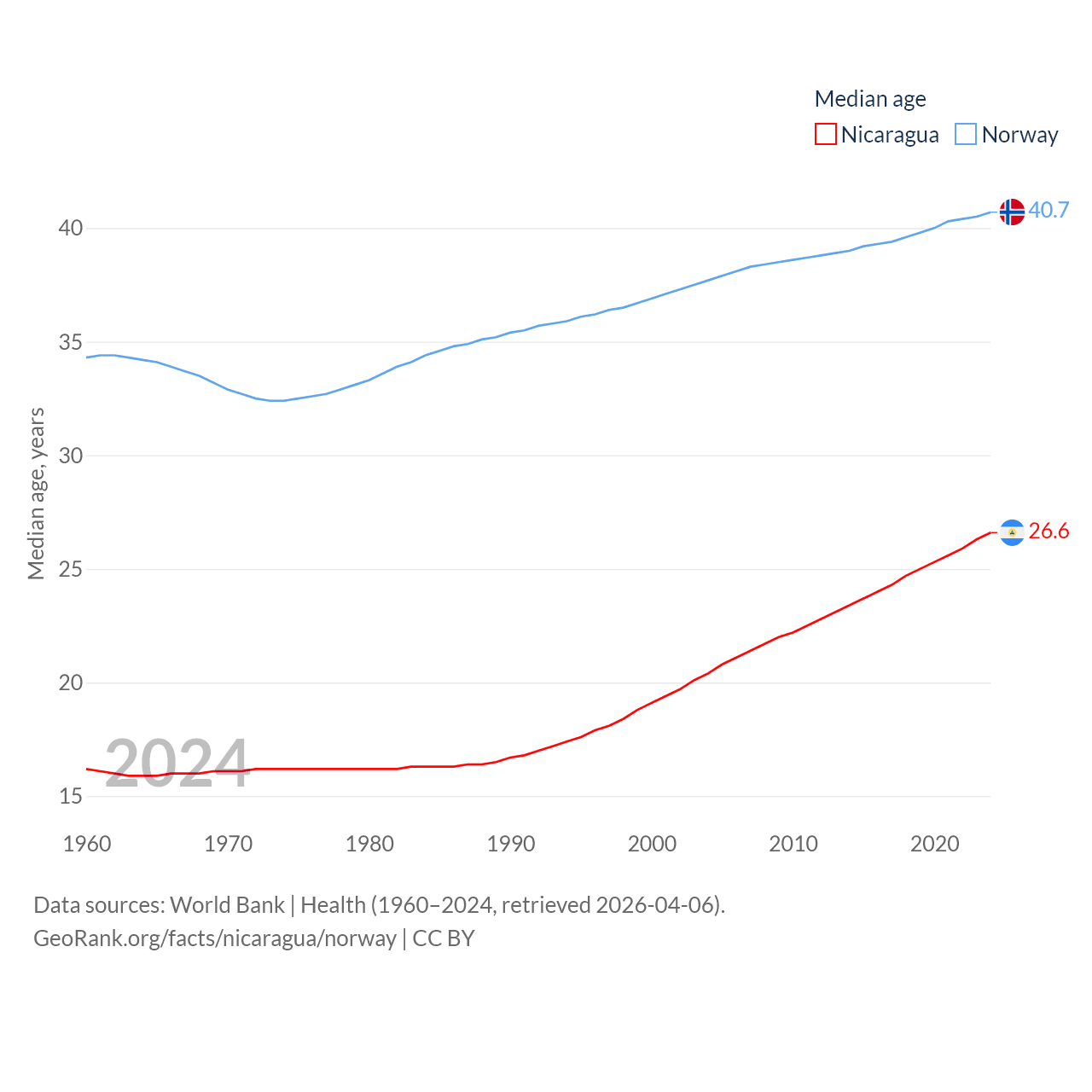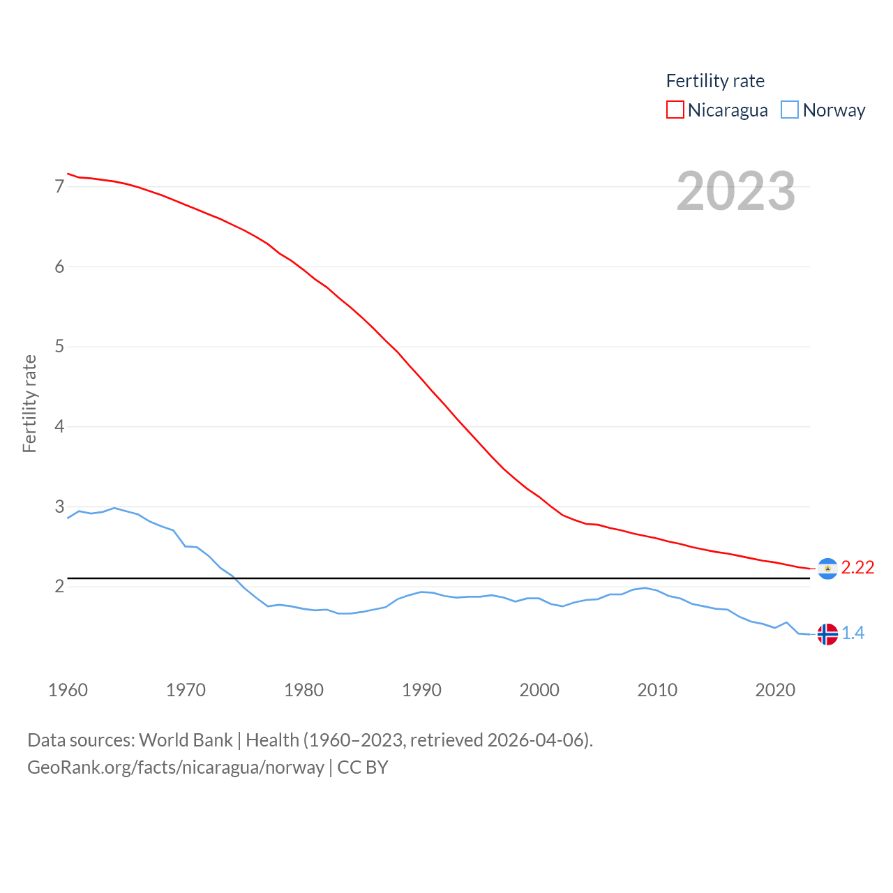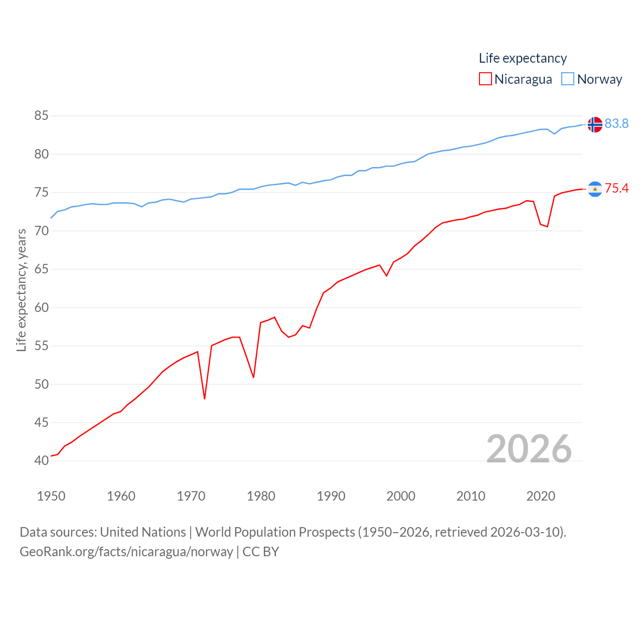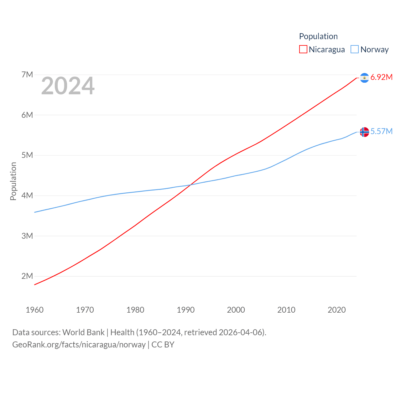 Nicaragua has a population of 6.92M (ranked 108/197), compared with 5.57M in Norway (ranked 118/197). Nicaragua's land area is 46,464 sq mi versus 140,645 sq mi for Norway (ranked 98th vs. 62nd).