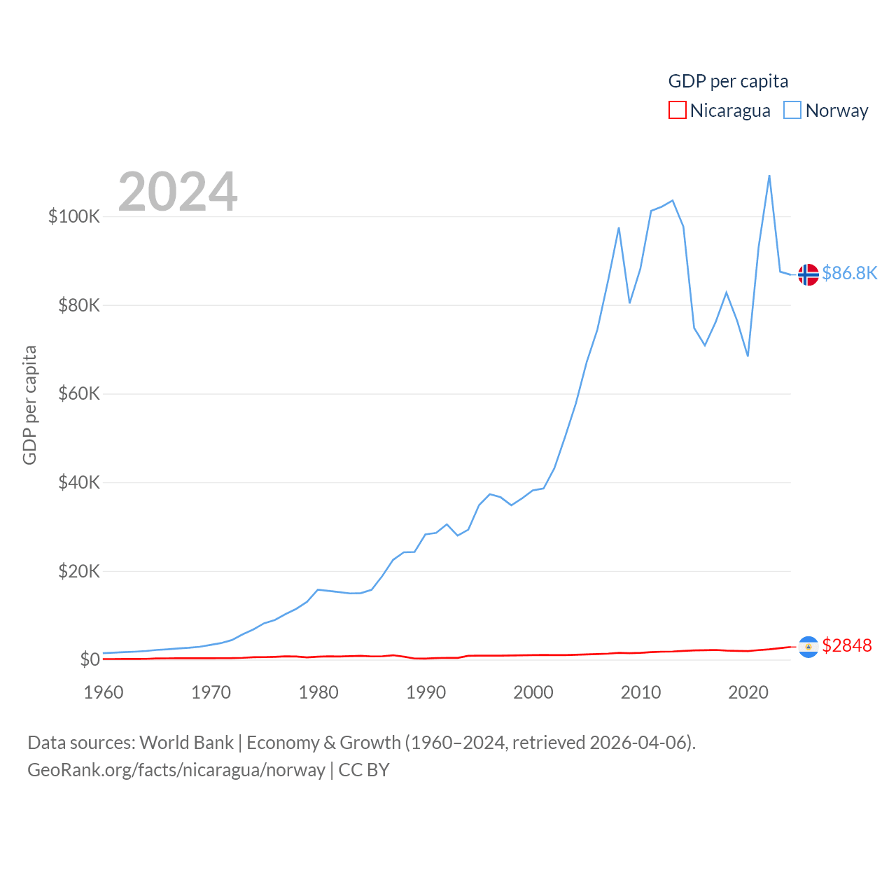 By GDP, Nicaragua ranks 131/197 ($19.7B) and Norway ranks 32/197 ($484B). By GDP per capita, Nicaragua ranks 141/197 ($2,848), while Norway ranks 8/197 ($86,785).