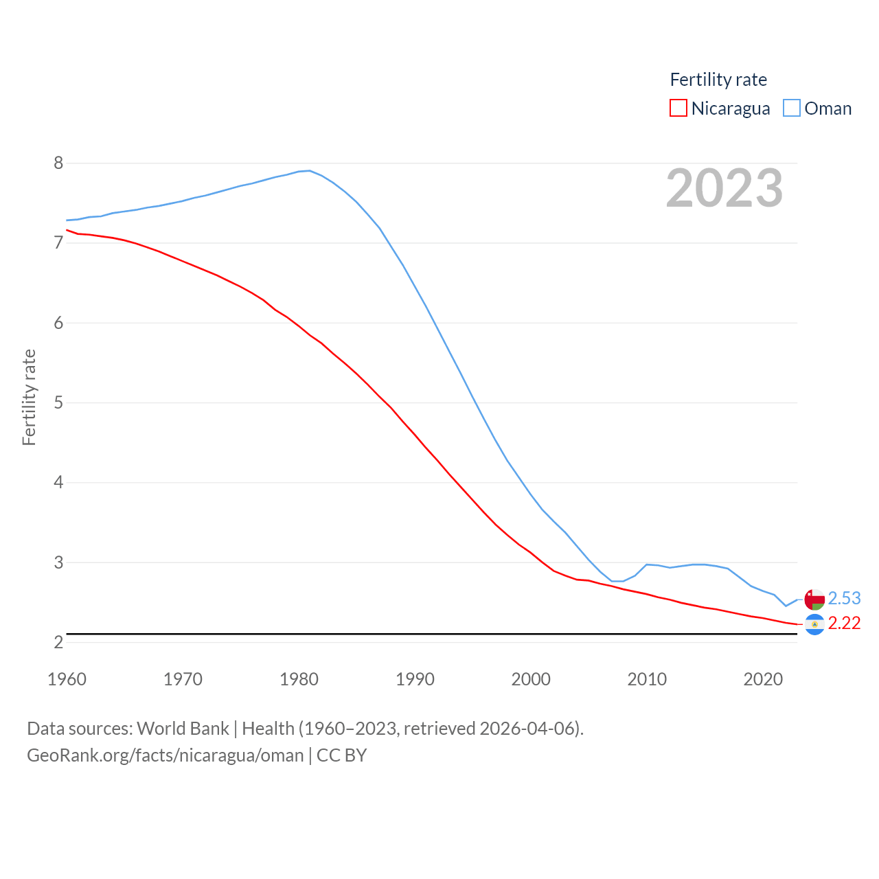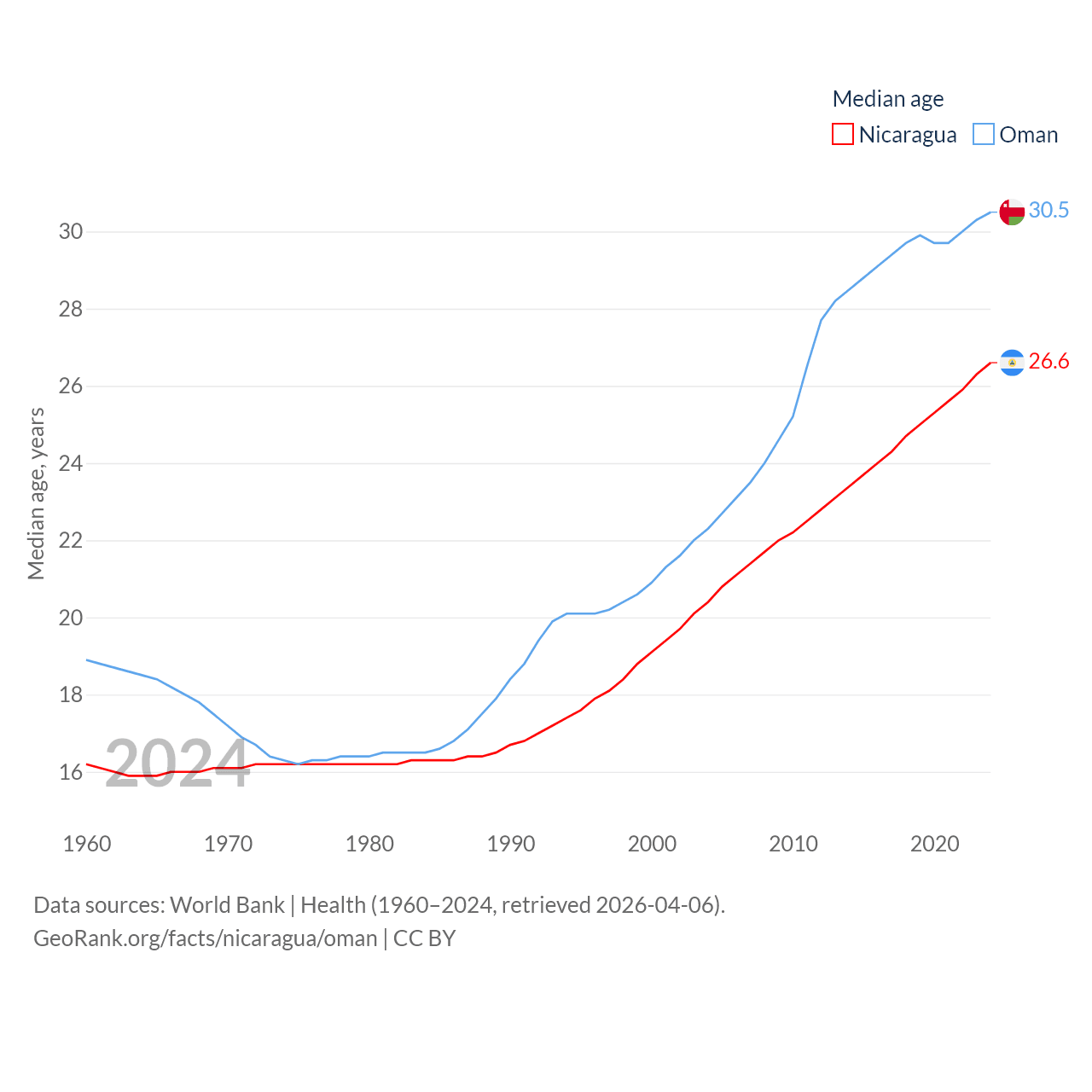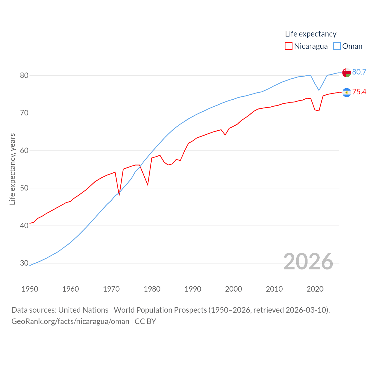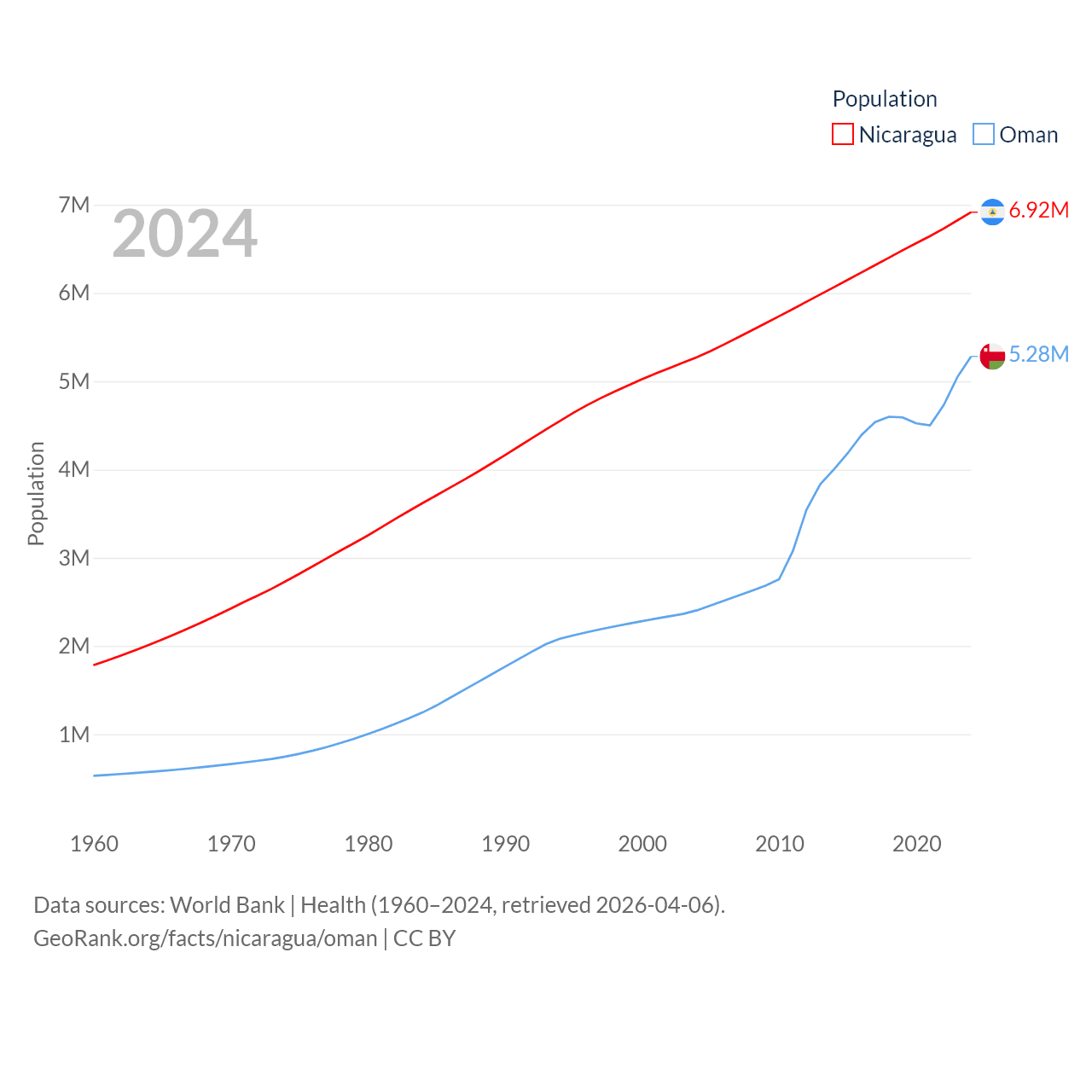 Nicaragua has a population of 6.92M (ranked 108/197), compared with 5.28M in Oman (ranked 124/197). Nicaragua's land area is 46,464 sq mi versus 119,499 sq mi for Oman (ranked 98th vs. 68th).