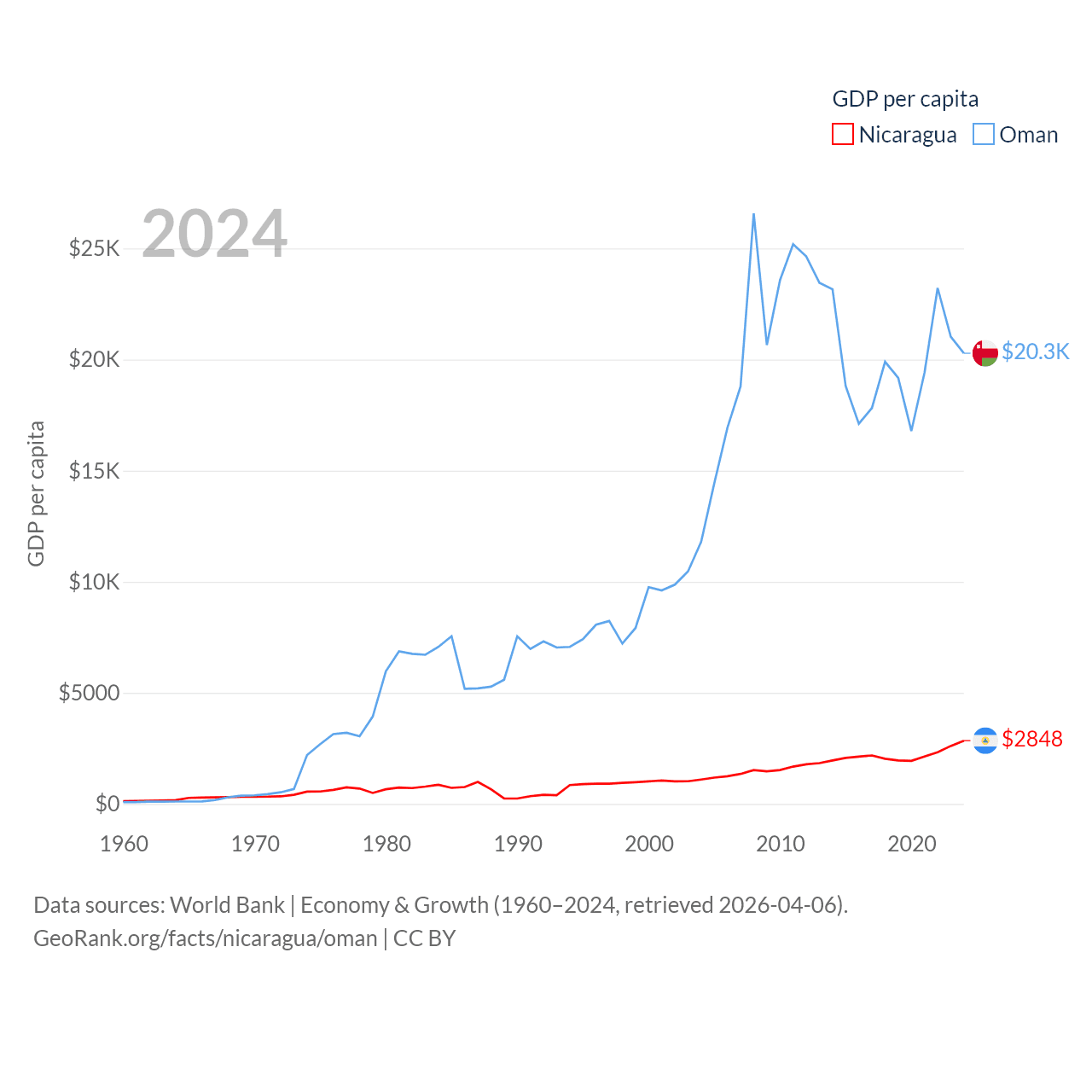 By GDP, Nicaragua ranks 131/197 ($19.7B) and Oman ranks 70/197 ($107B). By GDP per capita, Nicaragua ranks 141/197 ($2,848), while Oman ranks 57/197 ($20,285).