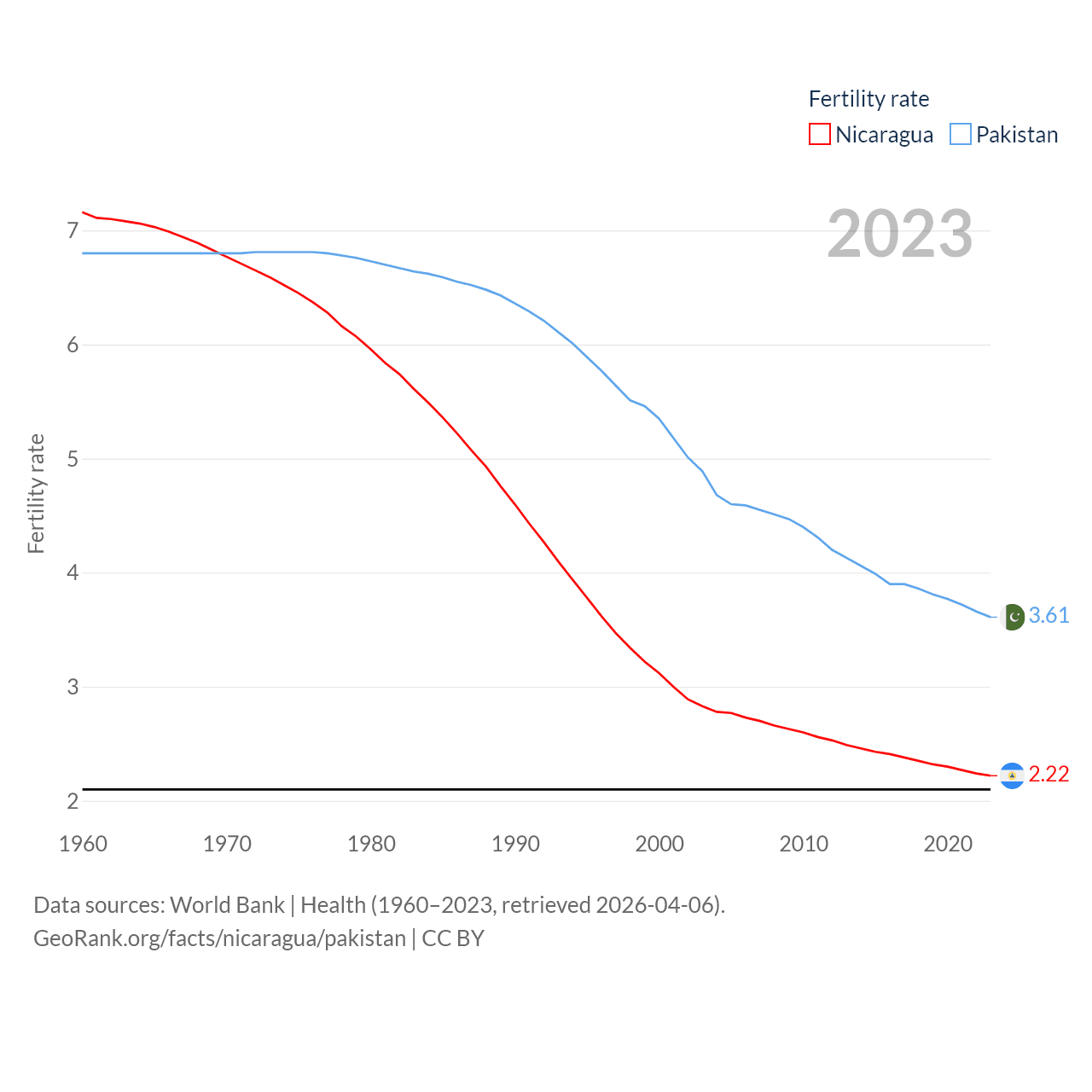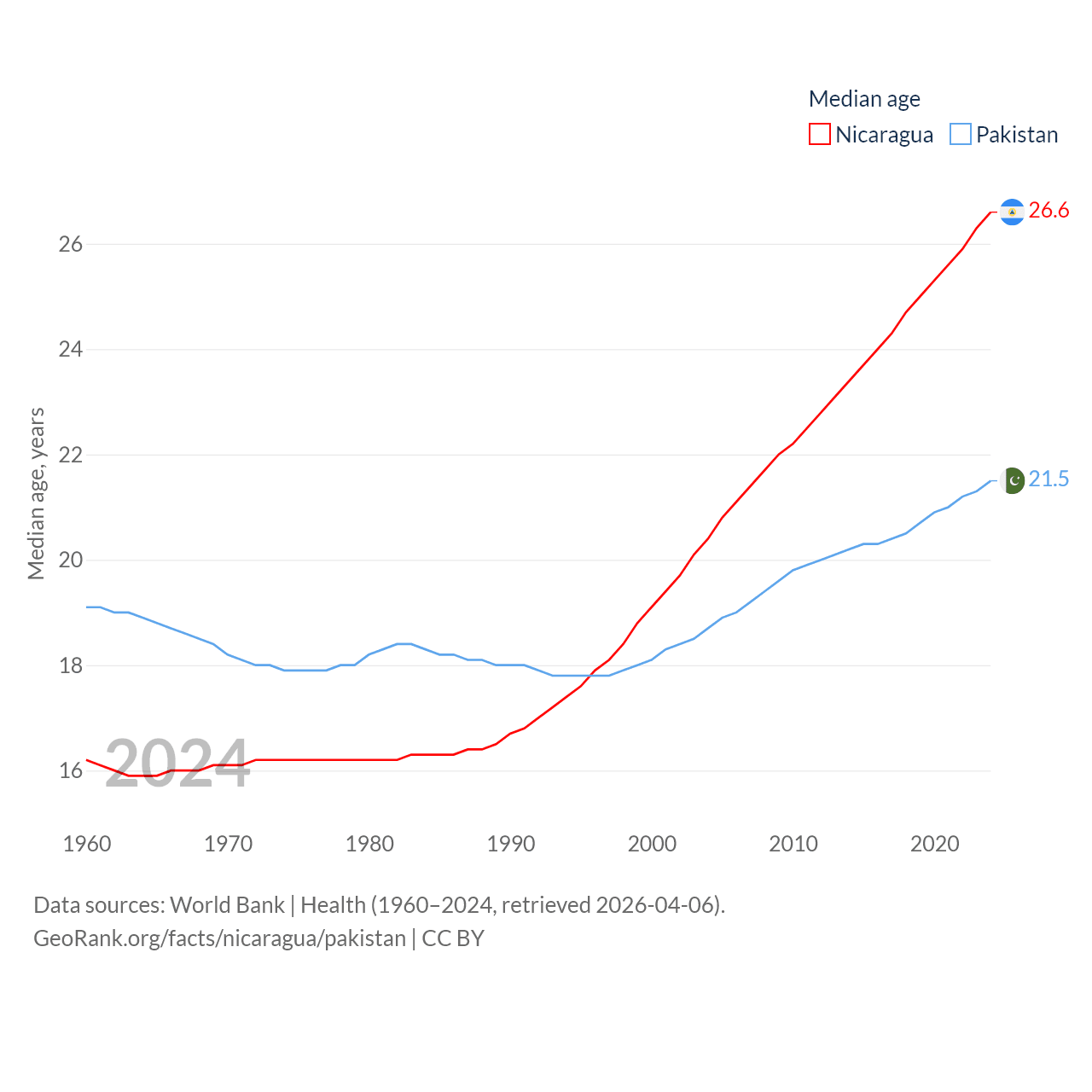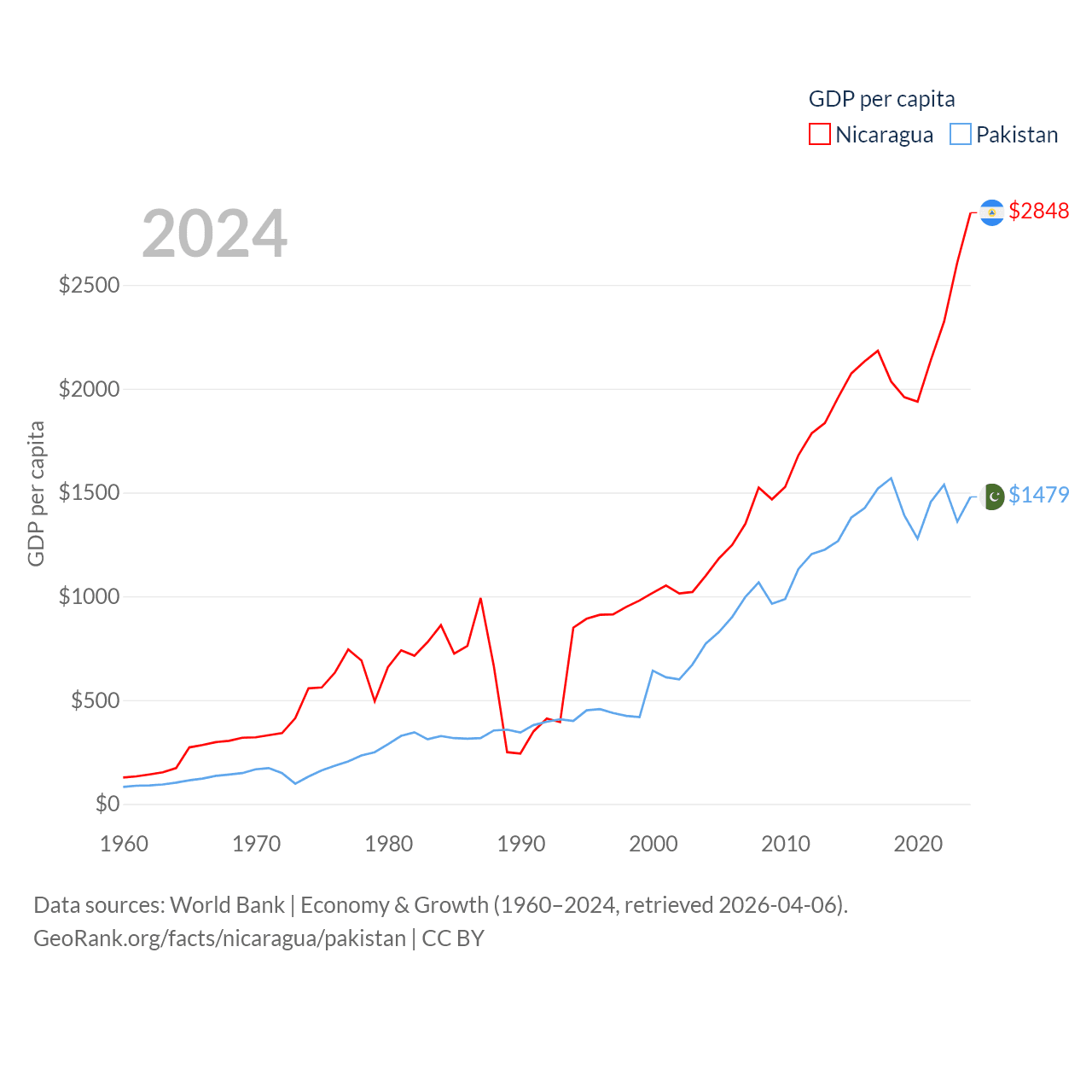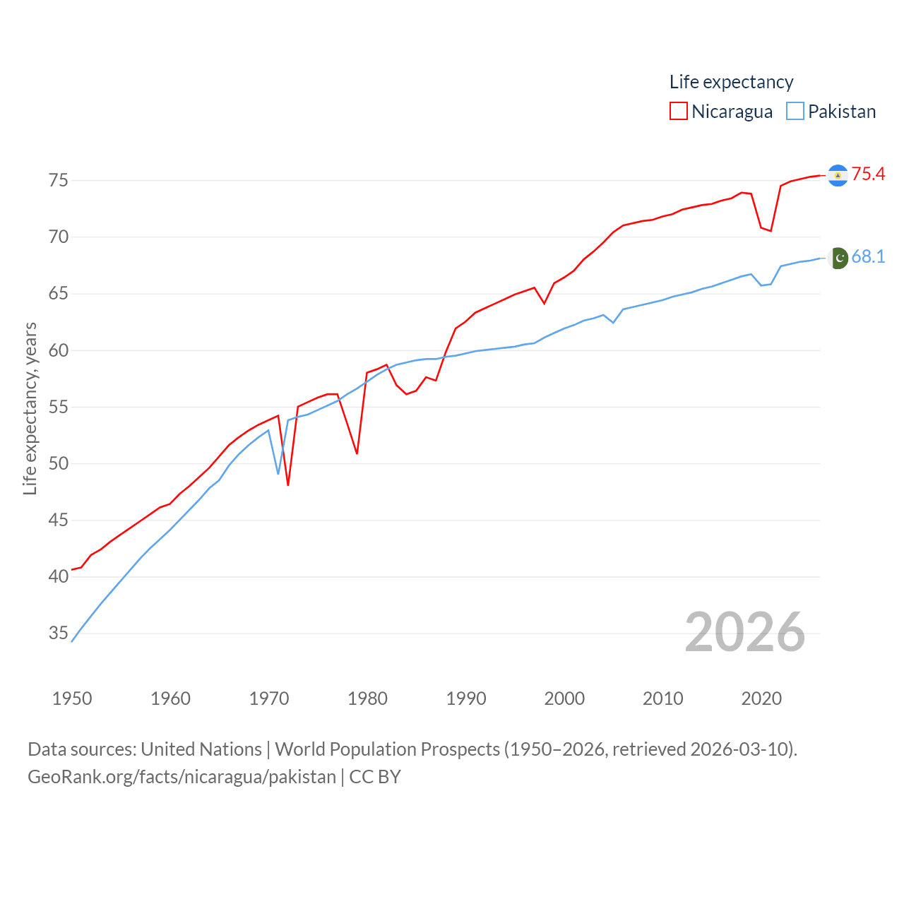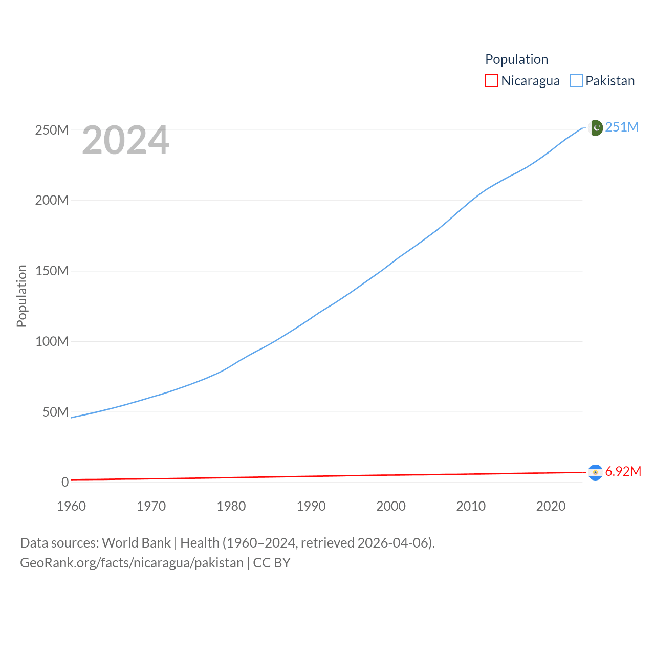 Nicaragua has a population of 6.92M (ranked 108/197), compared with 251M in Pakistan (ranked 5/197). Nicaragua's land area is 46,464 sq mi versus 297,638 sq mi for Pakistan (ranked 98th vs. 35th).