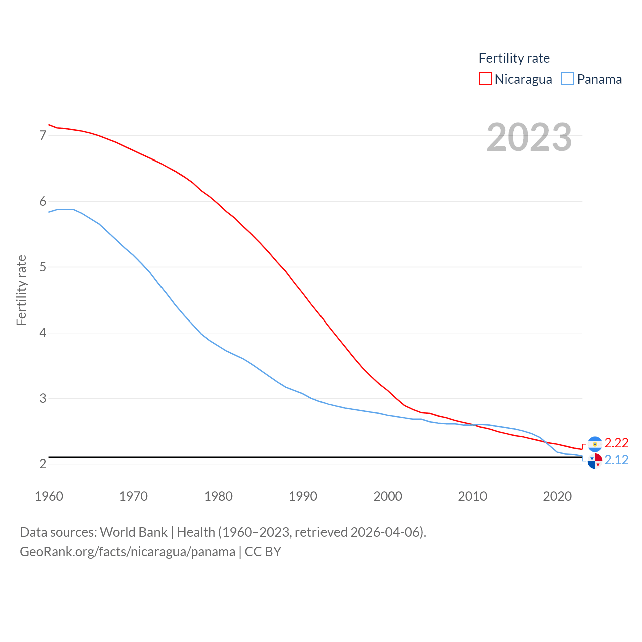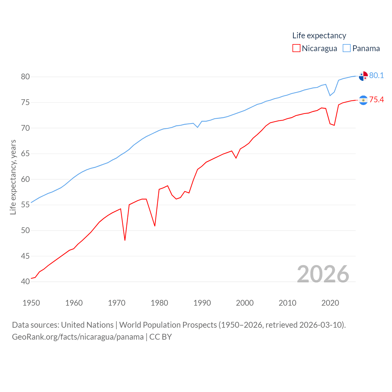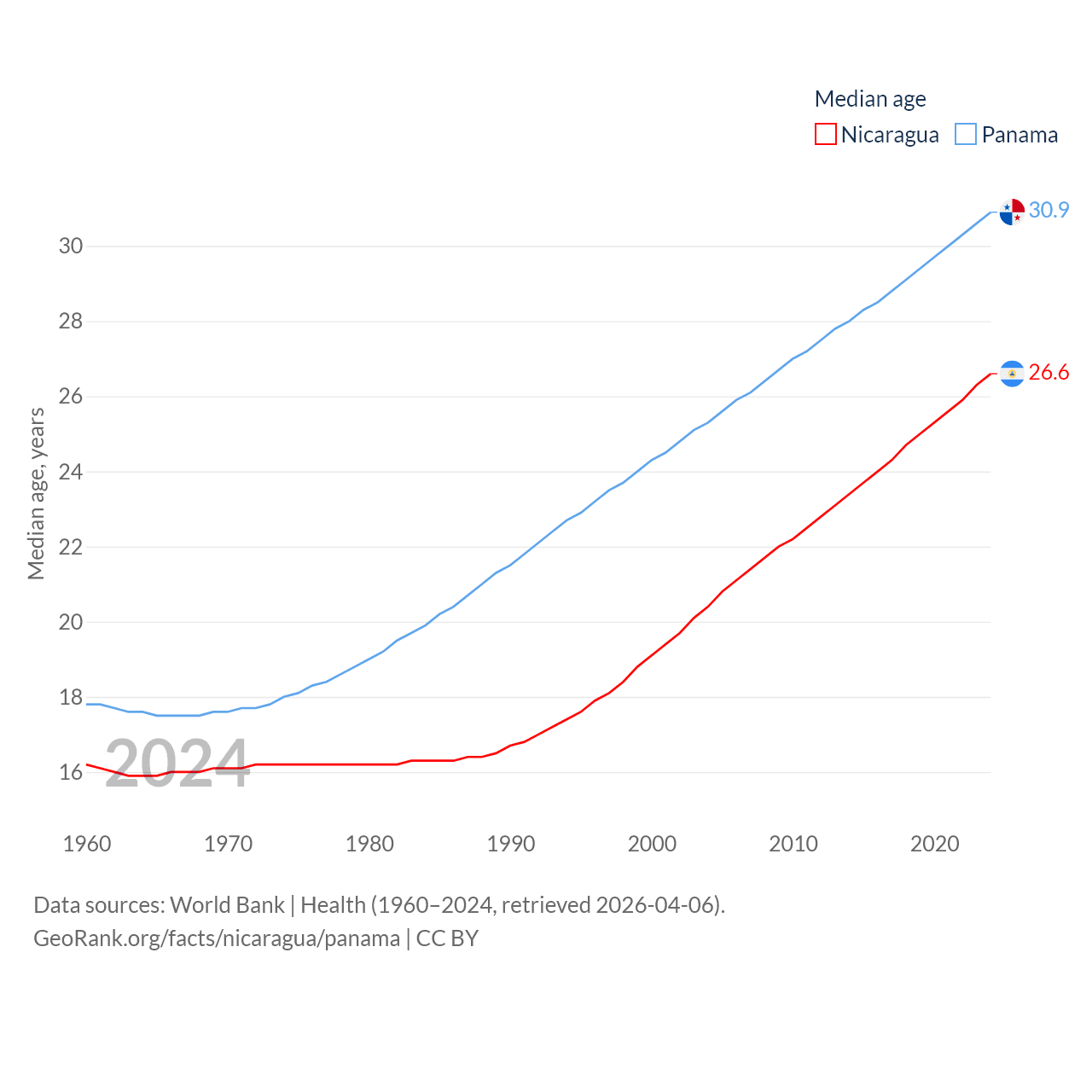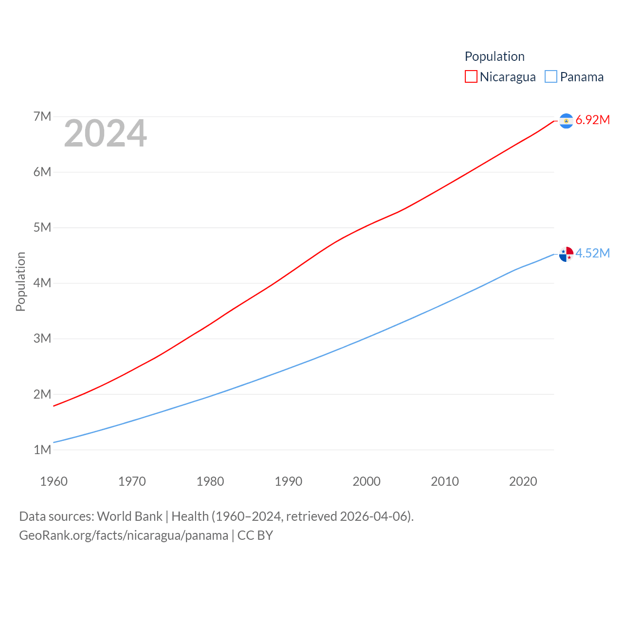 Nicaragua has a population of 6.92M (ranked 108/197), compared with 4.52M in Panama (ranked 128/197). Nicaragua's land area is 46,464 sq mi versus 28,641 sq mi for Panama (ranked 98th vs. 115th).