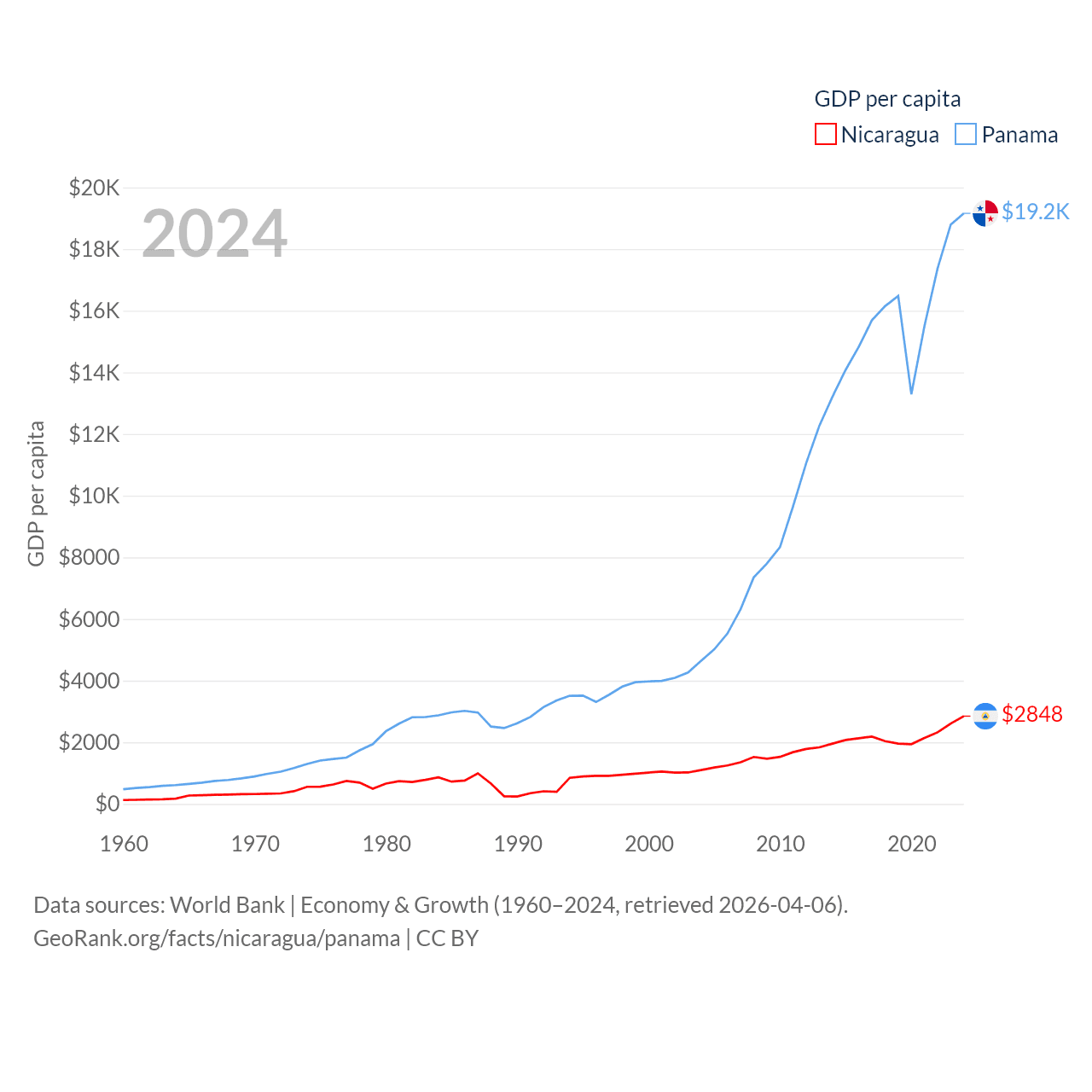 By GDP, Nicaragua ranks 131/197 ($19.7B) and Panama ranks 78/197 ($86.5B). By GDP per capita, Nicaragua ranks 141/197 ($2,848), while Panama ranks 60/197 ($19,161).