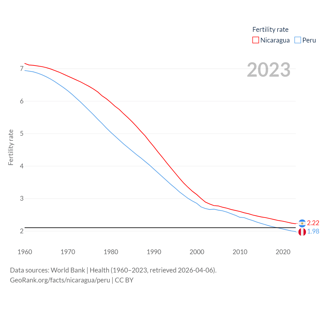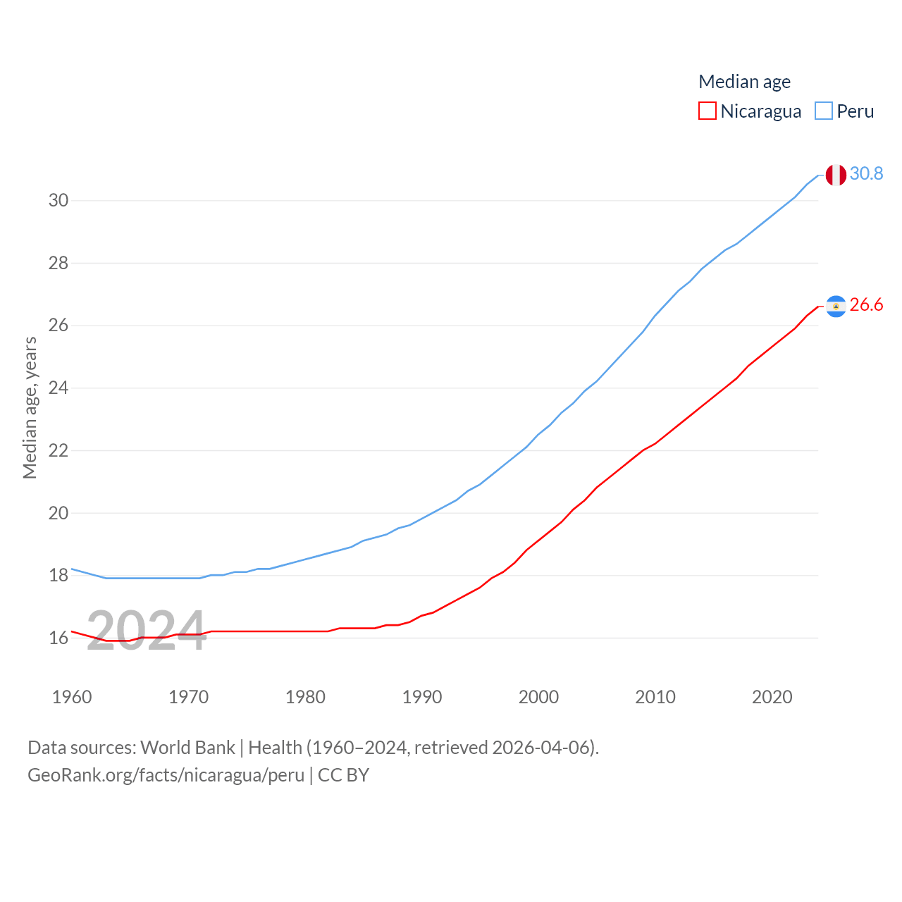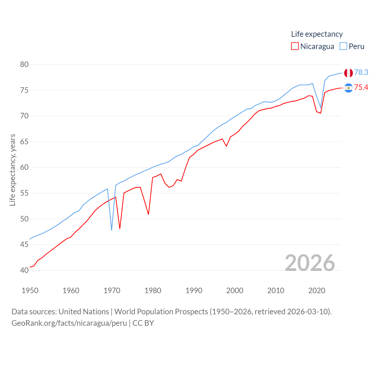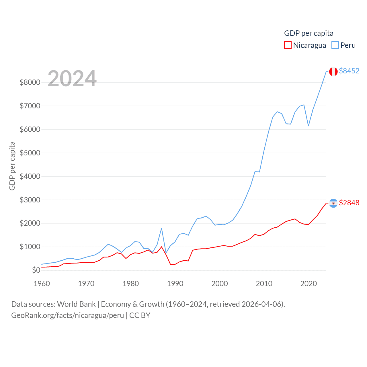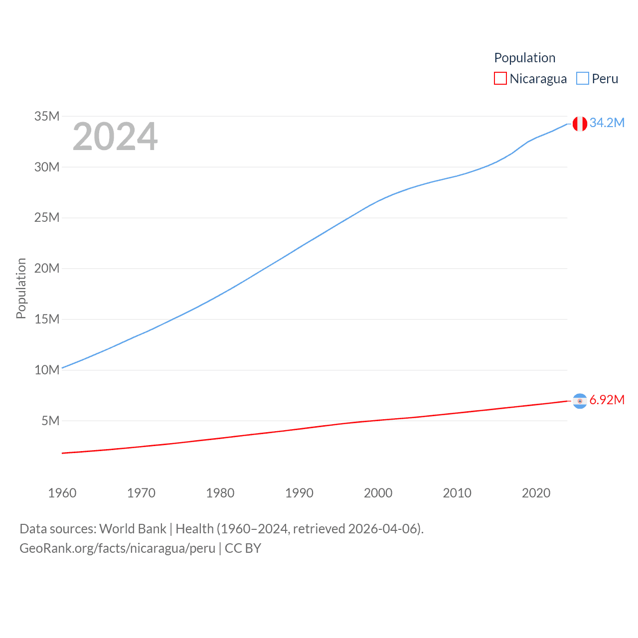 Nicaragua has a population of 6.92M (ranked 108/197), compared with 34.2M in Peru (ranked 48/197). Nicaragua's land area is 46,464 sq mi versus 494,211 sq mi for Peru (ranked 98th vs. 19th).