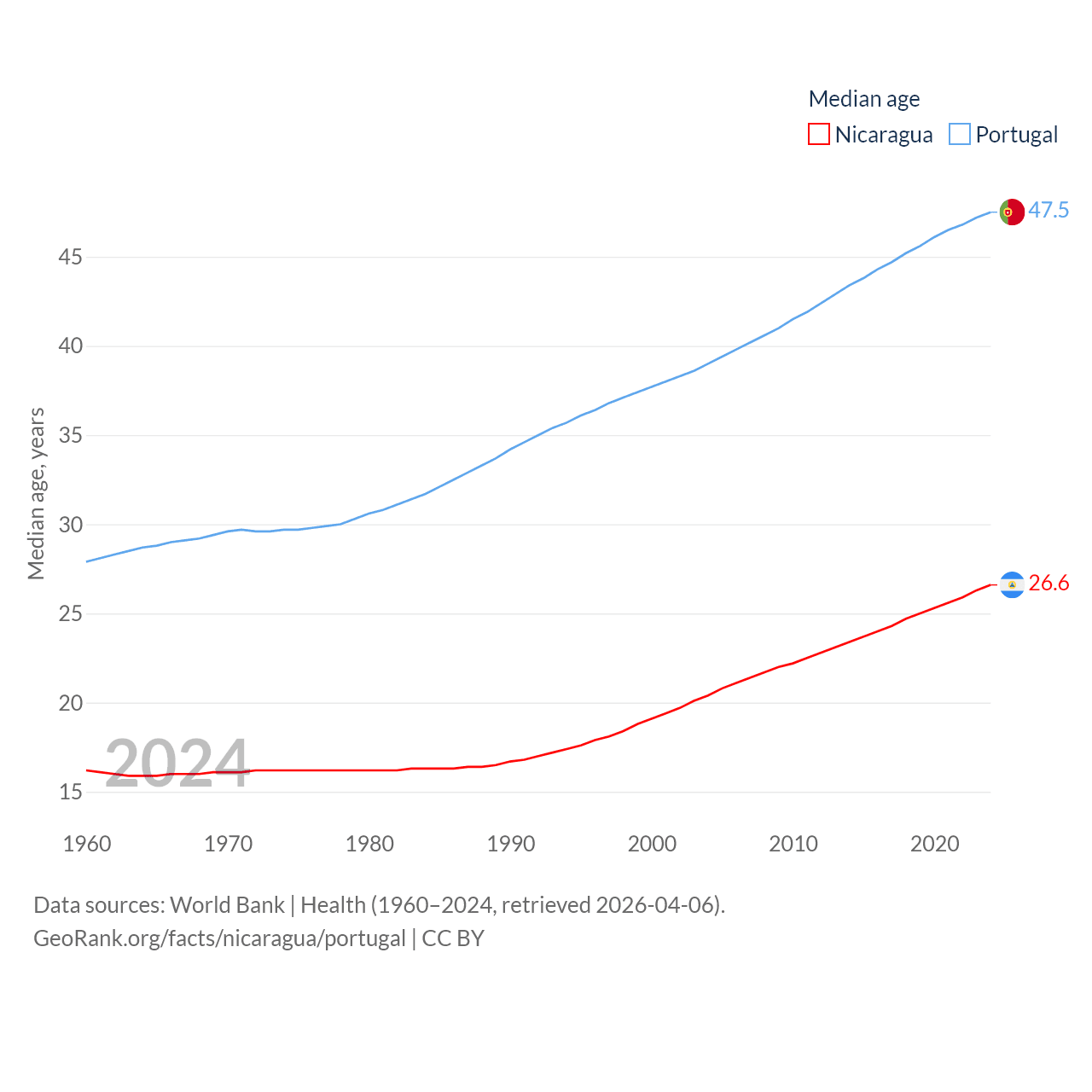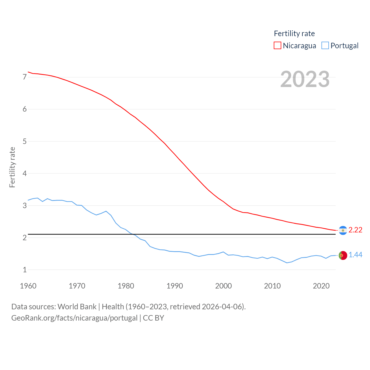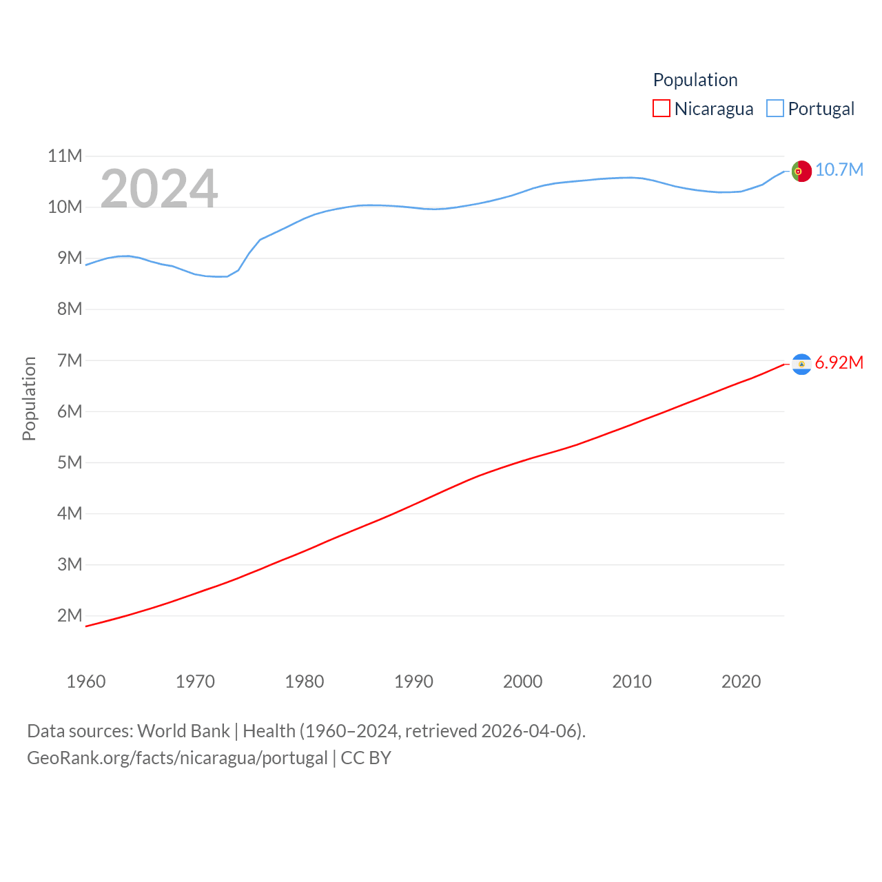 Nicaragua has a population of 6.92M (ranked 108/197), compared with 10.7M in Portugal (ranked 90/197). Nicaragua's land area is 46,464 sq mi versus 35,369 sq mi for Portugal (ranked 98th vs. 108th).