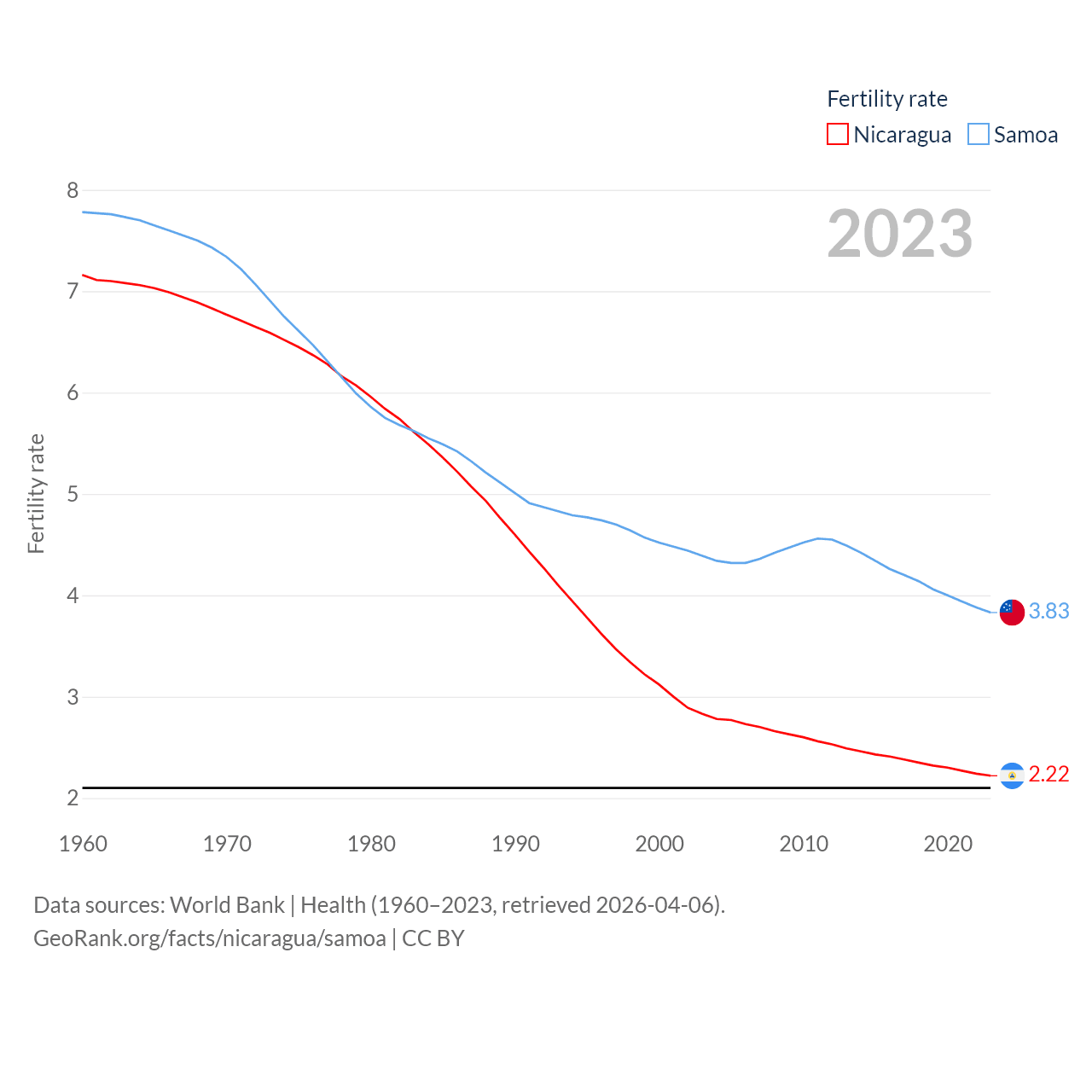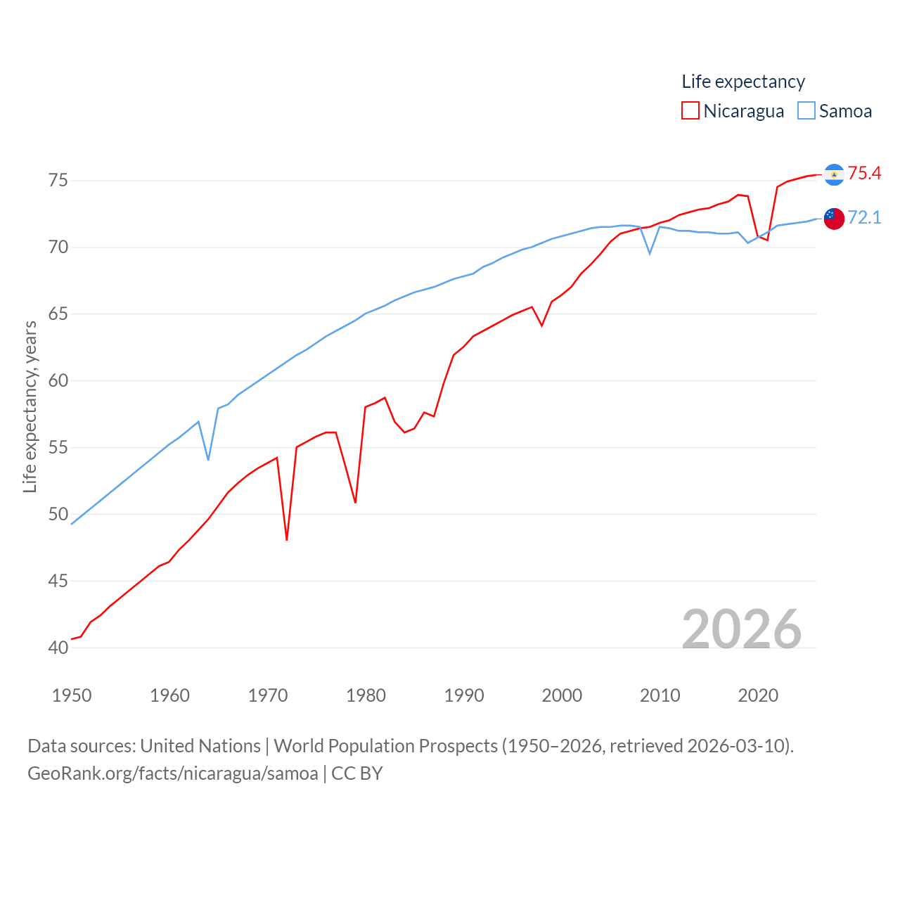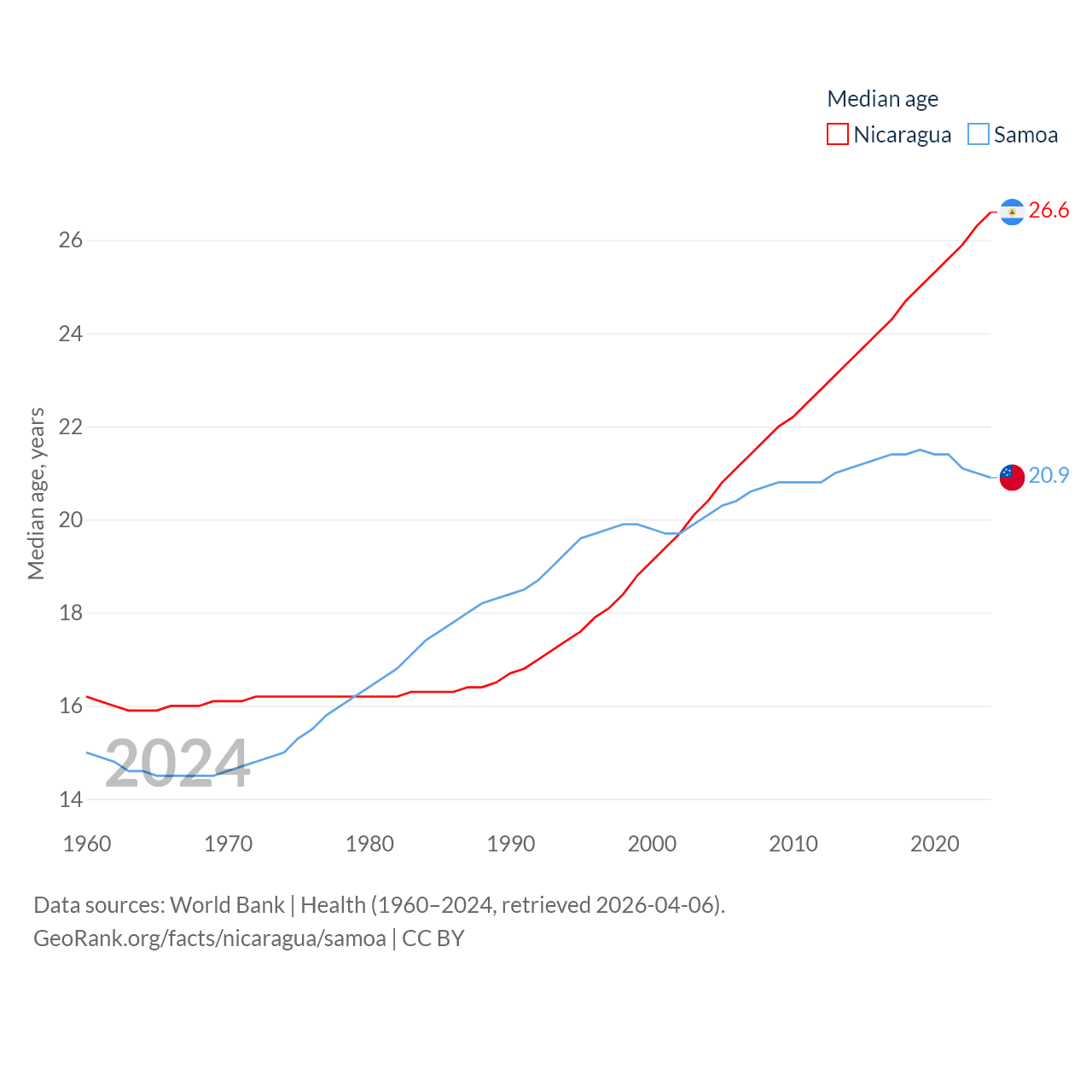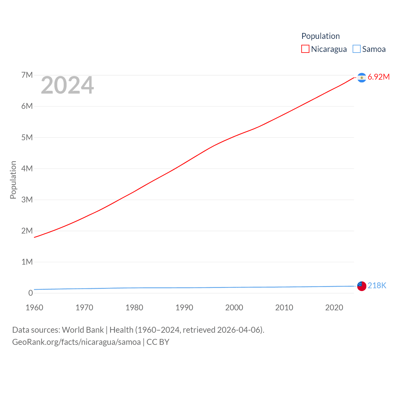 Nicaragua has a population of 6.92M (ranked 108/197), compared with 218K in Samoa (ranked 177/197). Nicaragua's land area is 46,464 sq mi versus 1,073 sq mi for Samoa (ranked 98th vs. 168th).