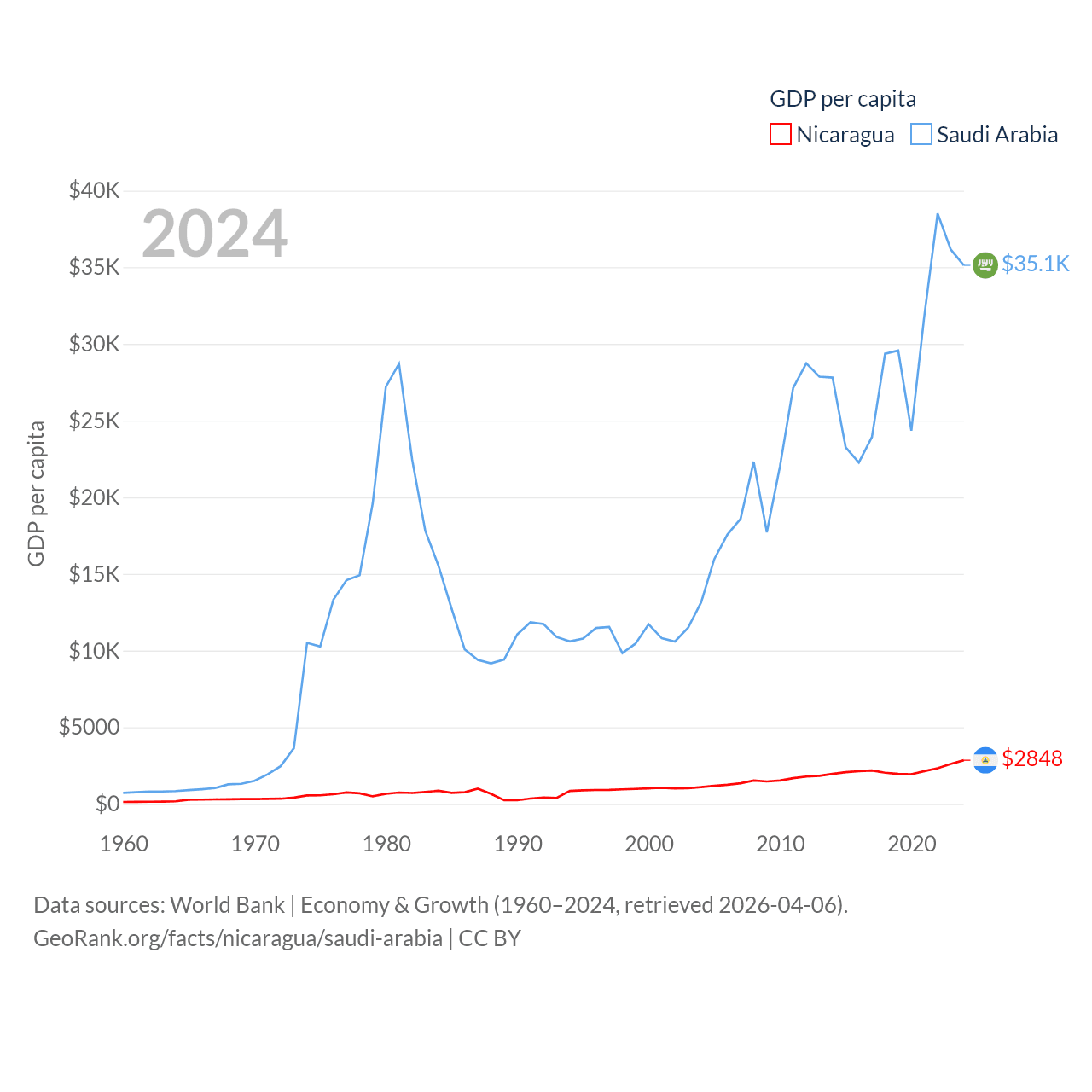 By GDP, Nicaragua ranks 131/197 ($19.7B) and Saudi Arabia ranks 18/197 ($1.24T). By GDP per capita, Nicaragua ranks 141/197 ($2,848), while Saudi Arabia ranks 33/197 ($35,122).