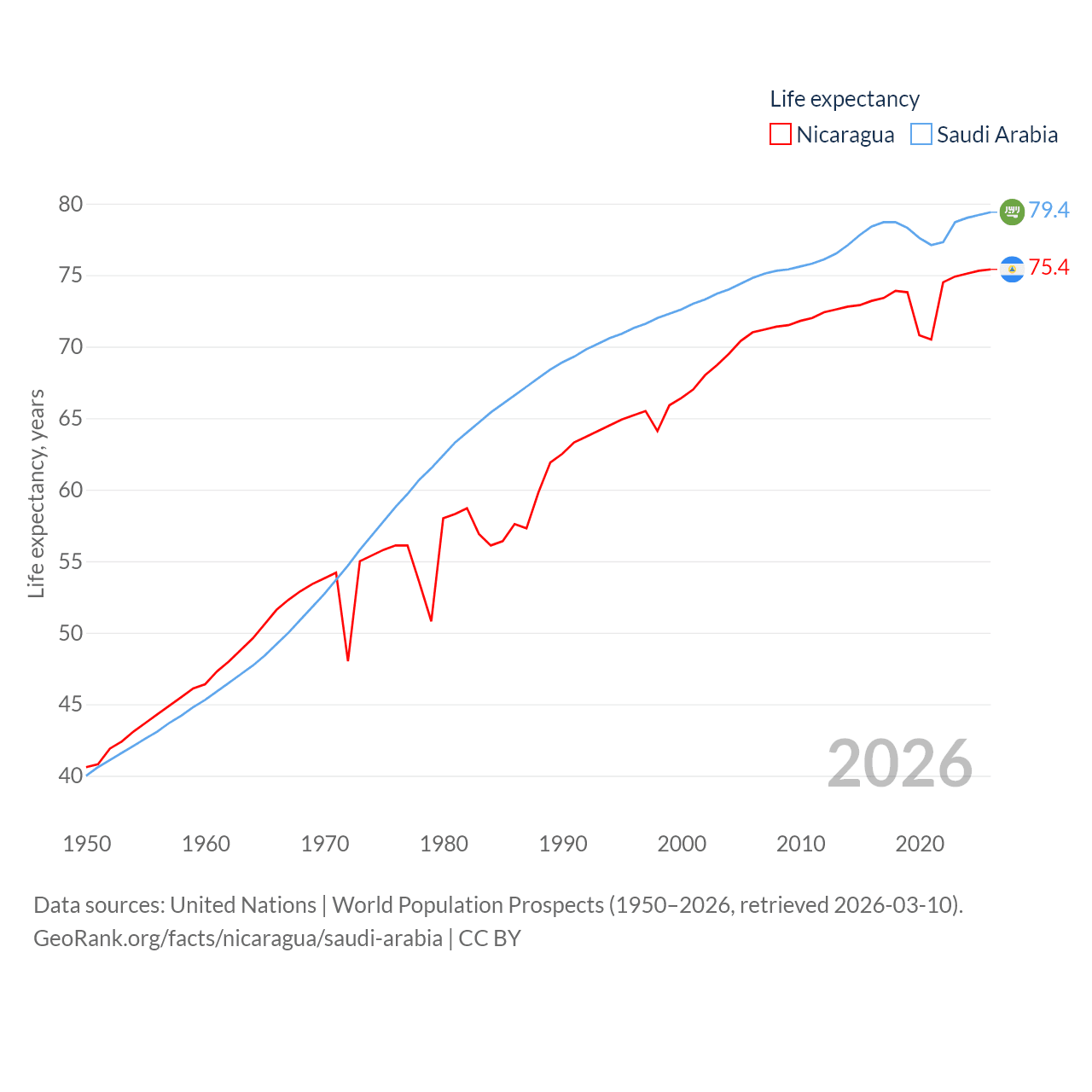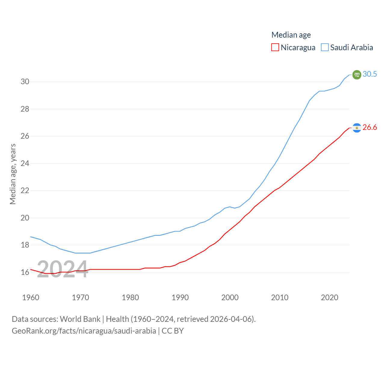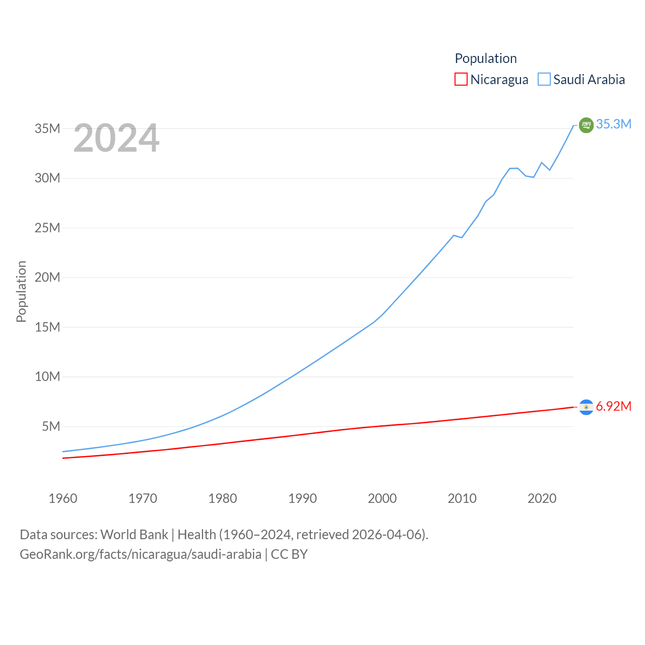 Nicaragua has a population of 6.92M (ranked 108/197), compared with 35.3M in Saudi Arabia (ranked 45/197). Nicaragua's land area is 46,464 sq mi versus 830,000 sq mi for Saudi Arabia (ranked 98th vs. 12th).