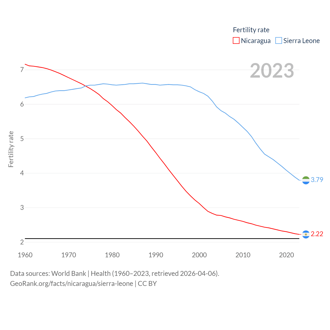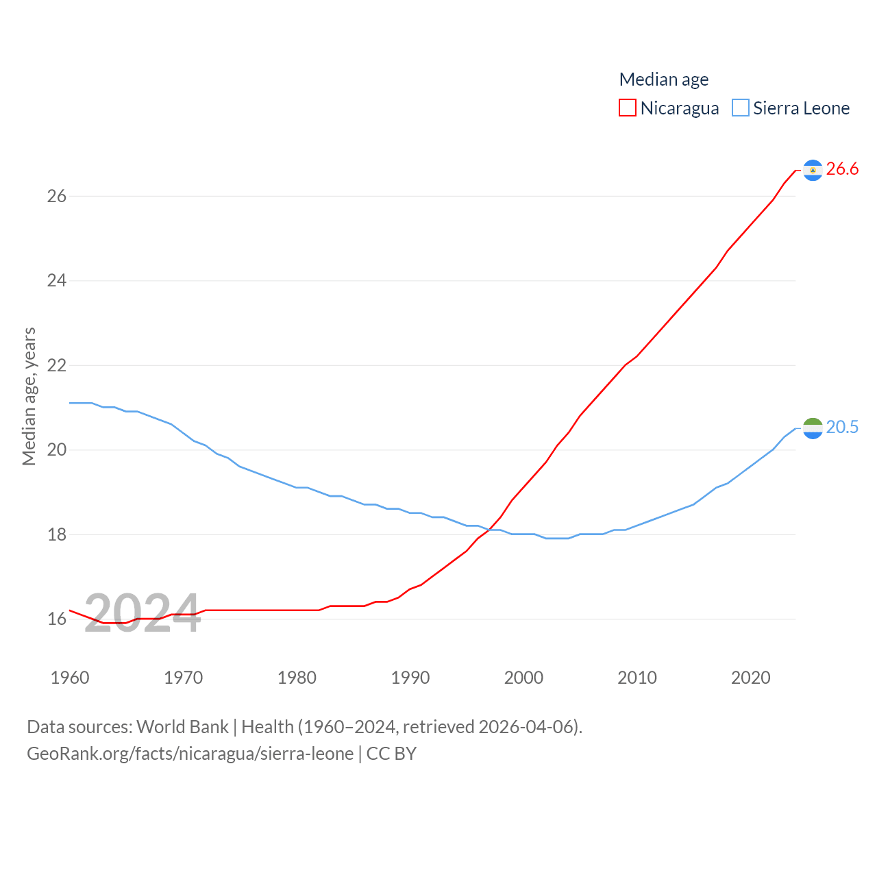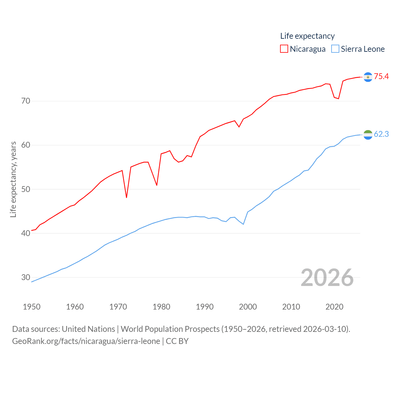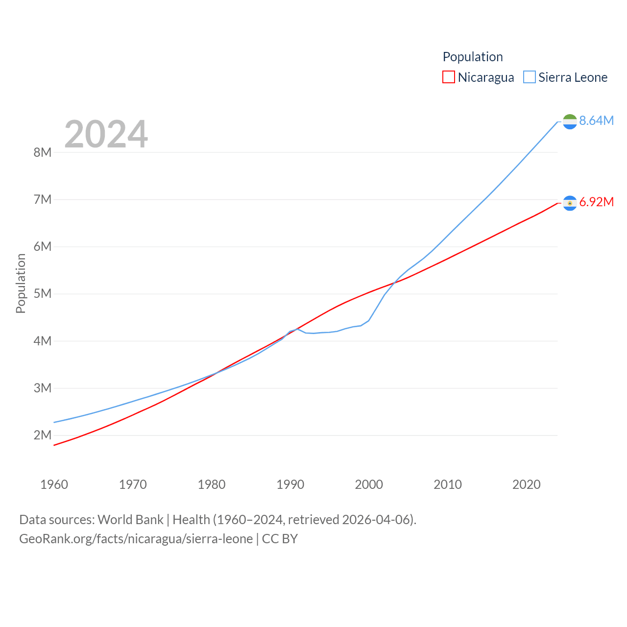 Nicaragua has a population of 6.92M (ranked 108/197), compared with 8.64M in Sierra Leone (ranked 102/197). Nicaragua's land area is 46,464 sq mi versus 27,869 sq mi for Sierra Leone (ranked 98th vs. 116th).