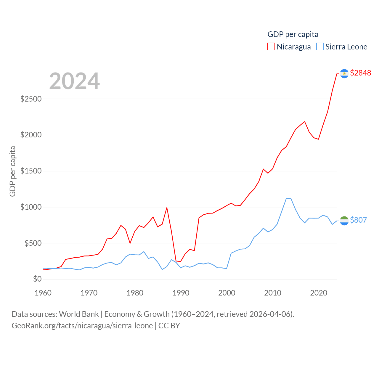 By GDP, Nicaragua ranks 131/197 ($19.7B) and Sierra Leone ranks 160/197 ($6.97B). By GDP per capita, Nicaragua ranks 141/197 ($2,848), while Sierra Leone ranks 186/197 ($807).