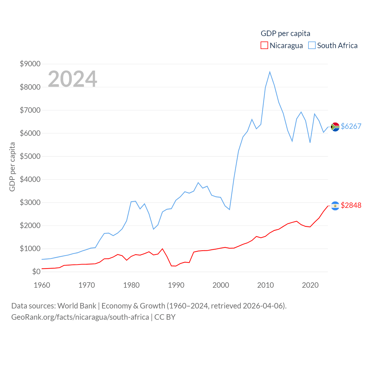 By GDP, Nicaragua ranks 131/197 ($19.7B) and South Africa ranks 40/197 ($401B). By GDP per capita, Nicaragua ranks 141/197 ($2,848), while South Africa ranks 111/197 ($6,267).