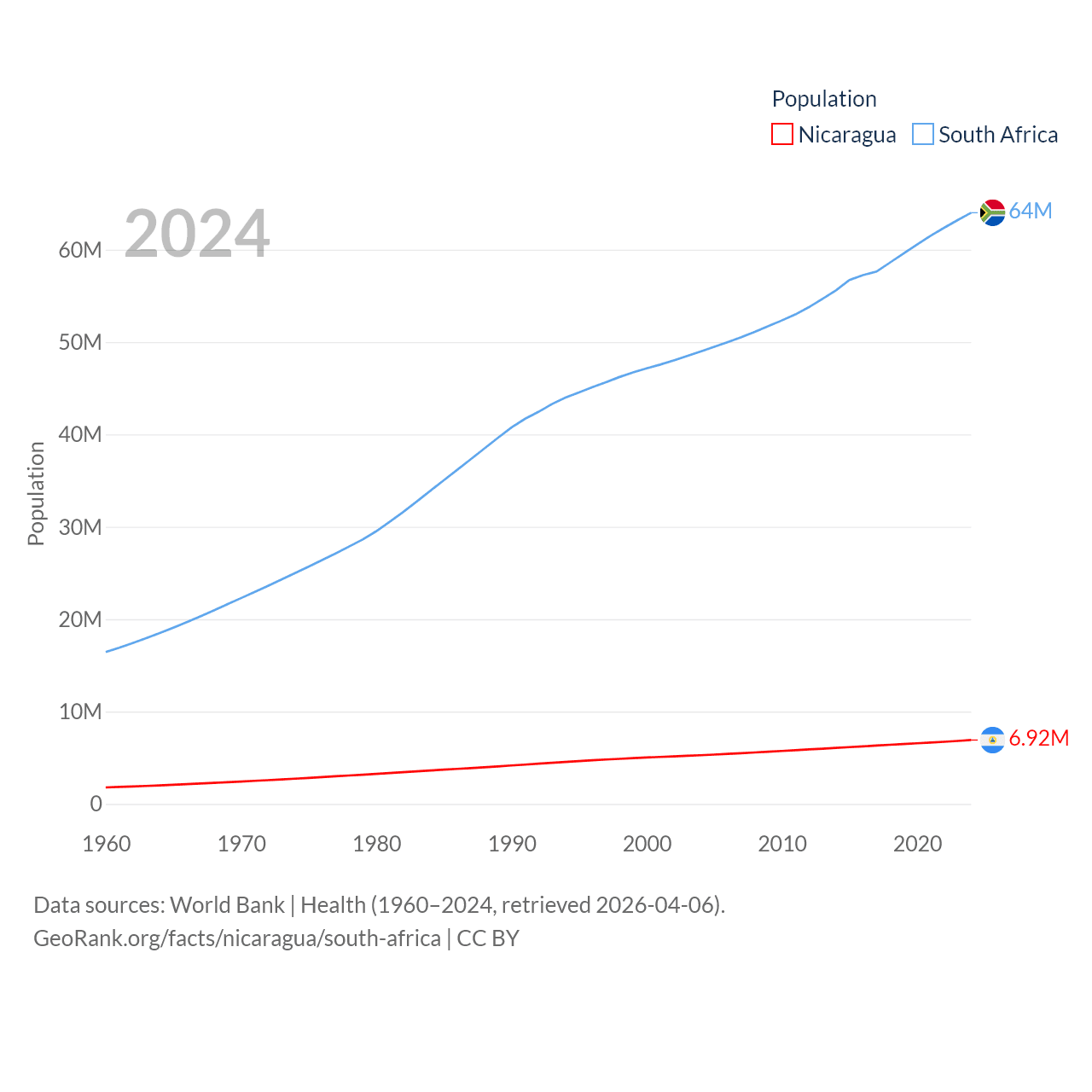 Nicaragua has a population of 6.92M (ranked 108/197), compared with 64M in South Africa (ranked 24/197). Nicaragua's land area is 46,464 sq mi versus 468,377 sq mi for South Africa (ranked 98th vs. 24th).