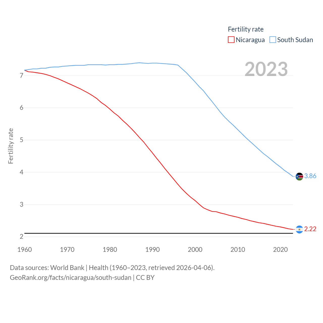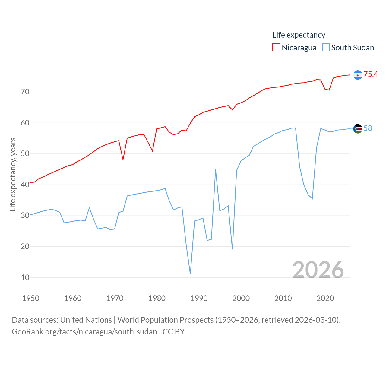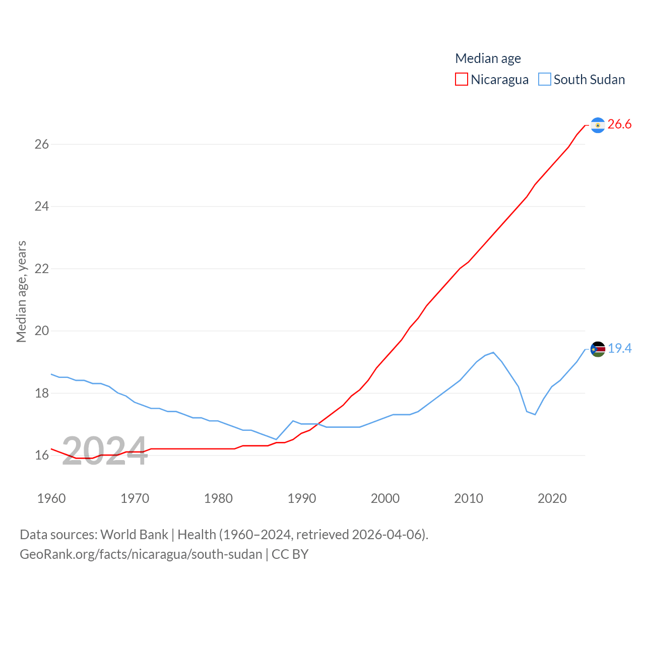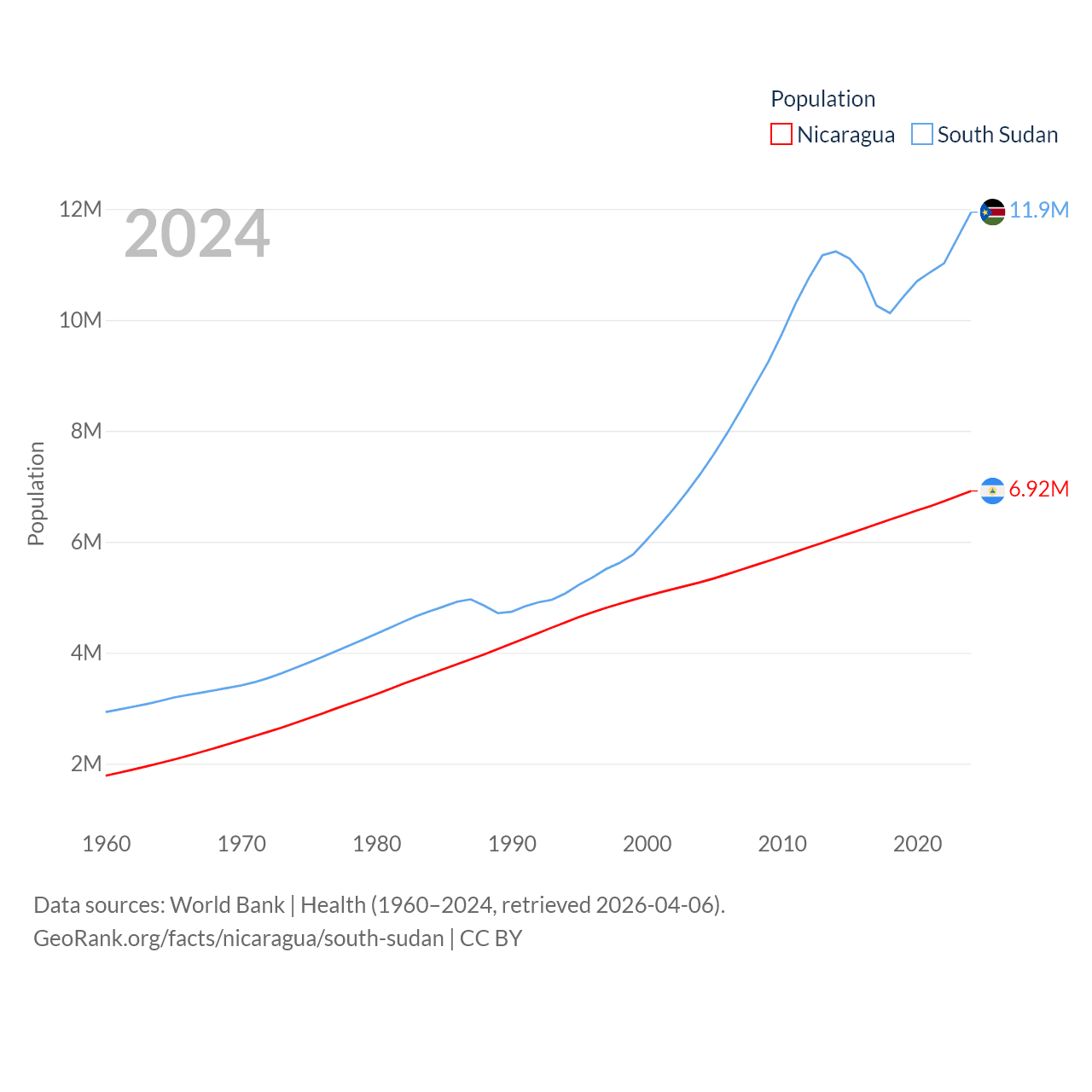 Nicaragua has a population of 6.92M (ranked 108/197), compared with 11.9M in South Sudan (ranked 81/197). Nicaragua's land area is 46,464 sq mi versus 243,990 sq mi for South Sudan (ranked 98th vs. 41st).