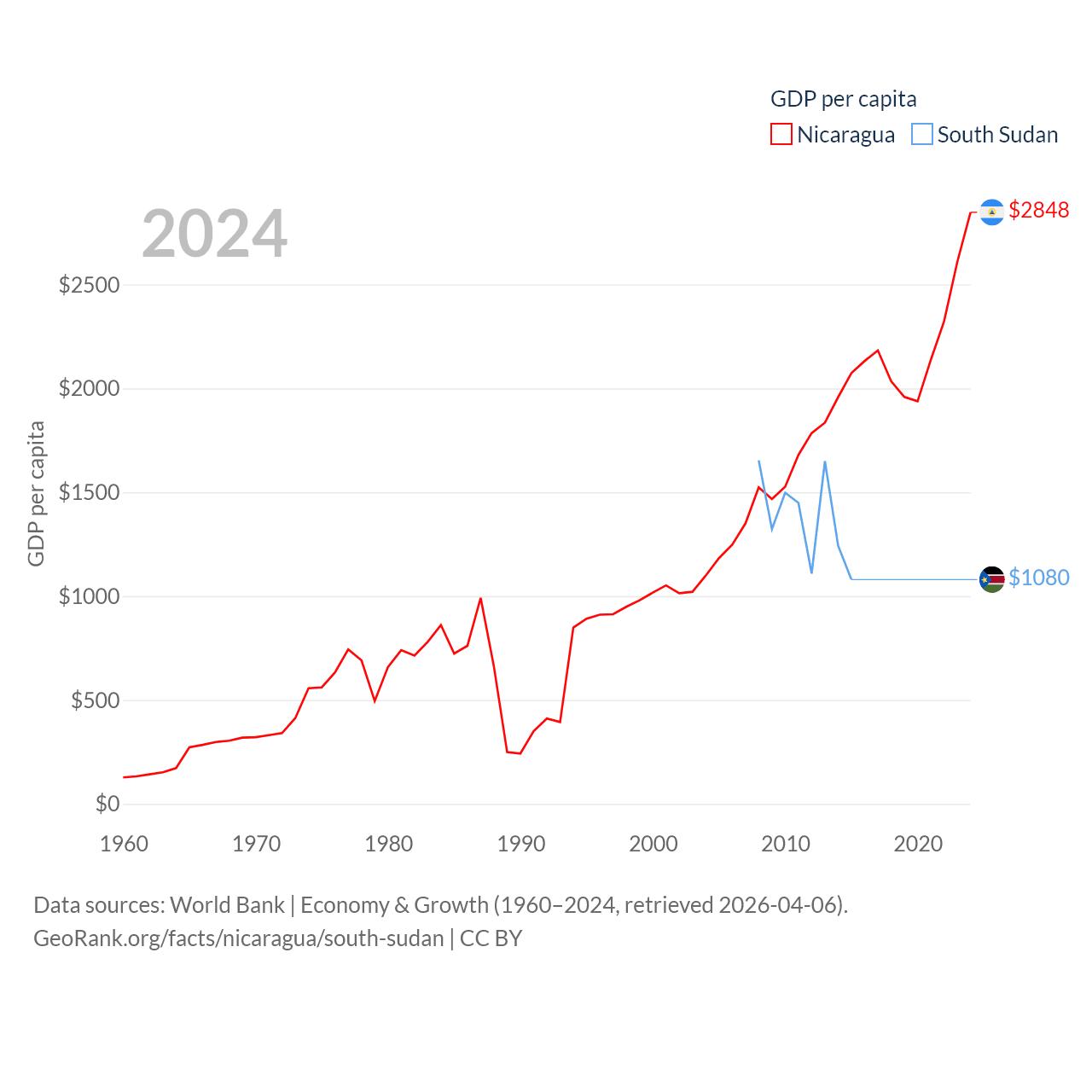 By GDP, Nicaragua ranks 131/197 ($19.7B) and South Sudan ranks 149/197 ($12B). By GDP per capita, Nicaragua ranks 141/197 ($2,848), while South Sudan ranks 175/197 ($1,080).