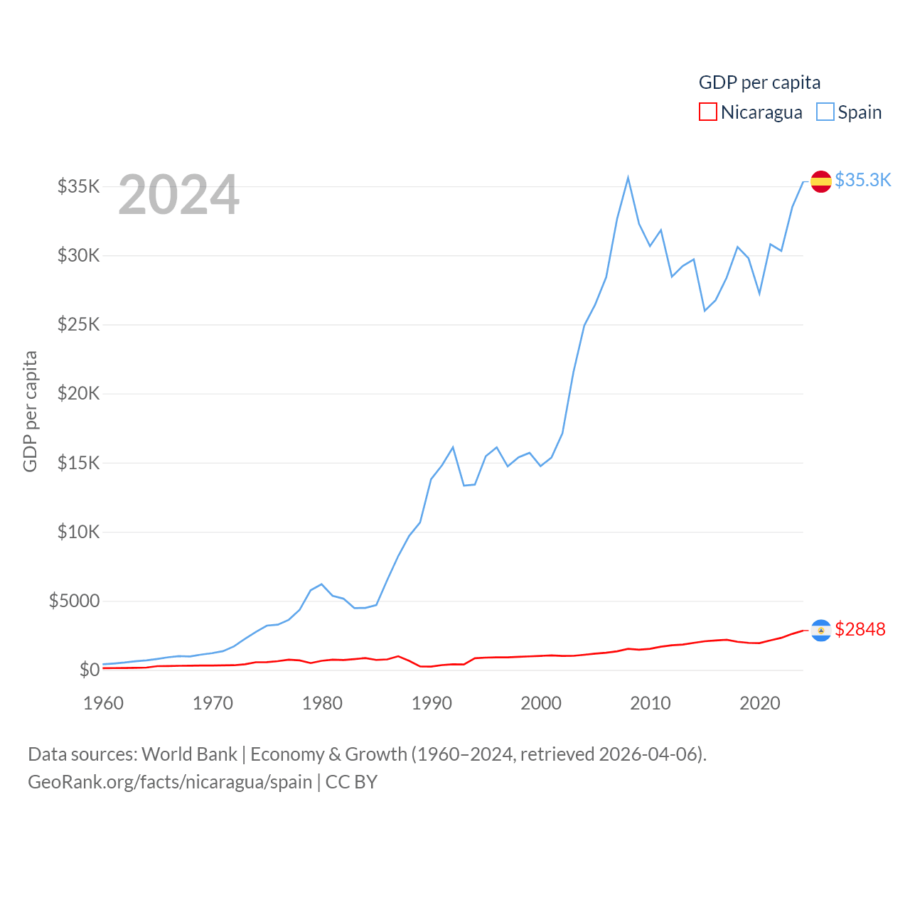 By GDP, Nicaragua ranks 131/197 ($19.7B) and Spain ranks 15/197 ($1.73T). By GDP per capita, Nicaragua ranks 141/197 ($2,848), while Spain ranks 32/197 ($35,327).