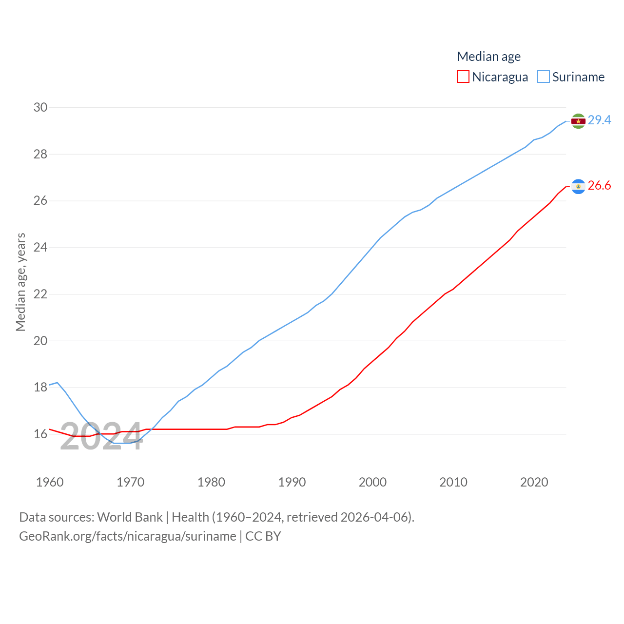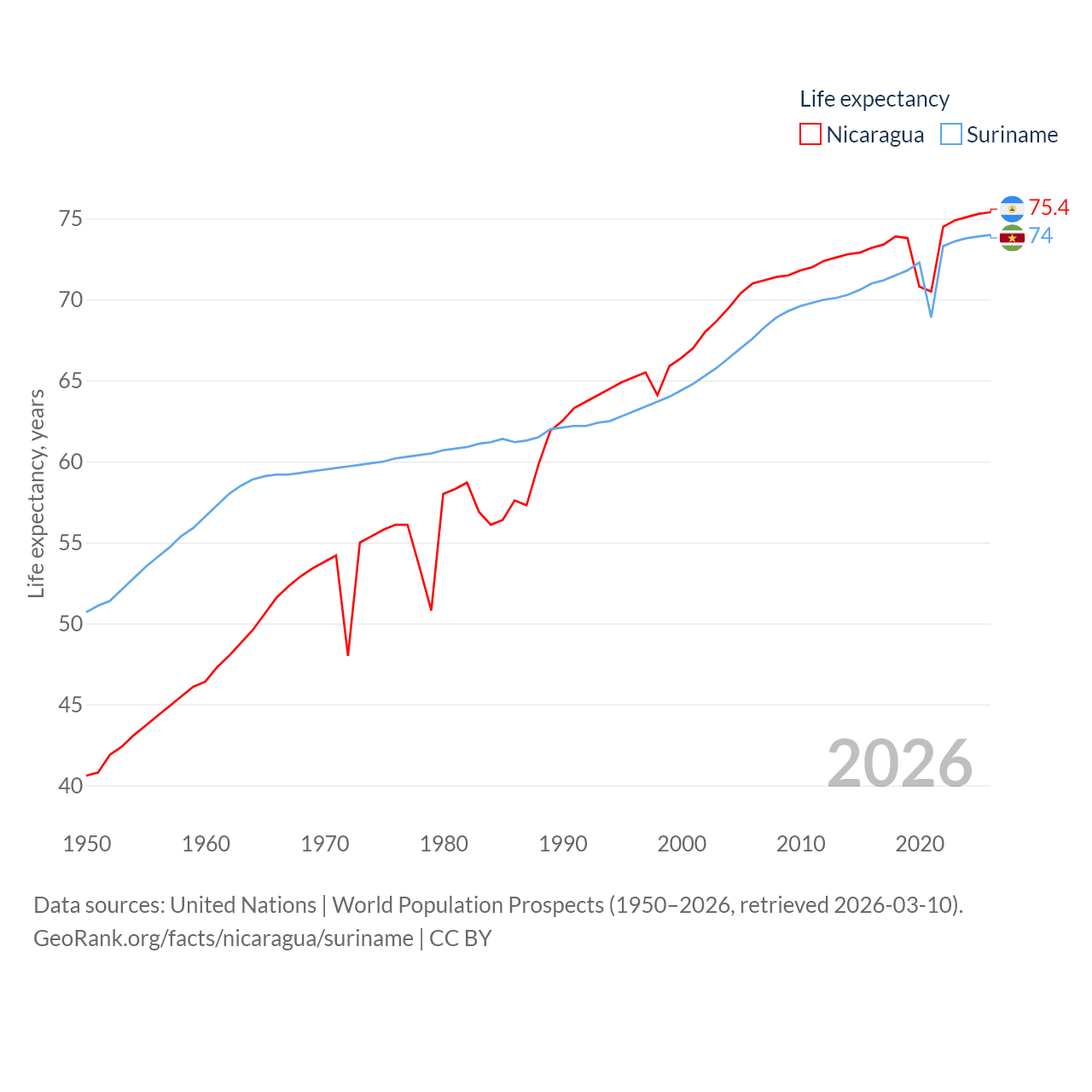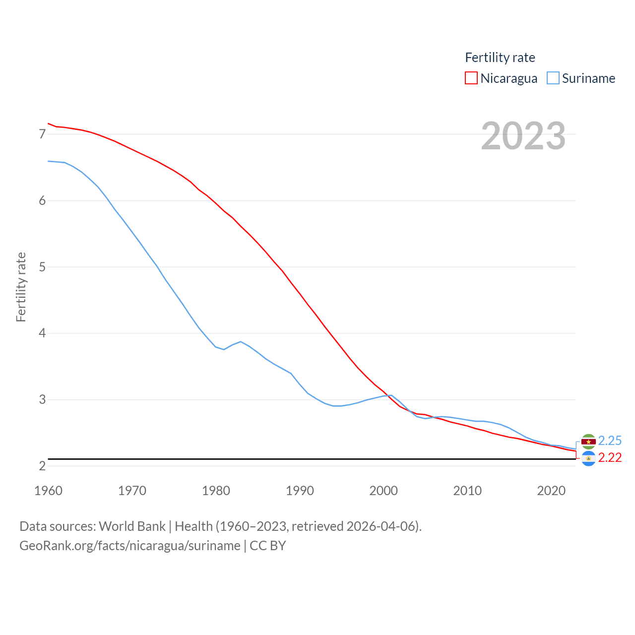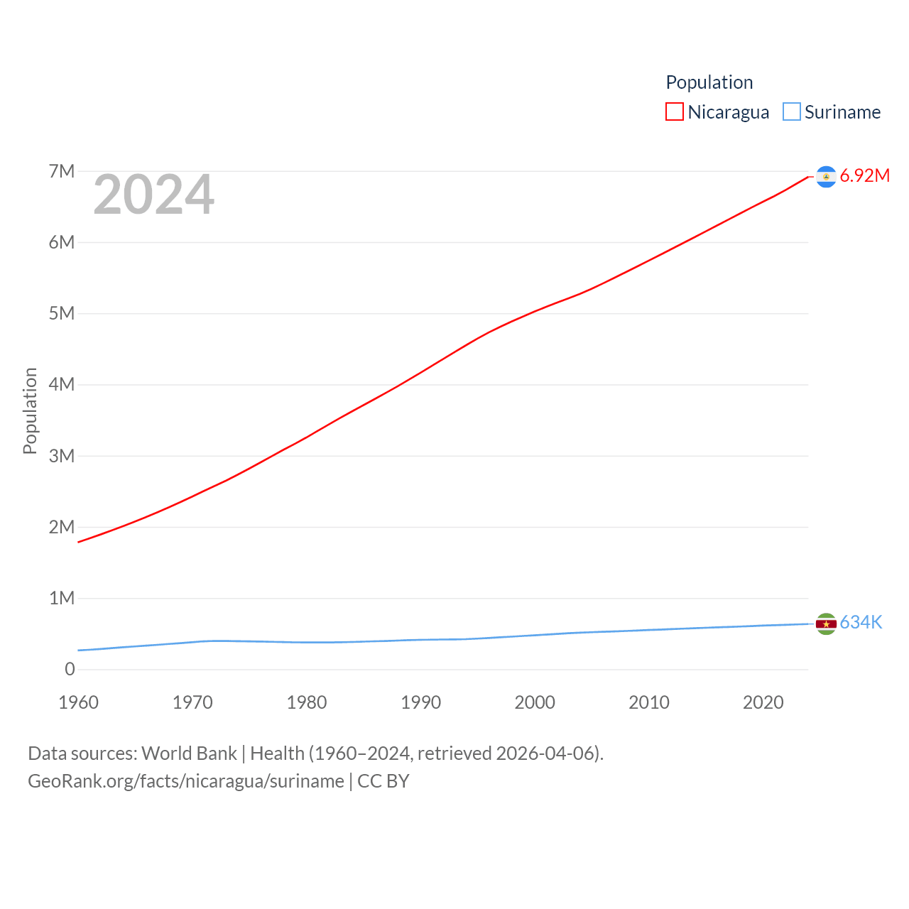 Nicaragua has a population of 6.92M (ranked 108/197), compared with 634K in Suriname (ranked 165/197). Nicaragua's land area is 46,464 sq mi versus 61,972 sq mi for Suriname (ranked 98th vs. 90th).