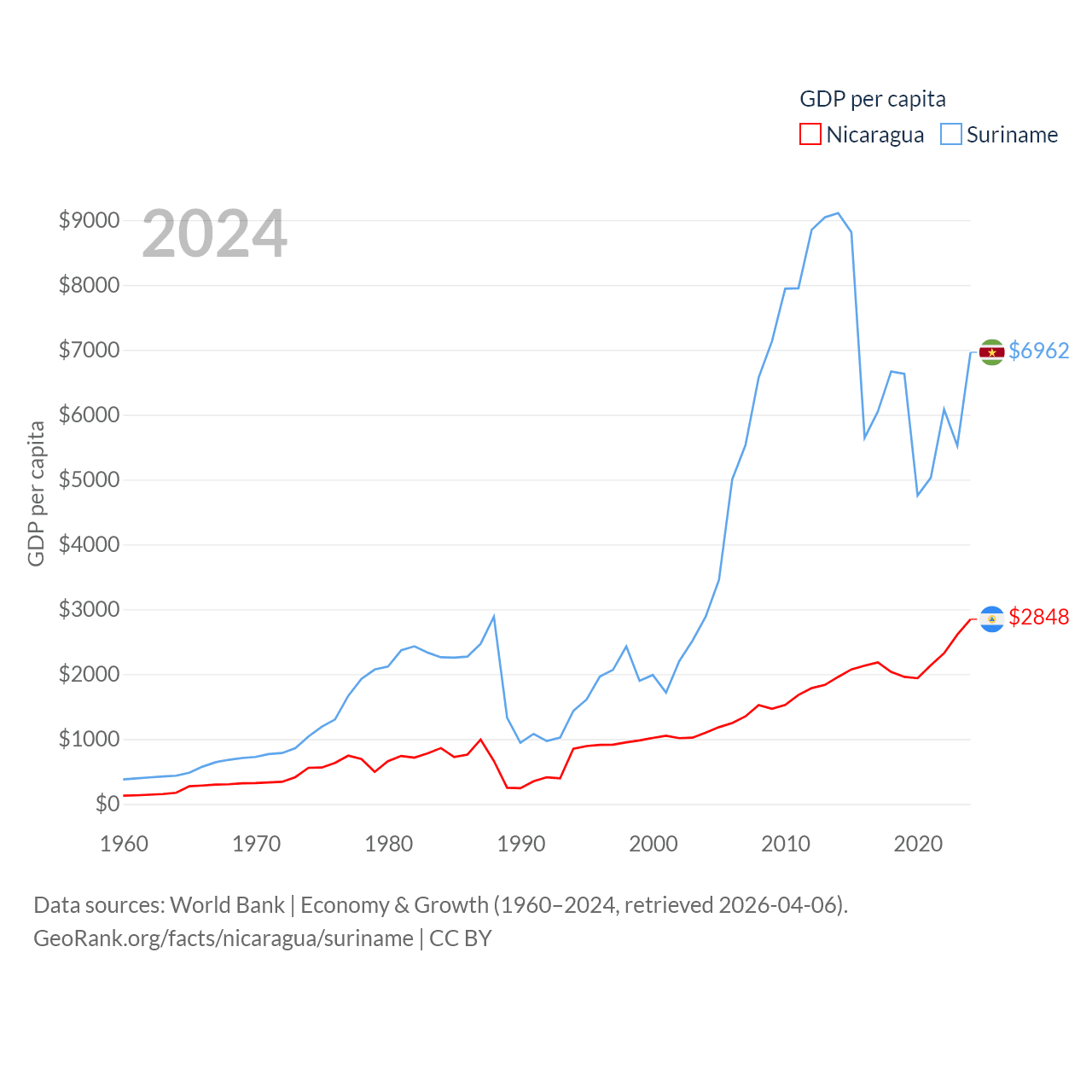 By GDP, Nicaragua ranks 131/197 ($19.7B) and Suriname ranks 164/197 ($4.42B). By GDP per capita, Nicaragua ranks 141/197 ($2,848), while Suriname ranks 102/197 ($6,962).