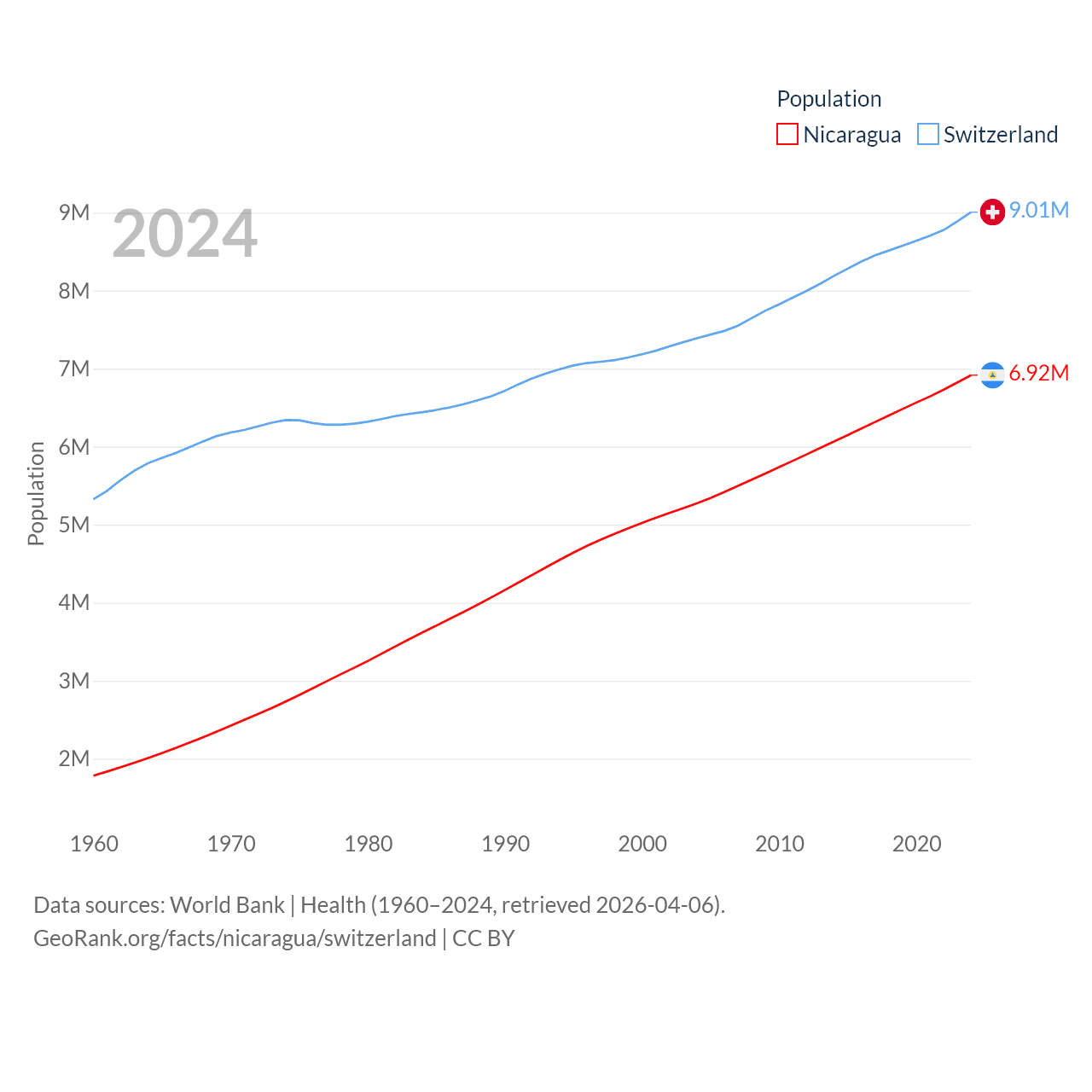 Nicaragua has a population of 6.92M (ranked 108/197), compared with 9.01M in Switzerland (ranked 101/197). Nicaragua's land area is 46,464 sq mi versus 15,255 sq mi for Switzerland (ranked 98th vs. 131st).