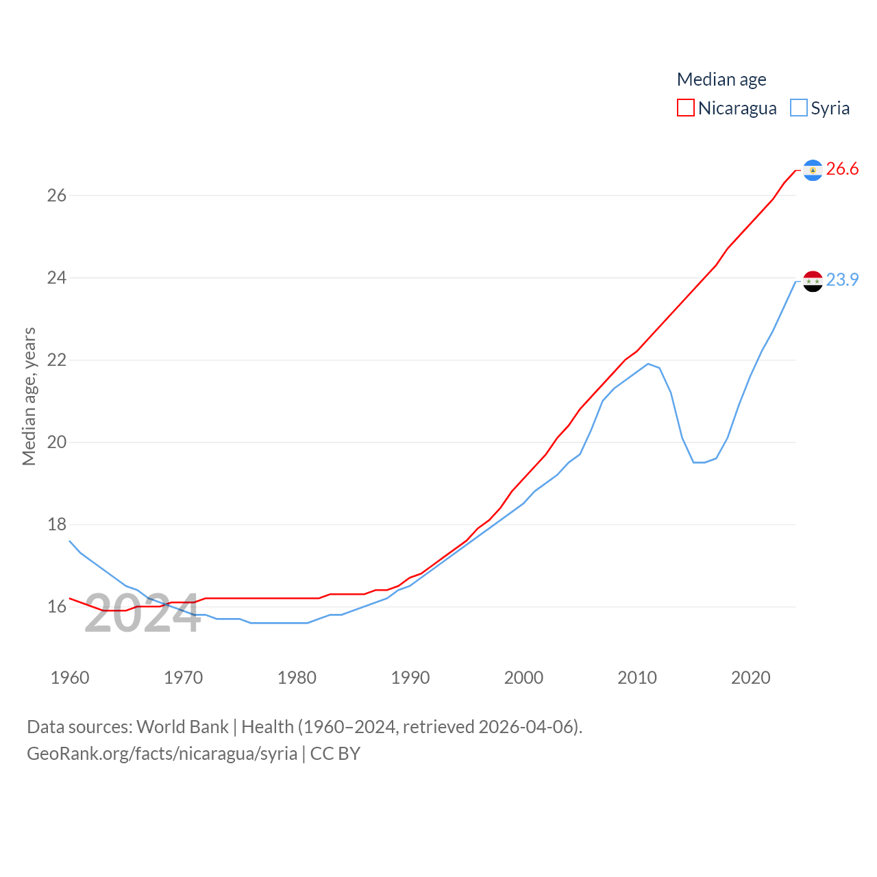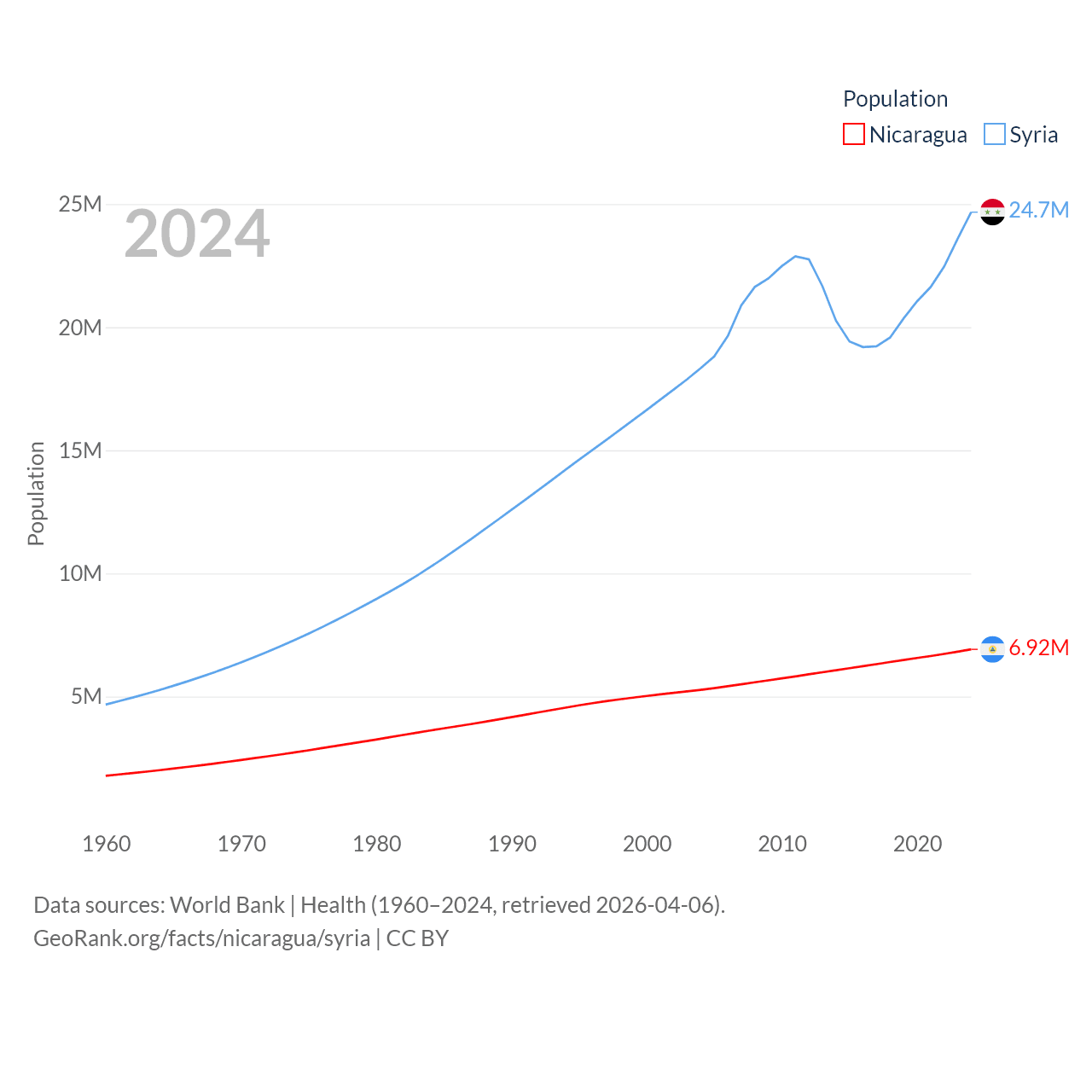 Nicaragua has a population of 6.92M (ranked 108/197), compared with 24.7M in Syria (ranked 57/197). Nicaragua's land area is 46,464 sq mi versus 70,900 sq mi for Syria (ranked 98th vs. 87th).