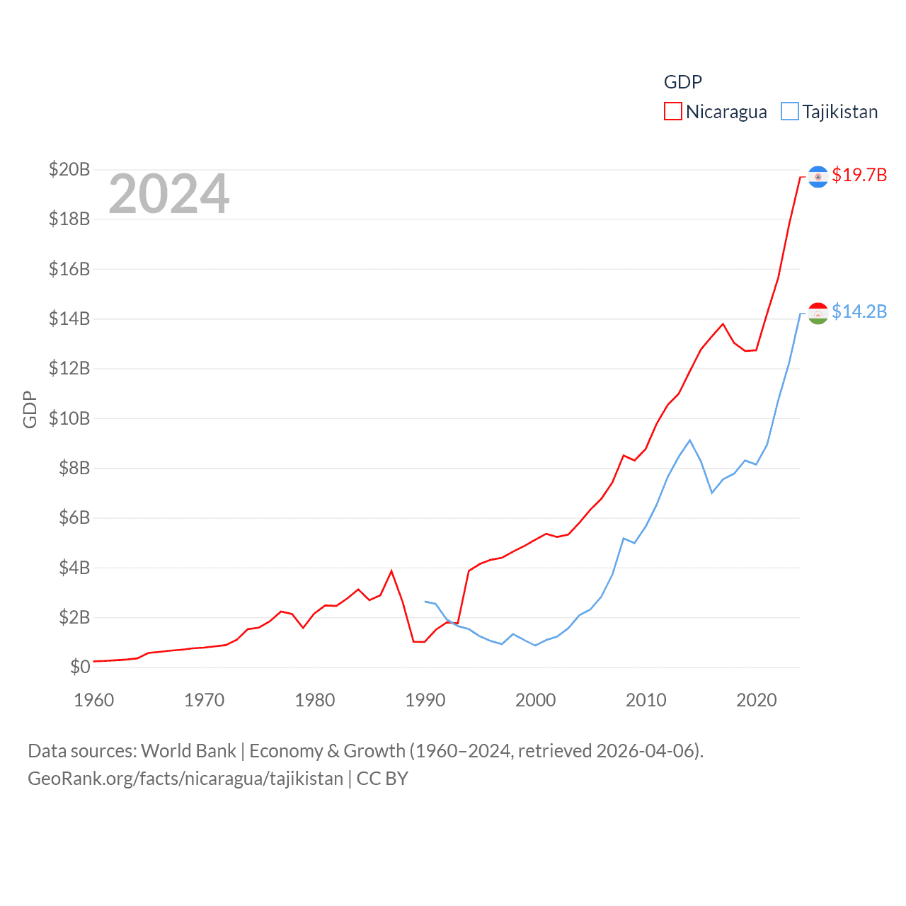 By GDP, Nicaragua ranks 131/197 ($19.7B) and Tajikistan ranks 145/197 ($14.2B). By GDP per capita, Nicaragua ranks 141/197 ($2,848), while Tajikistan ranks 166/197 ($1,341).