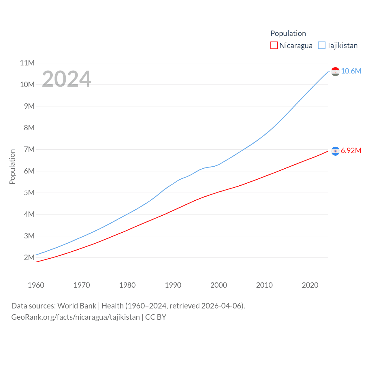 Nicaragua has a population of 6.92M (ranked 108/197), compared with 10.6M in Tajikistan (ranked 91/197). Nicaragua's land area is 46,464 sq mi versus 53,587 sq mi for Tajikistan (ranked 98th vs. 93rd).