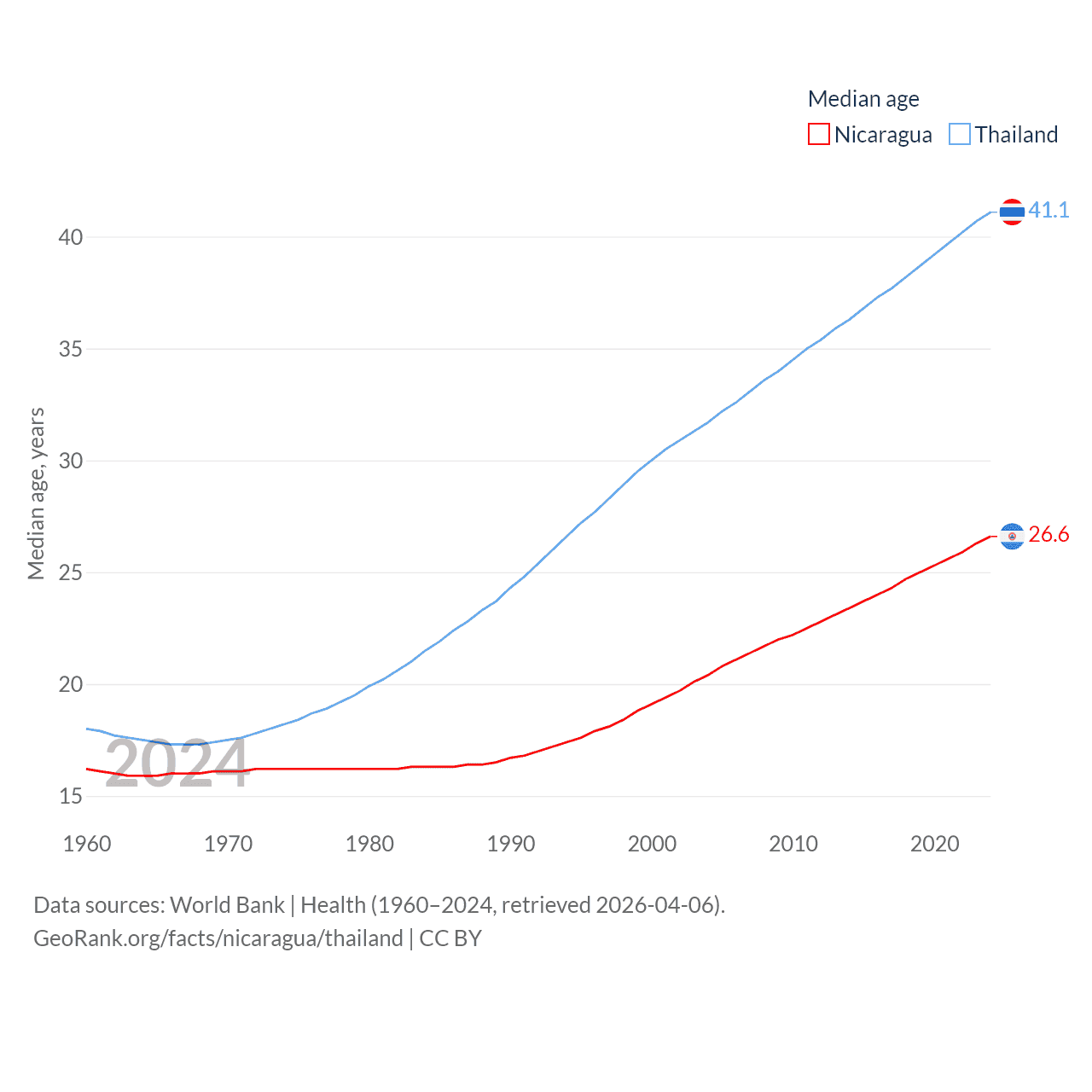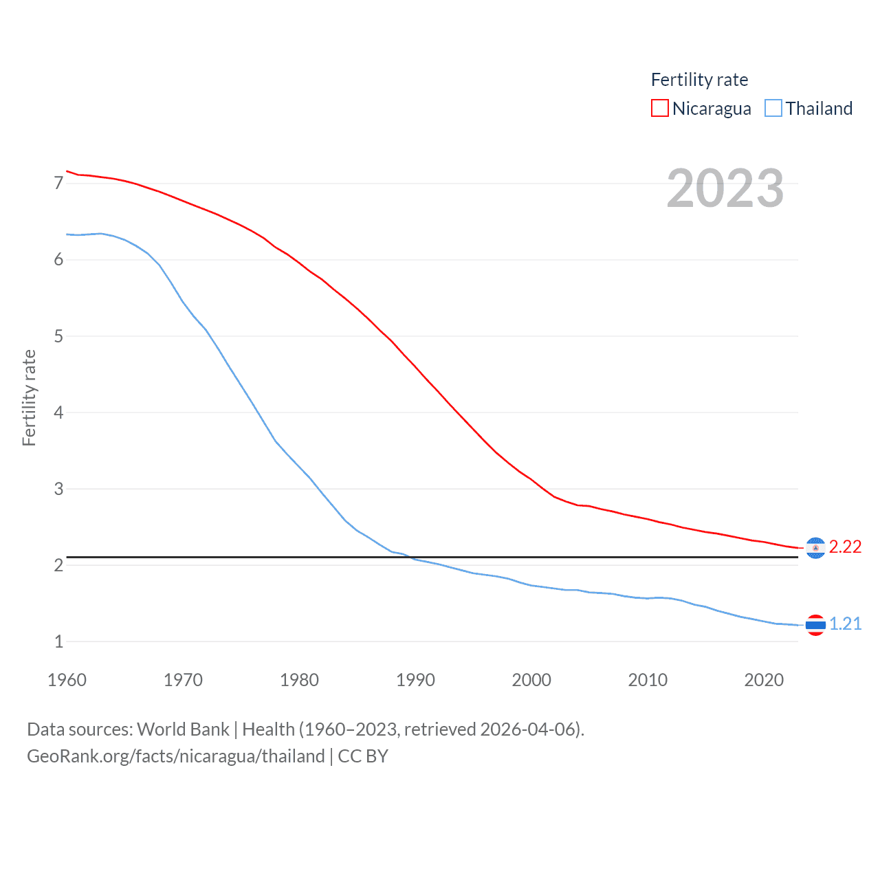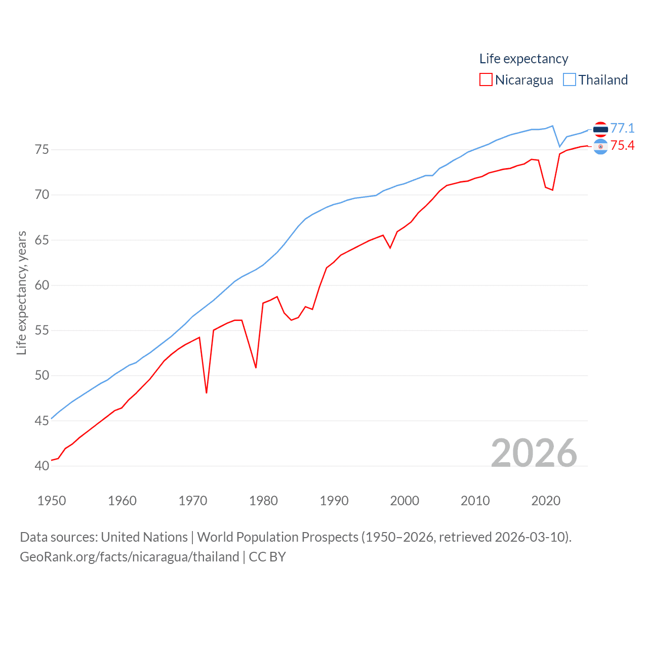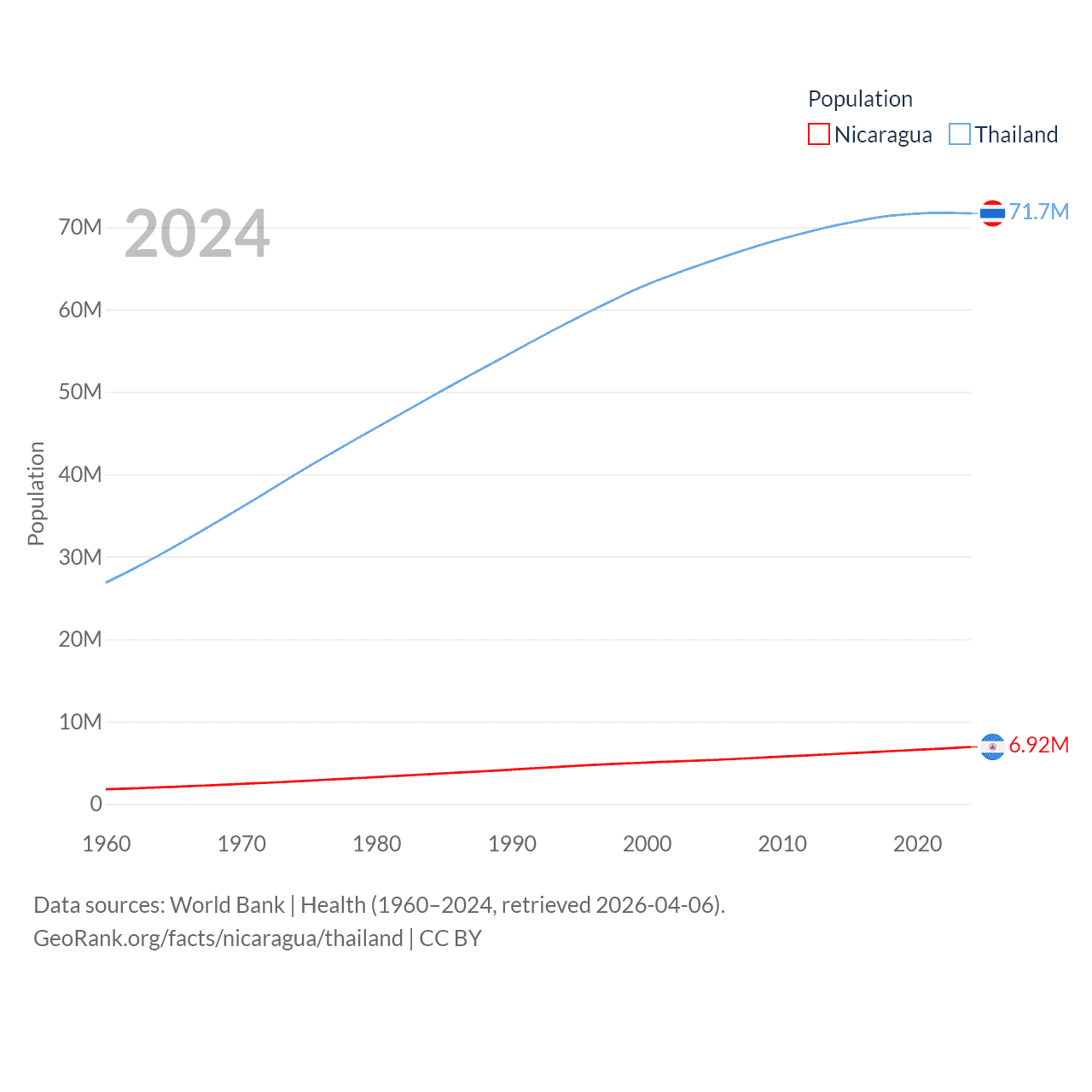 Nicaragua has a population of 6.92M (ranked 108/197), compared with 71.7M in Thailand (ranked 20/197). Nicaragua's land area is 46,464 sq mi versus 197,256 sq mi for Thailand (ranked 98th vs. 50th).