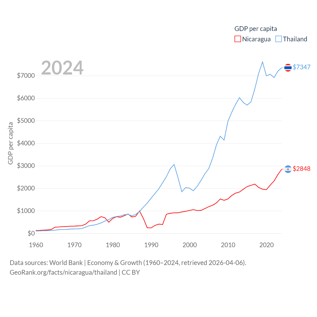 By GDP, Nicaragua ranks 131/197 ($19.7B) and Thailand ranks 31/197 ($527B). By GDP per capita, Nicaragua ranks 141/197 ($2,848), while Thailand ranks 100/197 ($7,347).