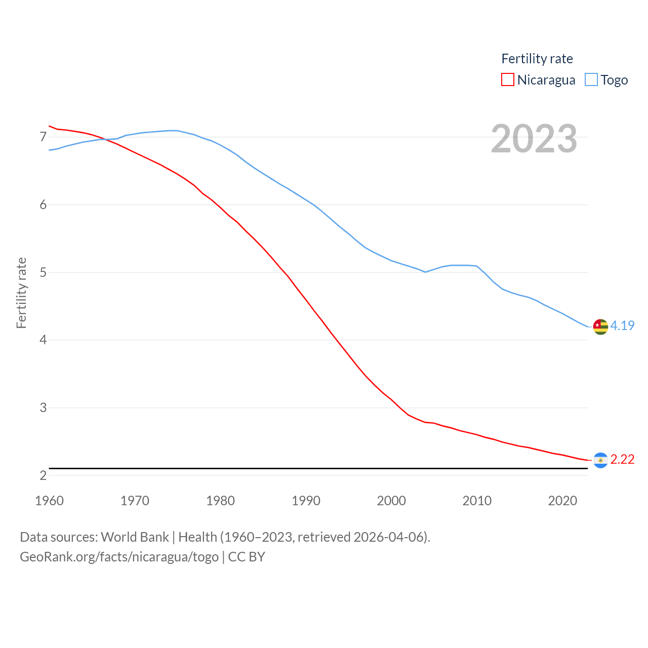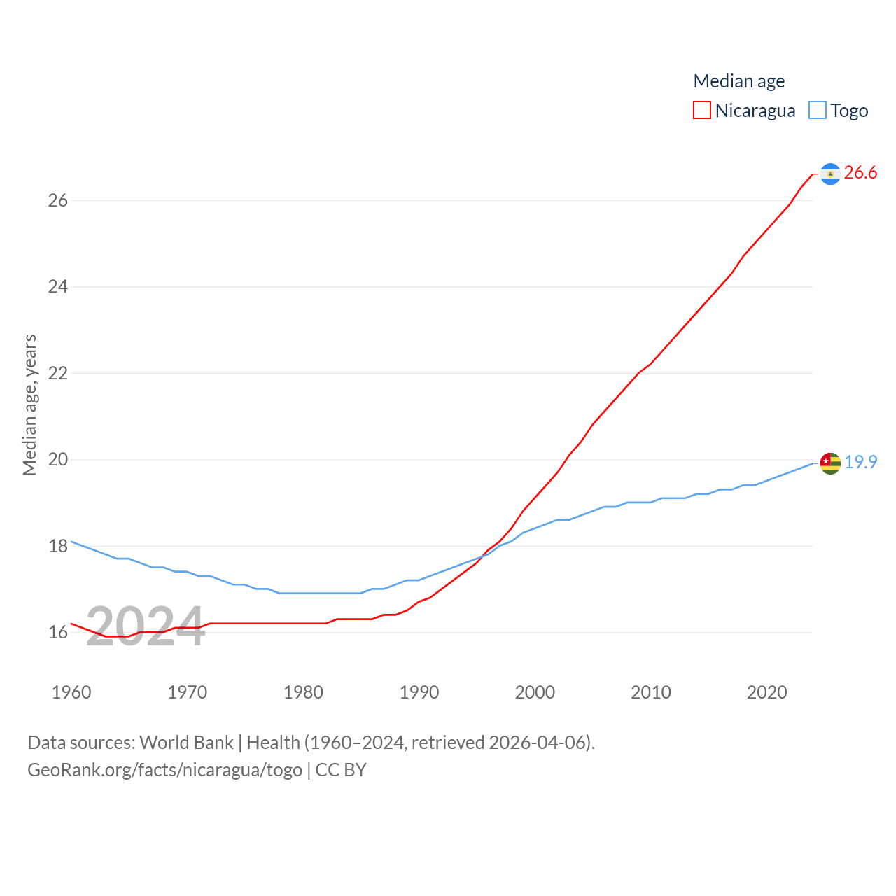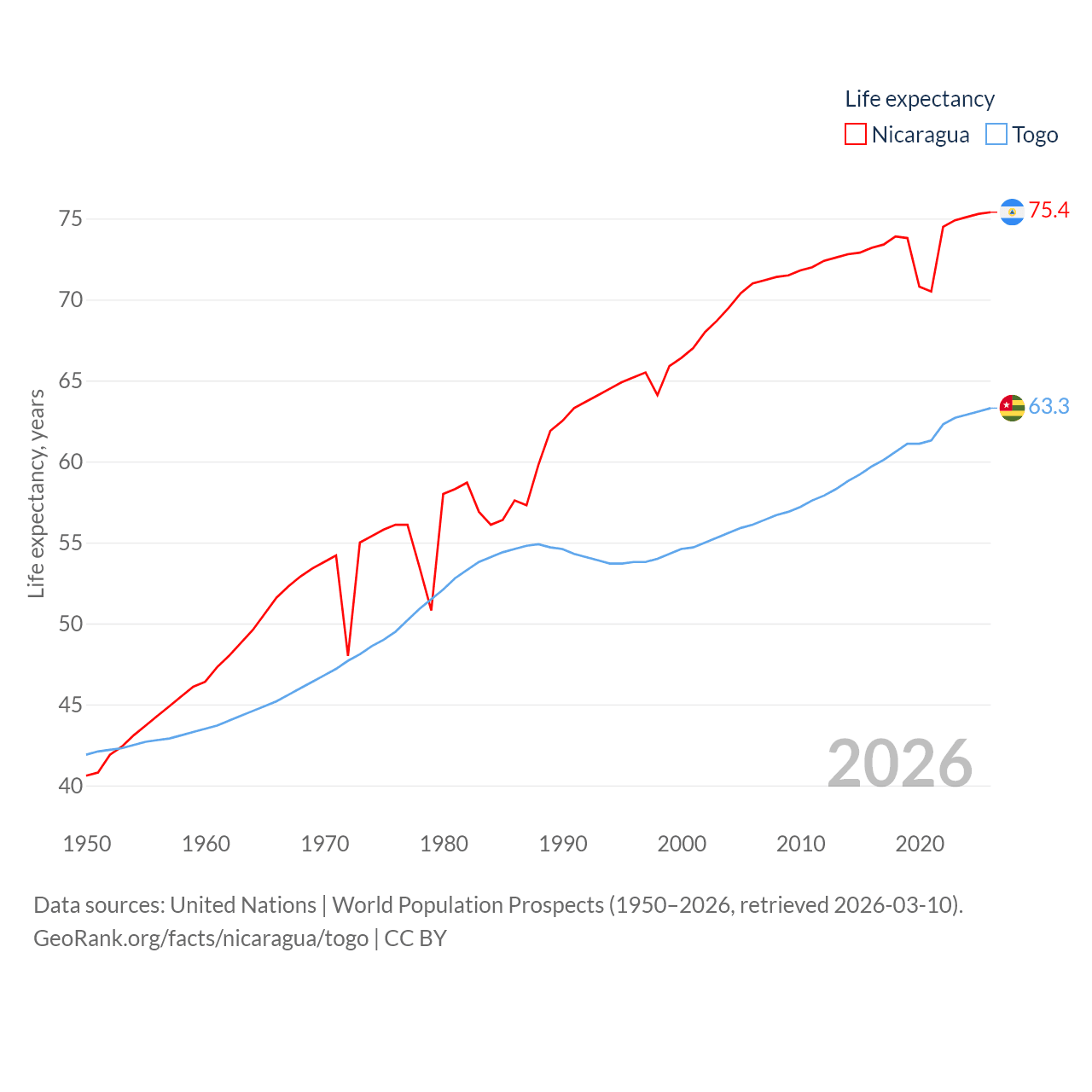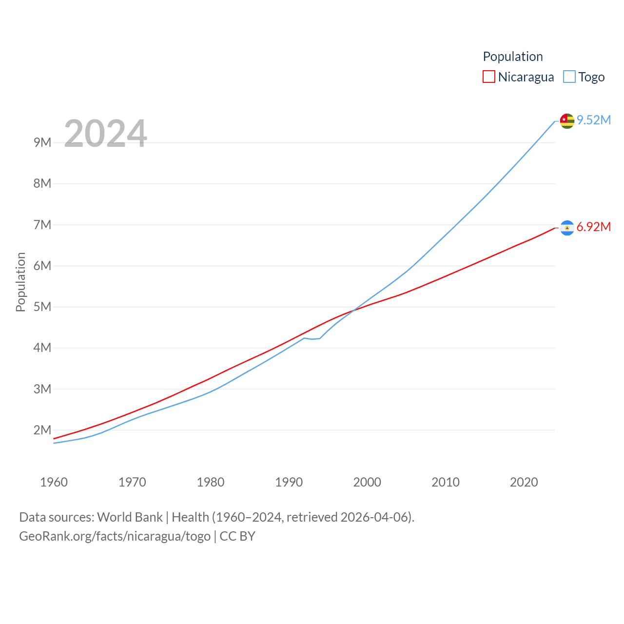 Nicaragua has a population of 6.92M (ranked 108/197), compared with 9.52M in Togo (ranked 98/197). Nicaragua's land area is 46,464 sq mi versus 21,000 sq mi for Togo (ranked 98th vs. 124th).