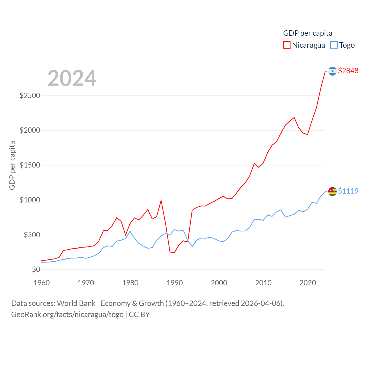 By GDP, Nicaragua ranks 131/197 ($19.7B) and Togo ranks 154/197 ($10.7B). By GDP per capita, Nicaragua ranks 141/197 ($2,848), while Togo ranks 172/197 ($1,119).