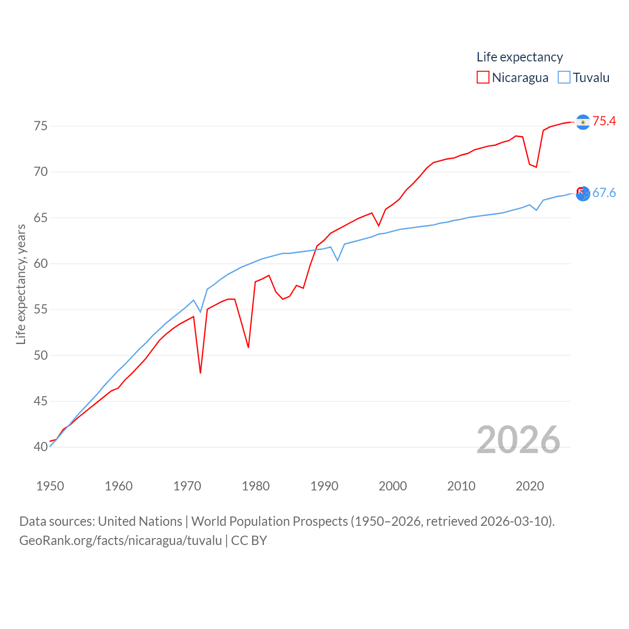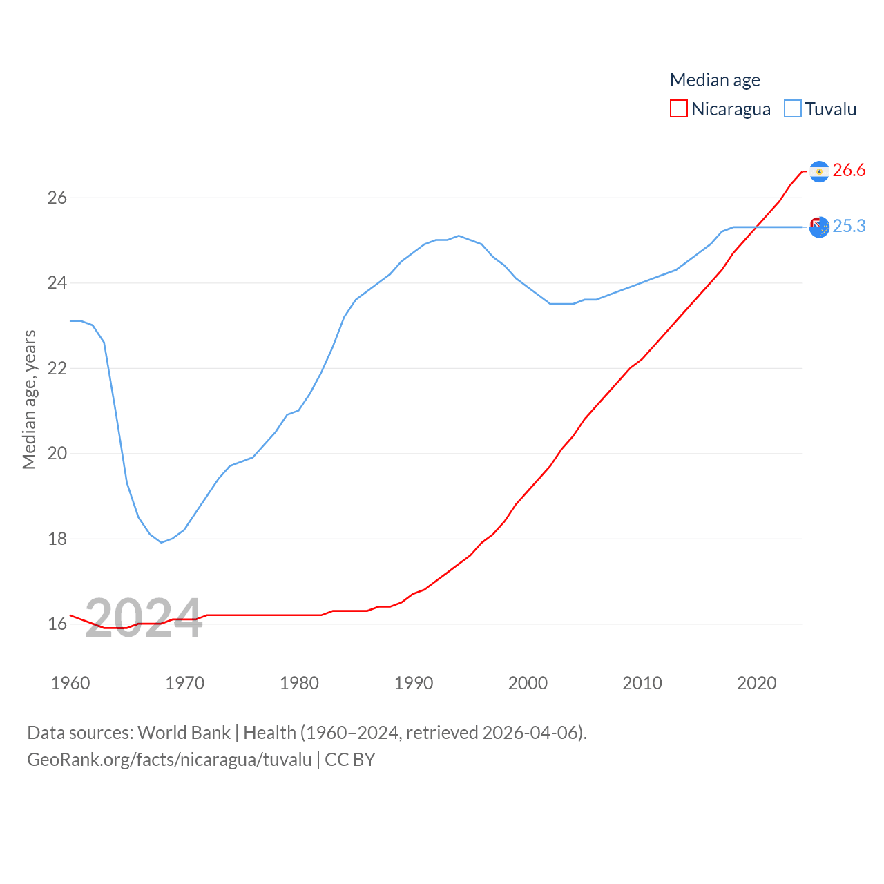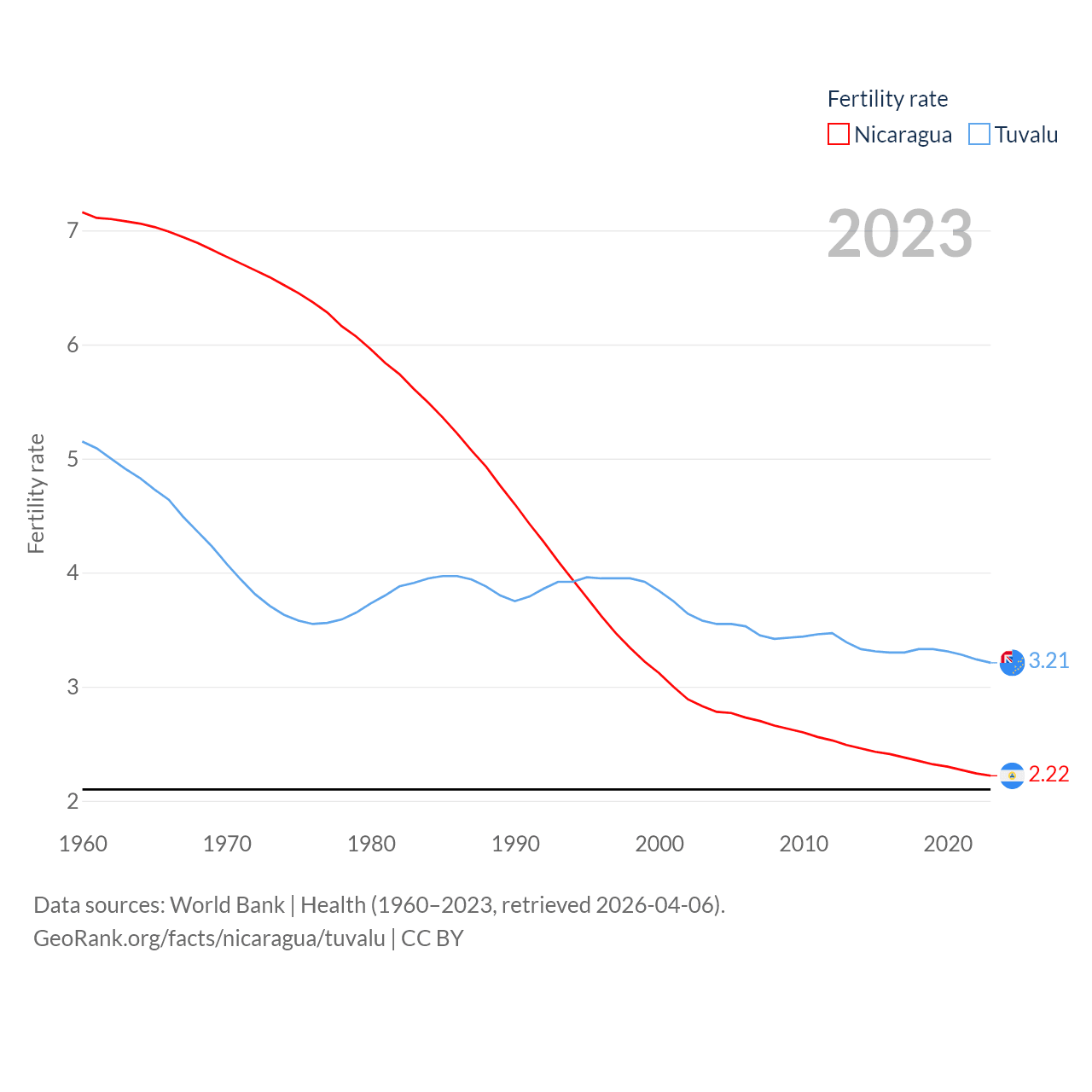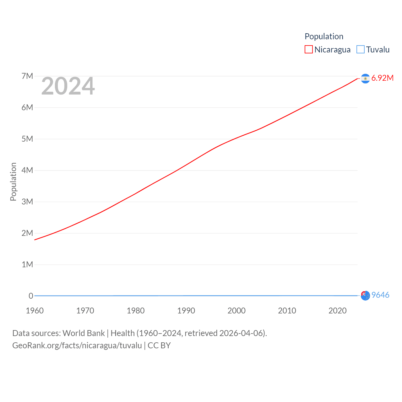 Nicaragua has a population of 6.92M (ranked 108/197), compared with 9.65K in Tuvalu (ranked 196/197). Nicaragua's land area is 46,464 sq mi versus 11.6 sq mi for Tuvalu (ranked 98th vs. 194th).