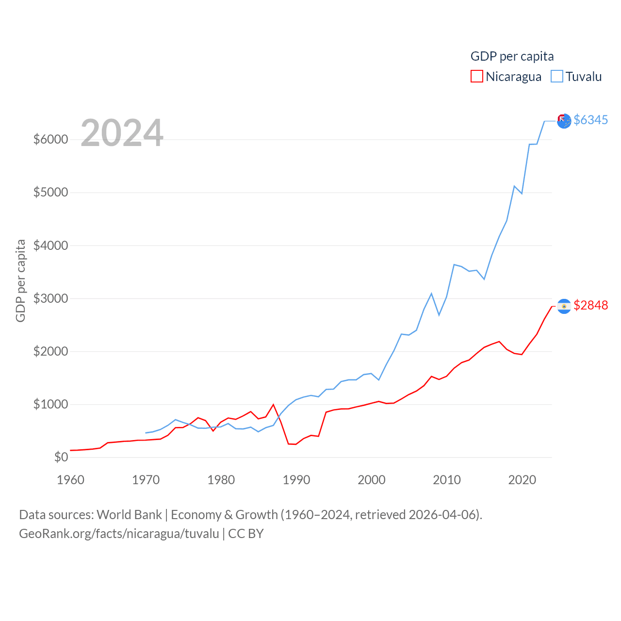 By GDP, Nicaragua ranks 131/197 ($19.7B) and Tuvalu ranks 196/197 ($62.3M). By GDP per capita, Nicaragua ranks 141/197 ($2,848), while Tuvalu ranks 110/197 ($6,345).