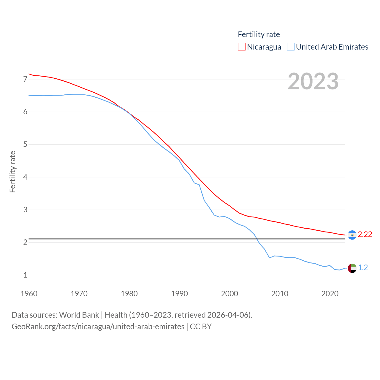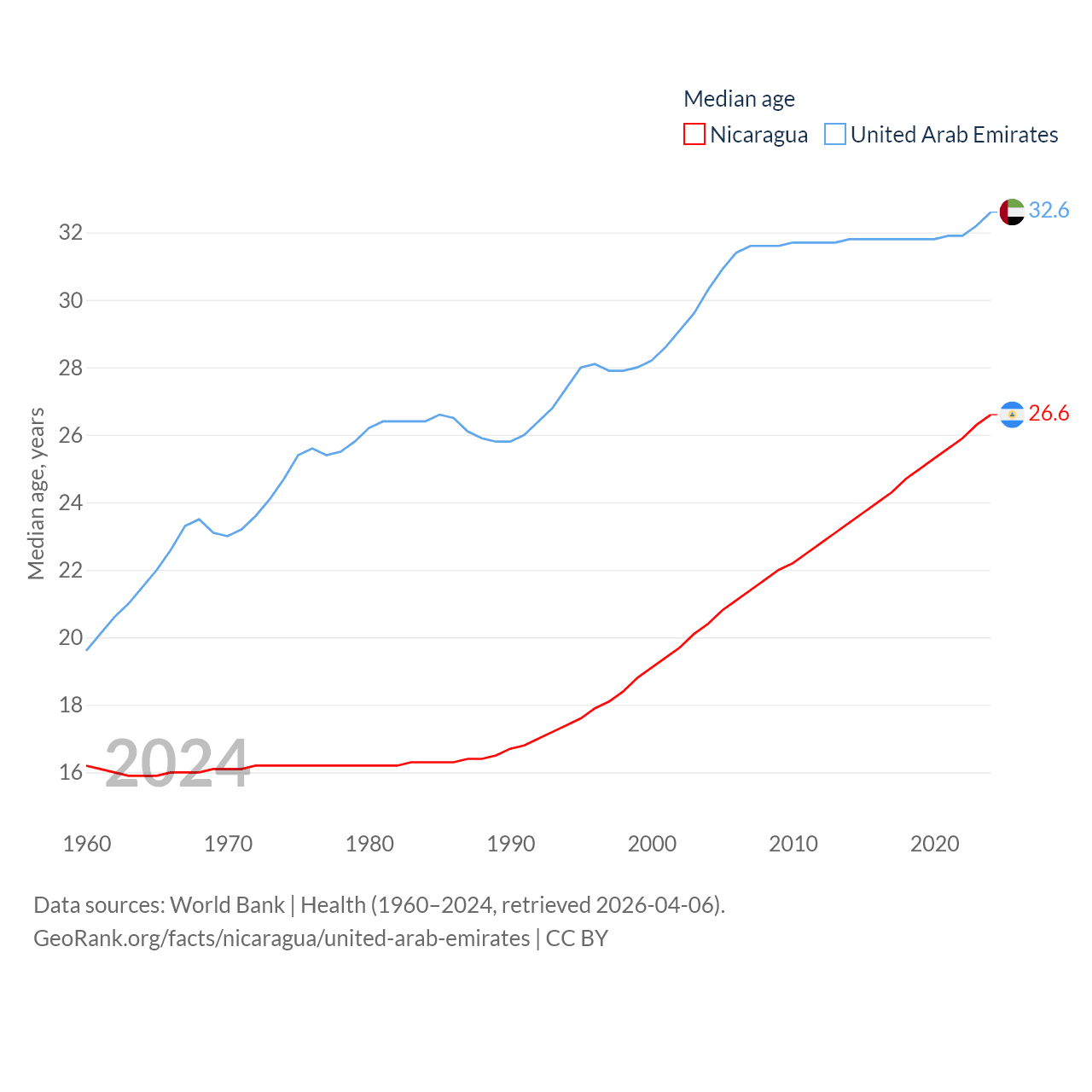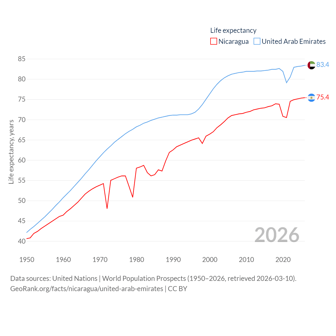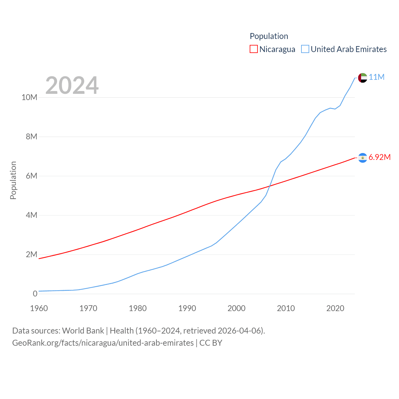 Nicaragua has a population of 6.92M (ranked 108/197), compared with 11M in The United Arab Emirates (ranked 86/197). Nicaragua's land area is 46,464 sq mi versus 27,421 sq mi for The United Arab Emirates (ranked 98th vs. 117th).