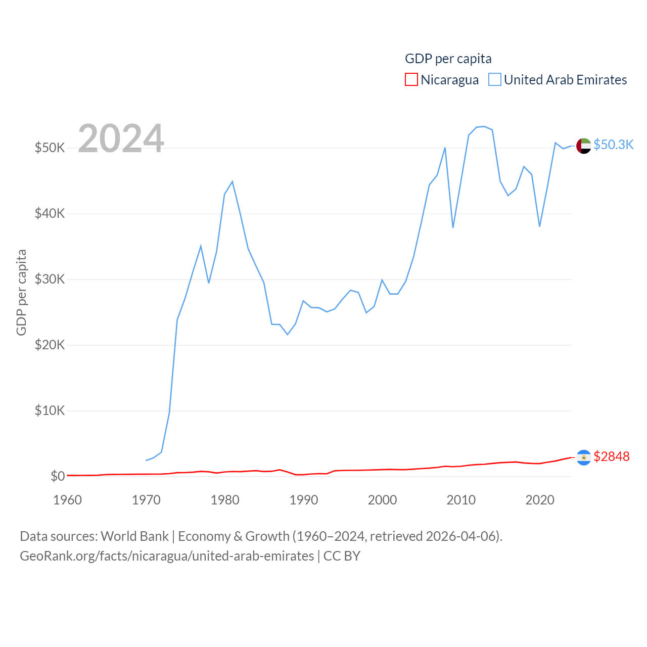 By GDP, Nicaragua ranks 131/197 ($19.7B) and The United Arab Emirates ranks 27/197 ($552B). By GDP per capita, Nicaragua ranks 141/197 ($2,848), while The United Arab Emirates ranks 24/197 ($50,274).