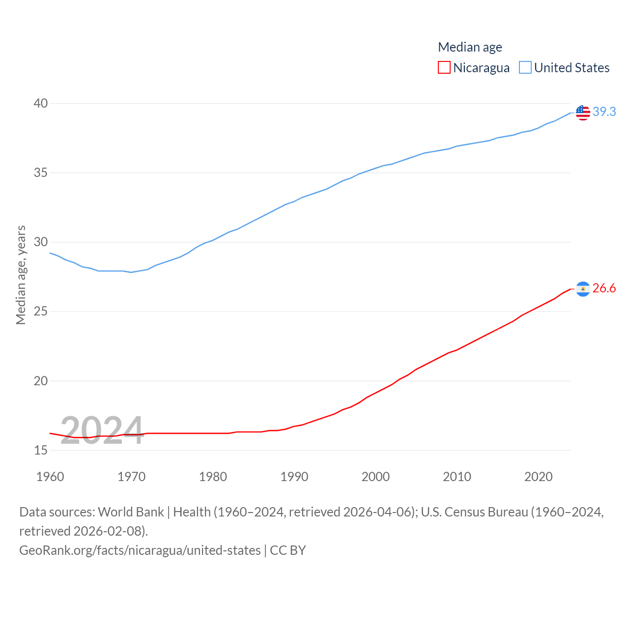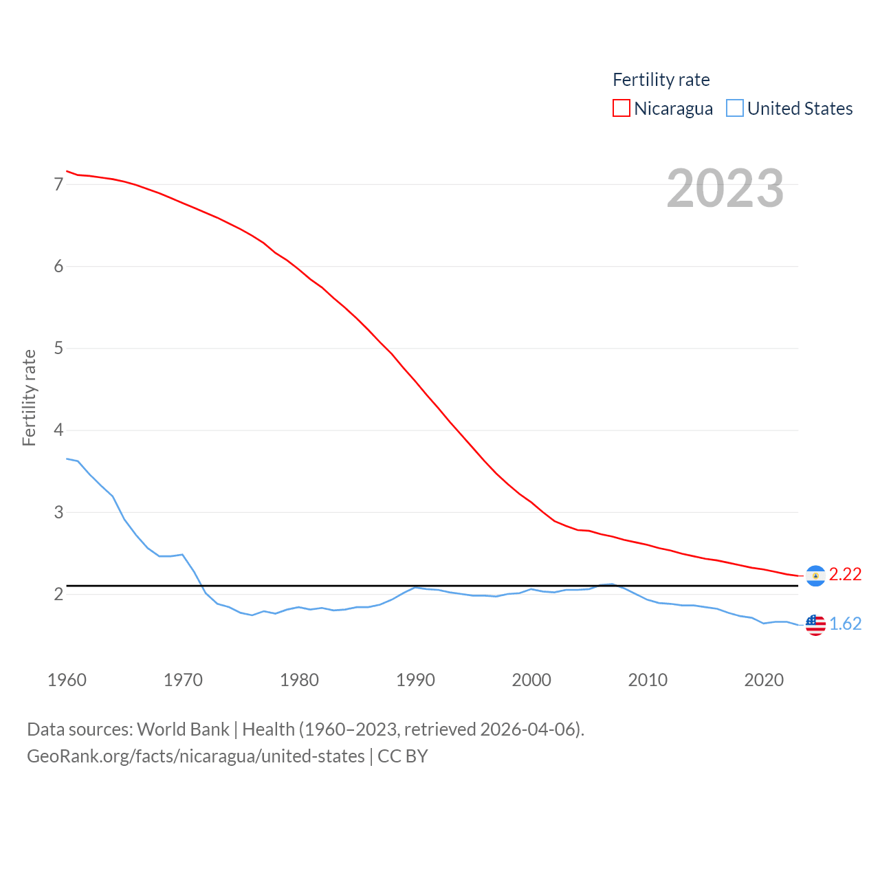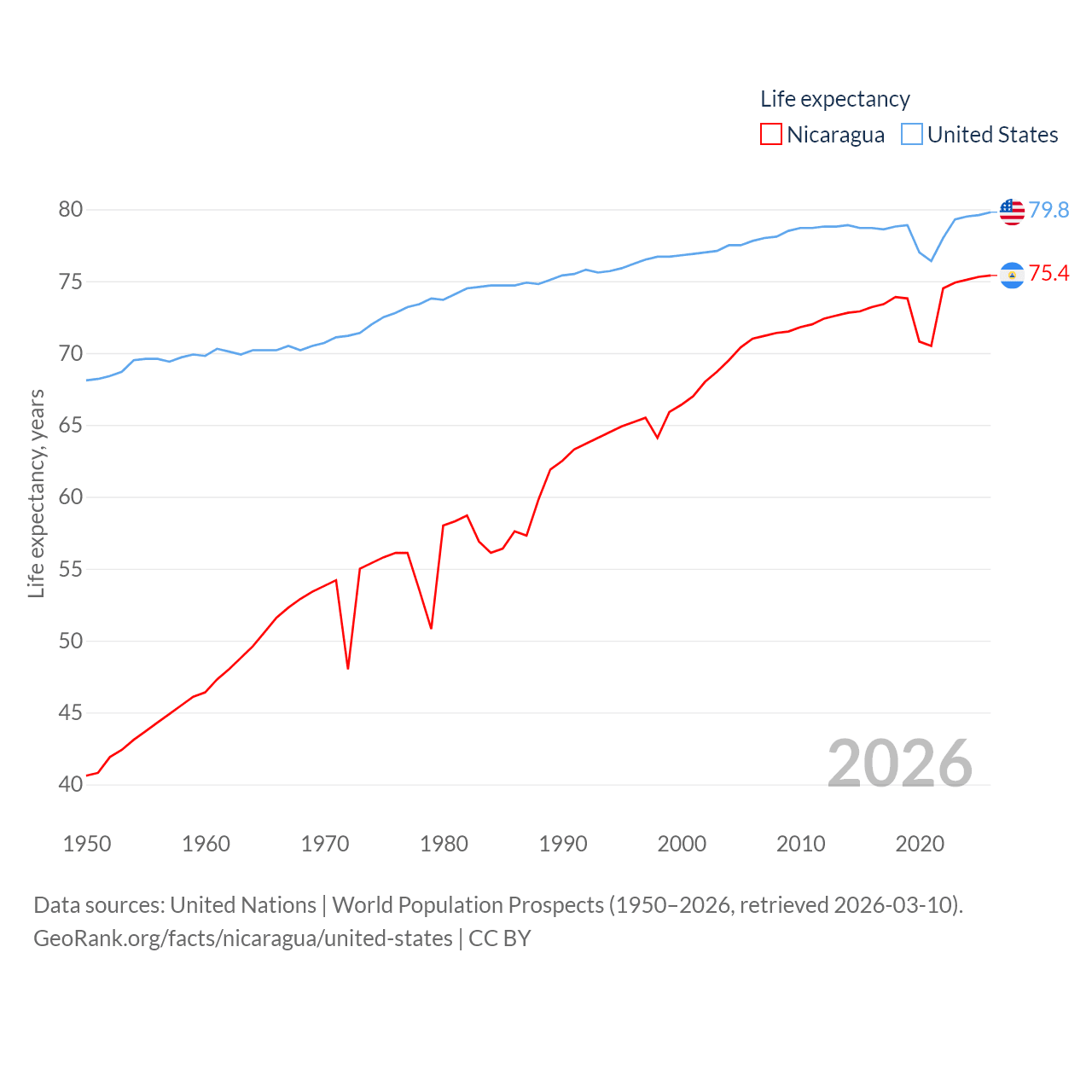 Nicaragua has a population of 6.92M (ranked 108/197), compared with 342M in The United States (ranked 3/197). Nicaragua's land area is 46,464 sq mi versus 3,531,839 sq mi for The United States (ranked 98th vs. 3rd).