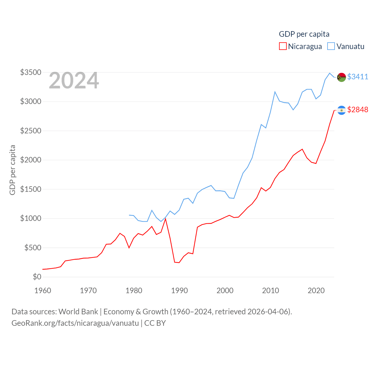 By GDP, Nicaragua ranks 131/197 ($19.7B) and Vanuatu ranks 188/197 ($1.12B). By GDP per capita, Nicaragua ranks 141/197 ($2,848), while Vanuatu ranks 137/197 ($3,411).