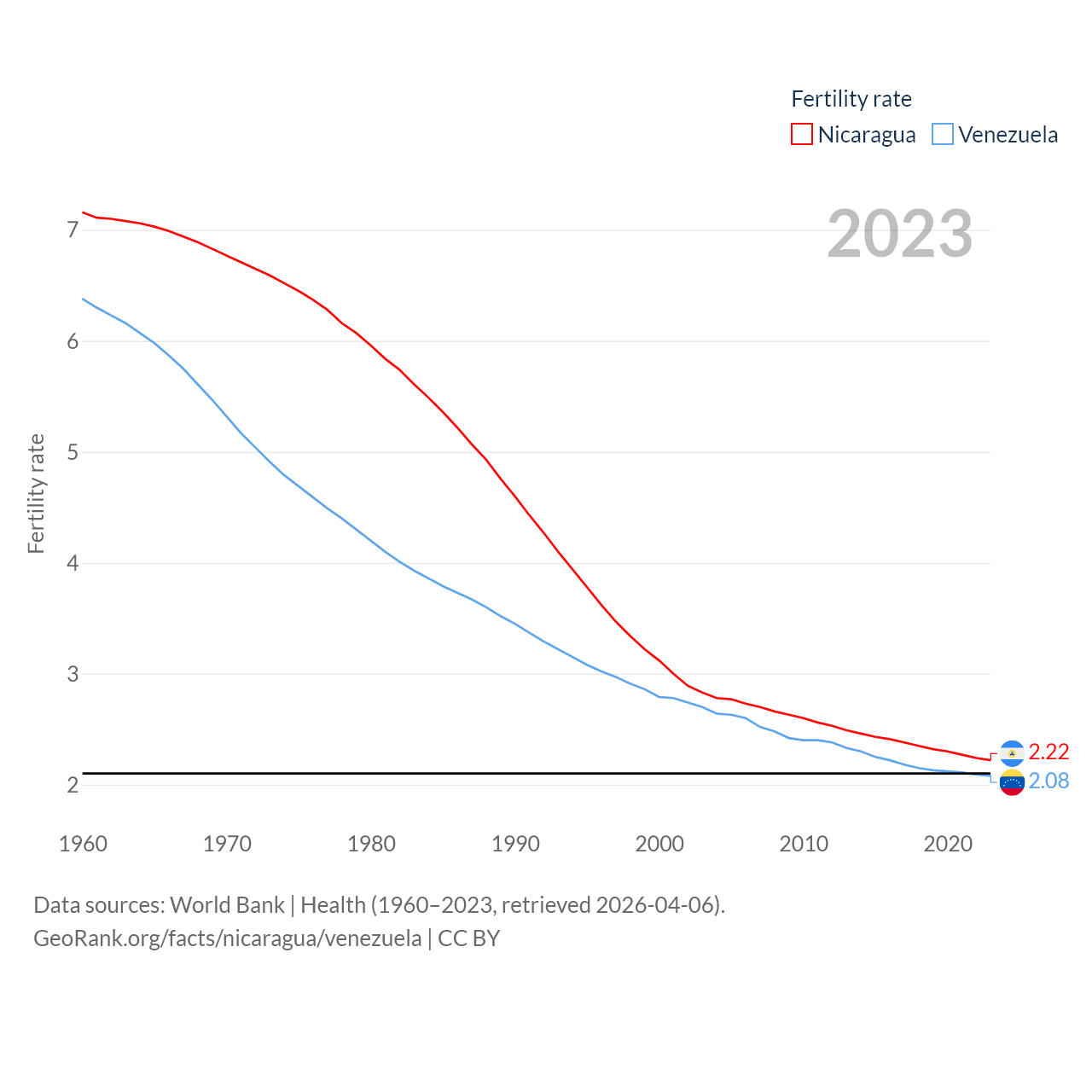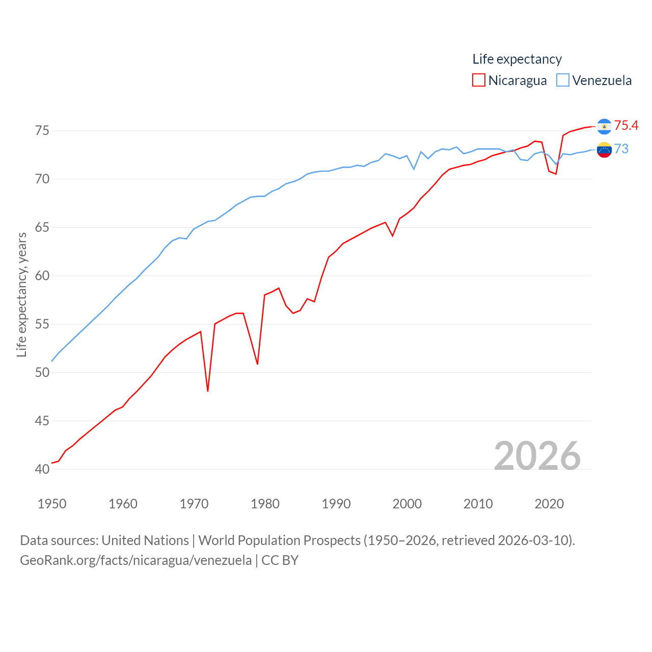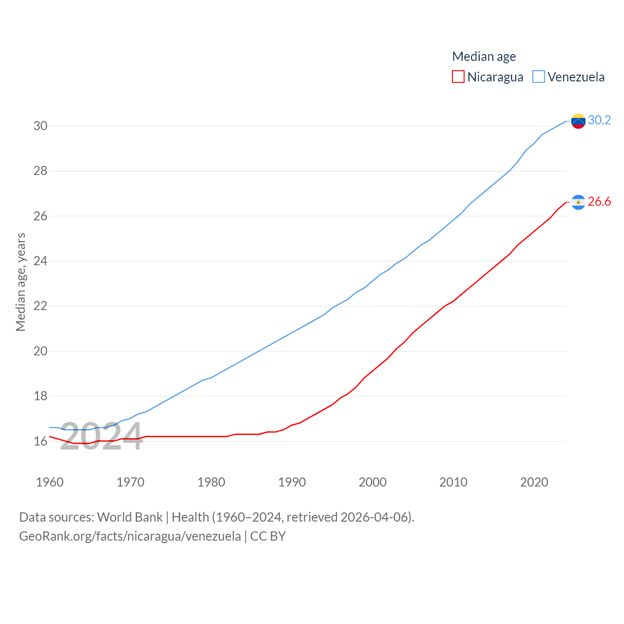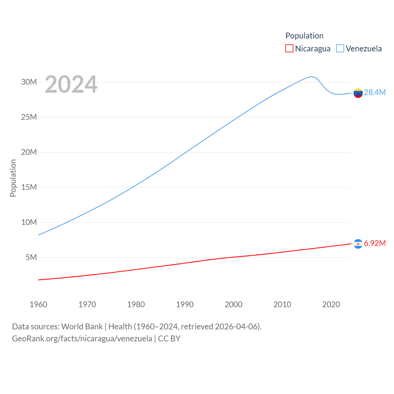 Nicaragua has a population of 6.92M (ranked 108/197), compared with 28.4M in Venezuela (ranked 53/197). Nicaragua's land area is 46,464 sq mi versus 340,561 sq mi for Venezuela (ranked 98th vs. 32nd).