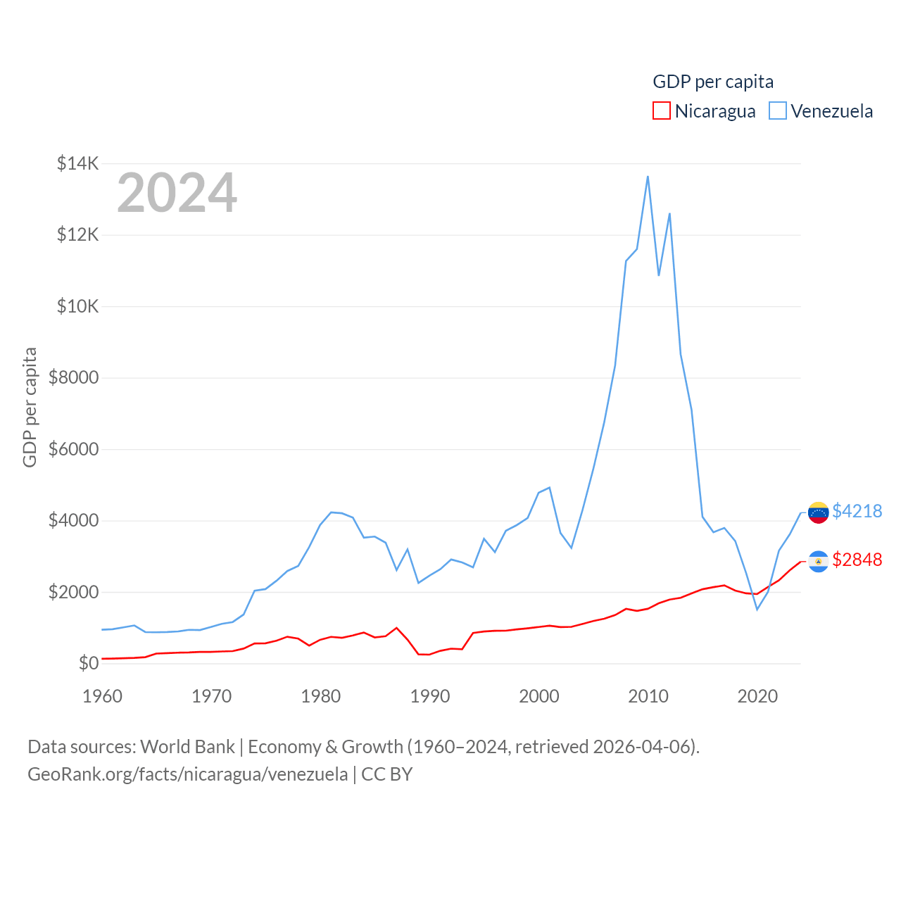 By GDP, Nicaragua ranks 131/197 ($19.7B) and Venezuela ranks 65/197 ($120B). By GDP per capita, Nicaragua ranks 141/197 ($2,848), while Venezuela ranks 128/197 ($4,218).
