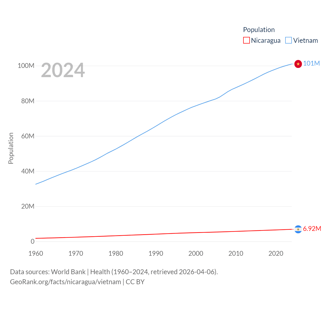 Nicaragua has a population of 6.92M (ranked 108/197), compared with 101M in Vietnam (ranked 16/197). Nicaragua's land area is 46,464 sq mi versus 121,016 sq mi for Vietnam (ranked 98th vs. 67th).