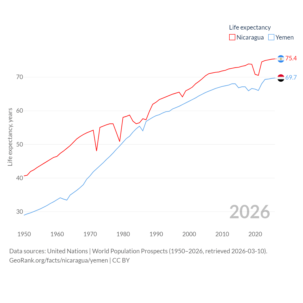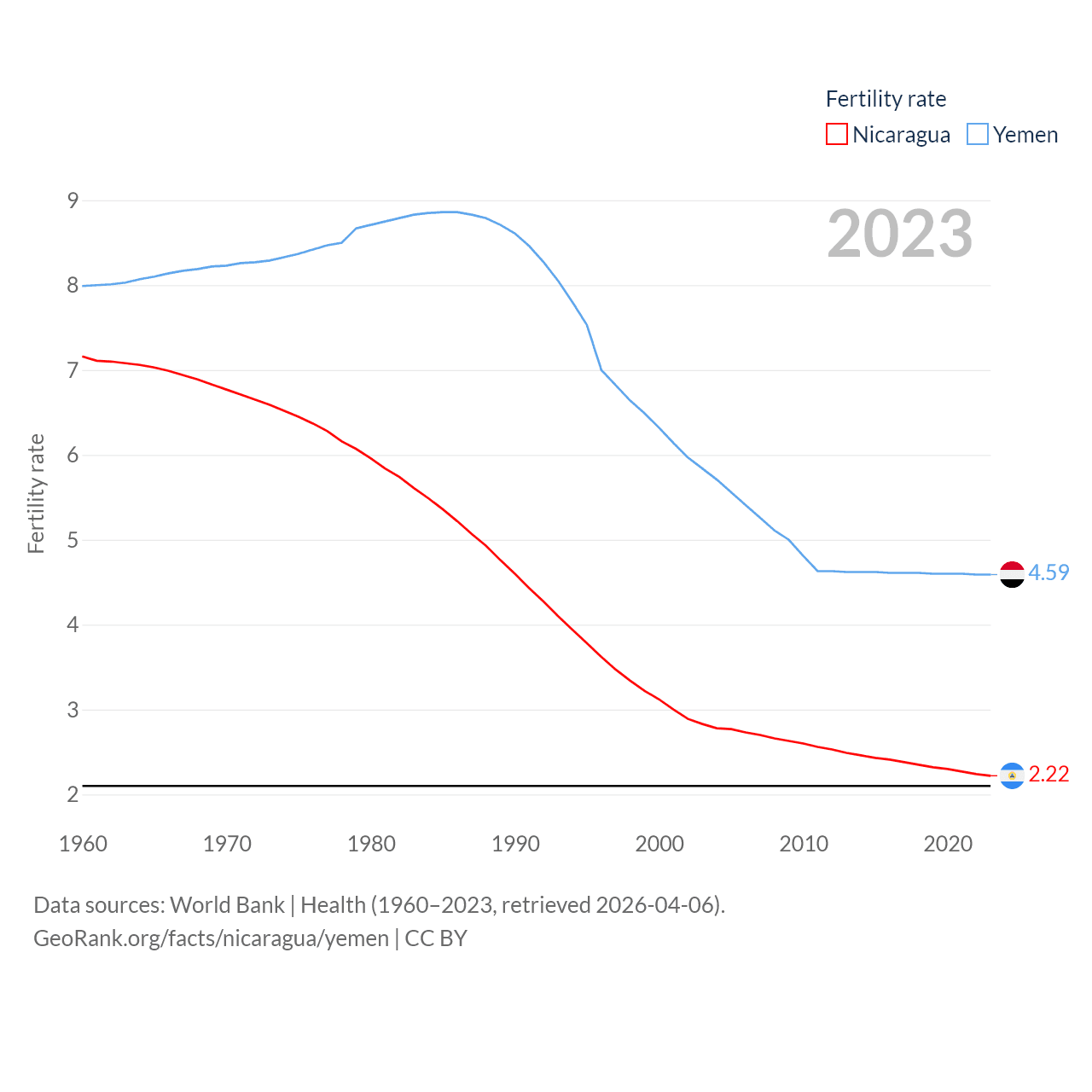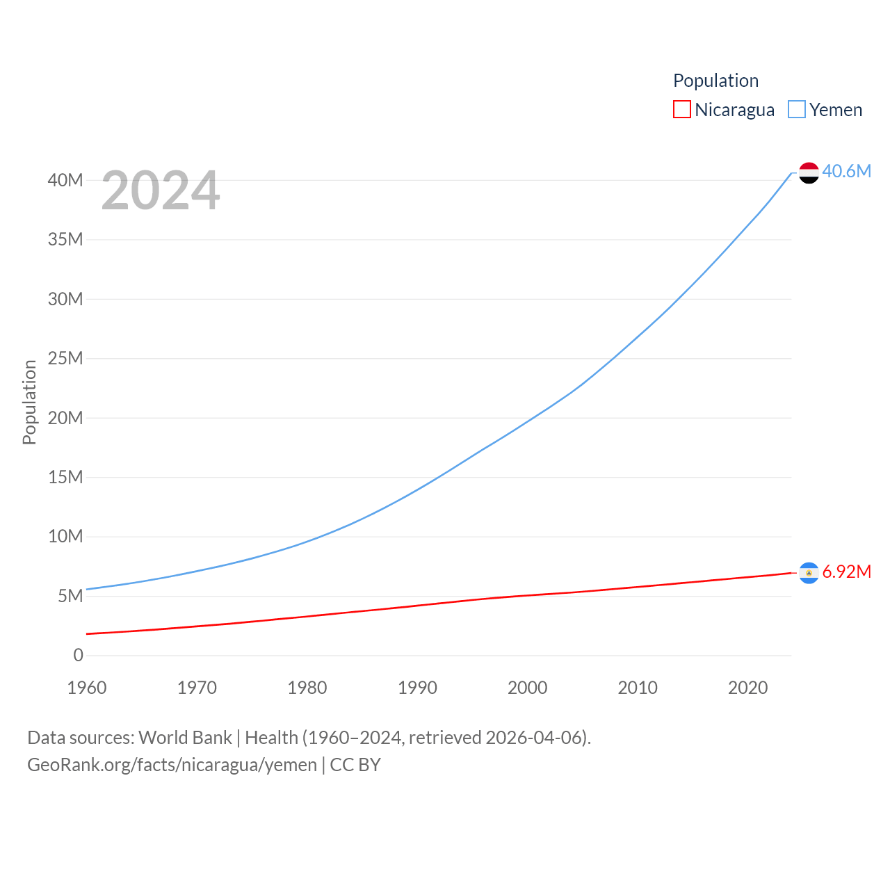 Nicaragua has a population of 6.92M (ranked 108/197), compared with 40.6M in Yemen (ranked 38/197). Nicaragua's land area is 46,464 sq mi versus 203,850 sq mi for Yemen (ranked 98th vs. 49th).