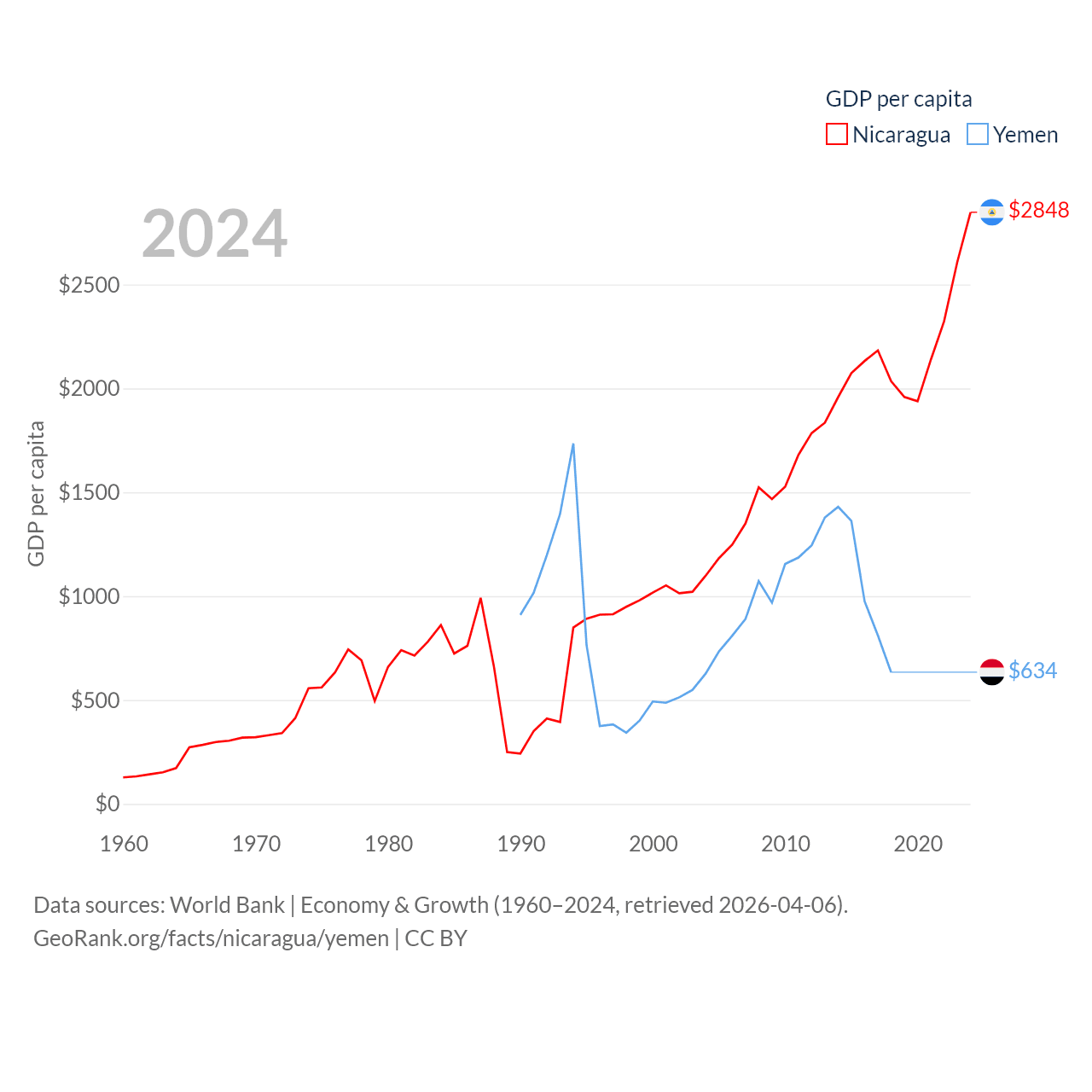 By GDP, Nicaragua ranks 131/197 ($19.7B) and Yemen ranks 125/197 ($21.6B). By GDP per capita, Nicaragua ranks 141/197 ($2,848), while Yemen ranks 191/197 ($634).