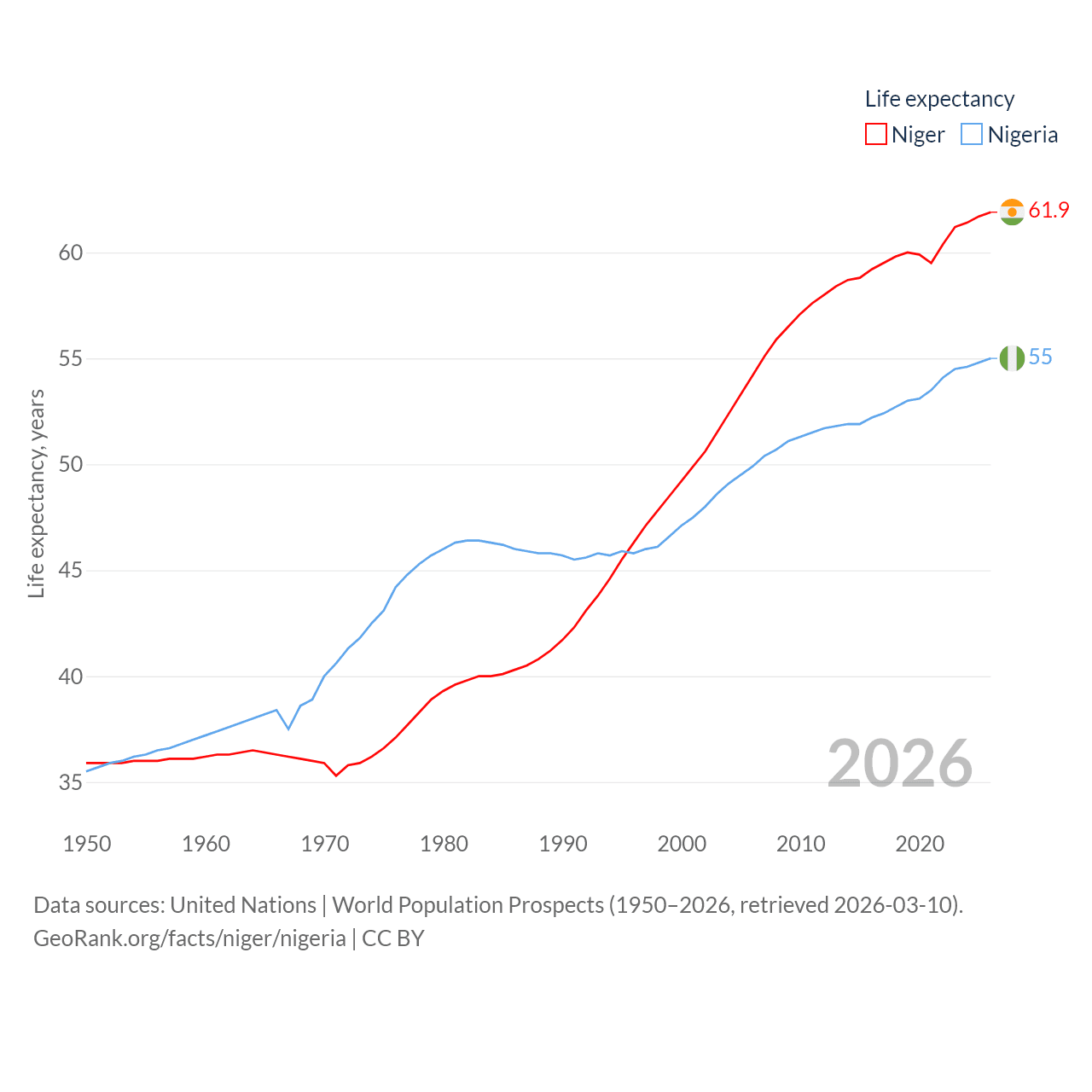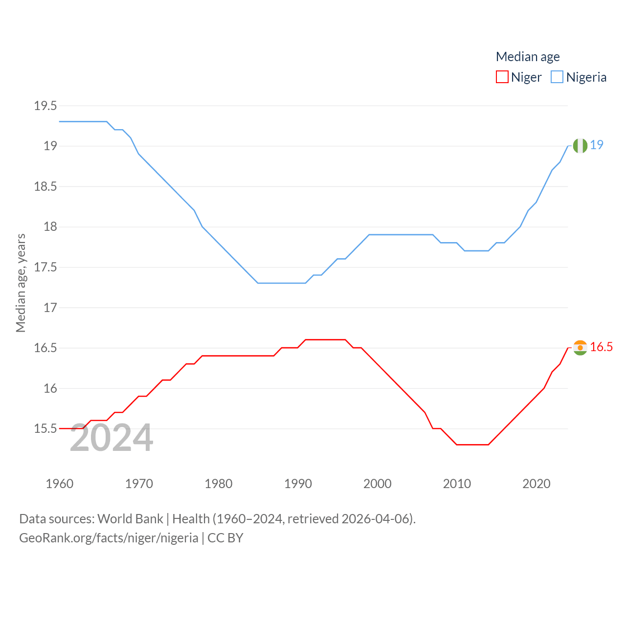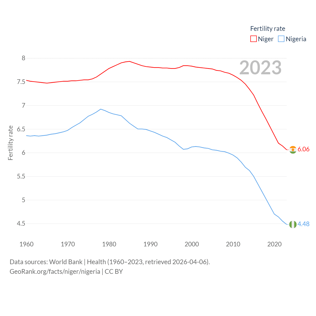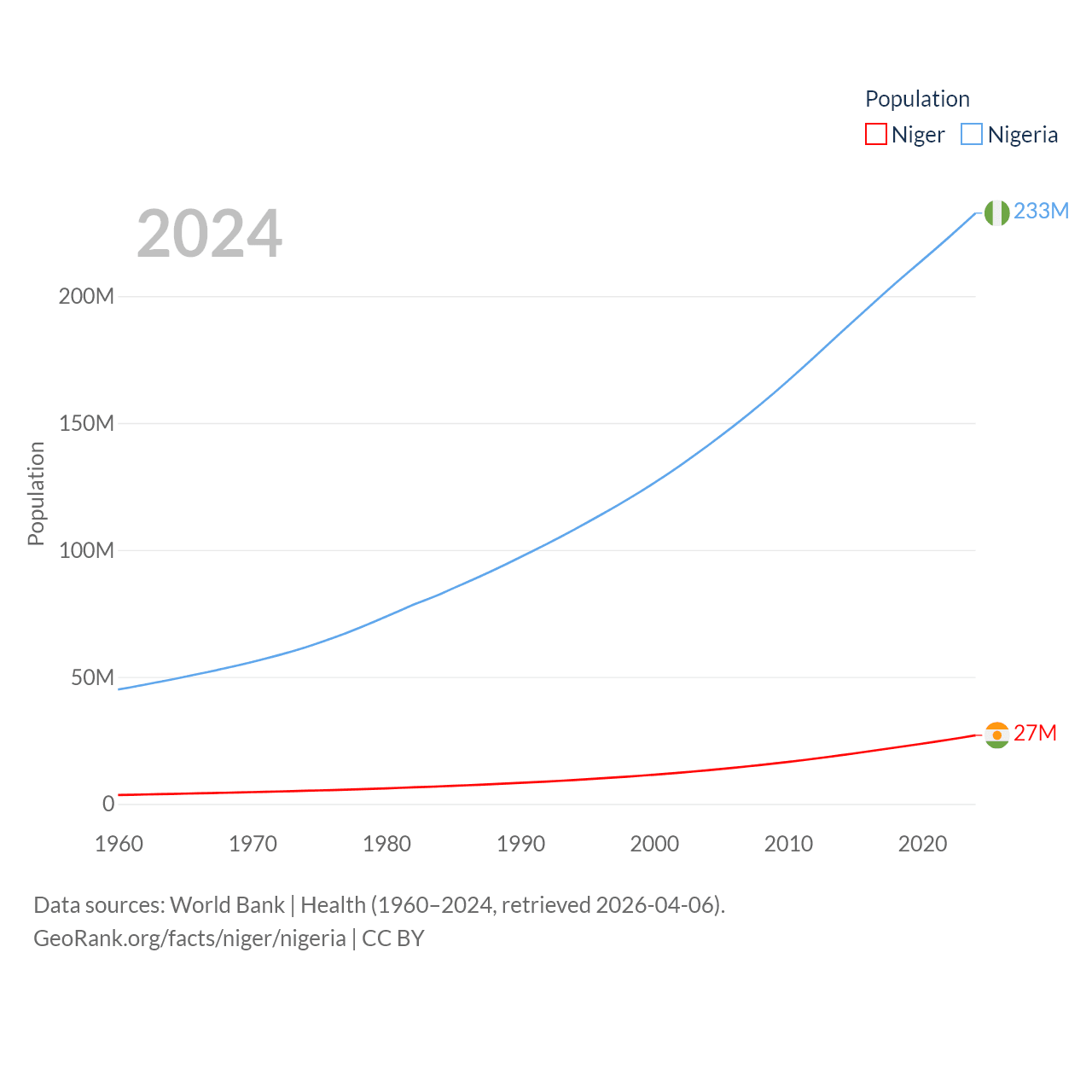 Niger has a population of 27M (ranked 55/197), compared with 233M in Nigeria (ranked 6/197). Niger's land area is 489,076 sq mi versus 351,650 sq mi for Nigeria (ranked 20th vs. 30th).