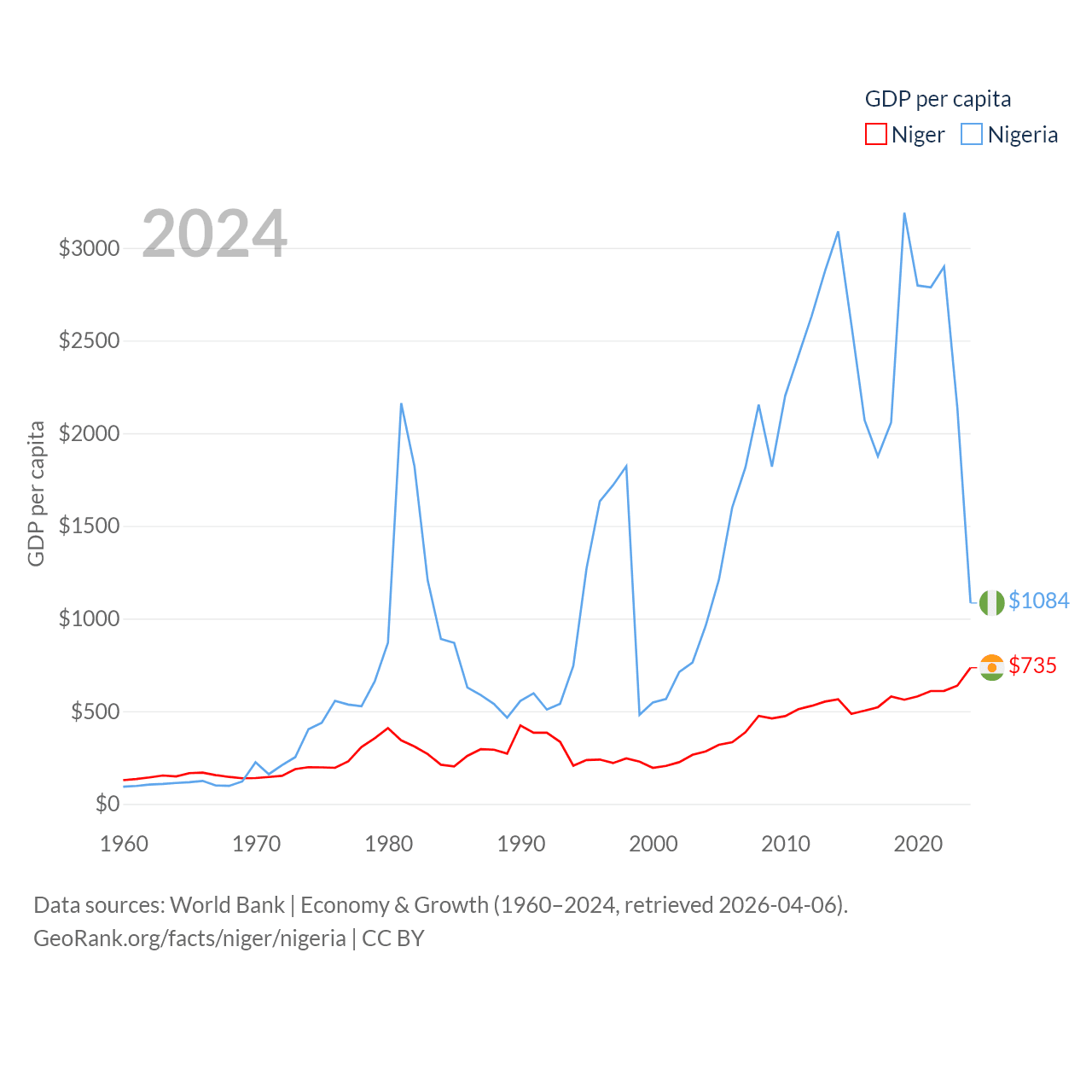 By GDP, Niger ranks 130/197 ($19.9B) and Nigeria ranks 54/197 ($252B). By GDP per capita, Niger ranks 187/197 ($735), while Nigeria ranks 174/197 ($1,084).