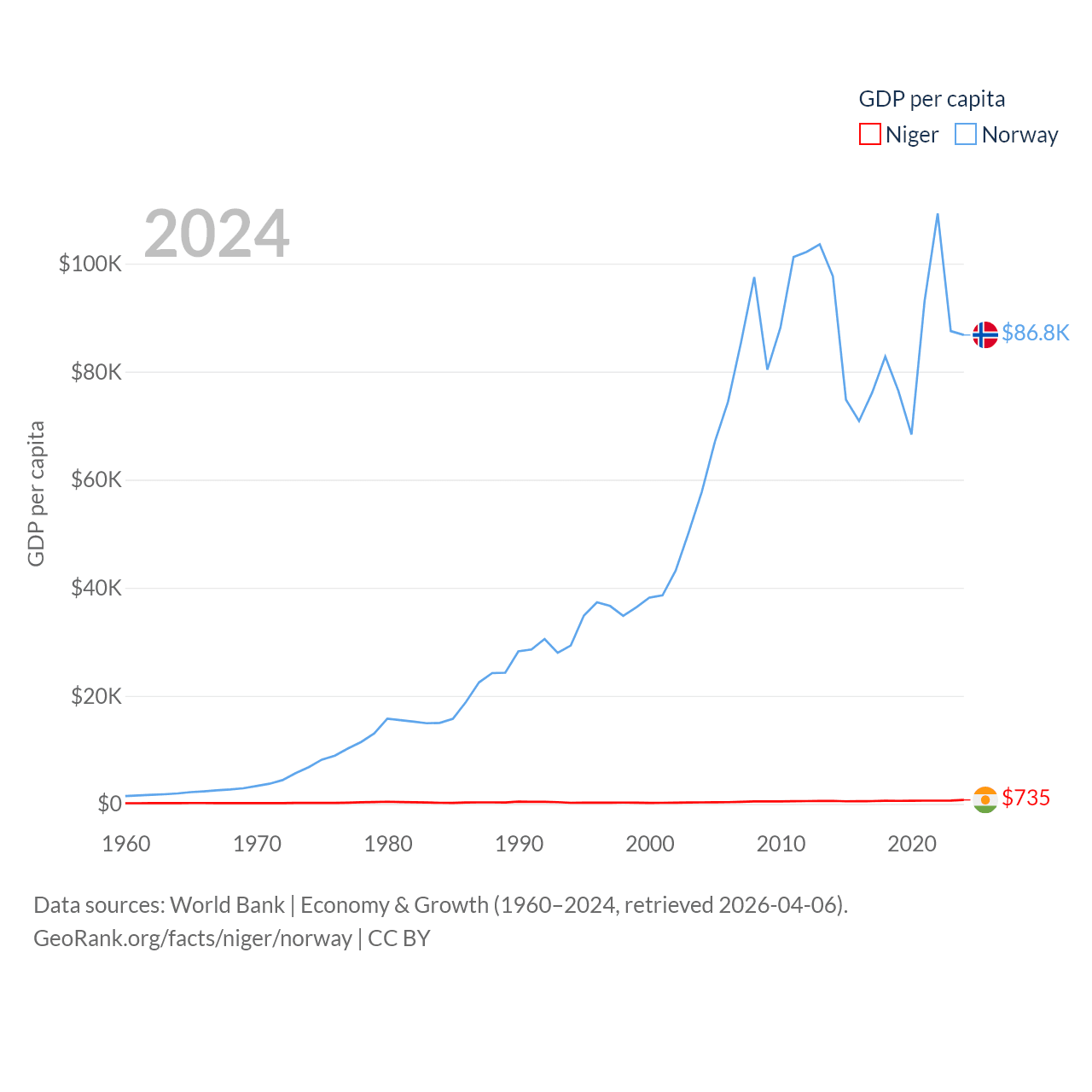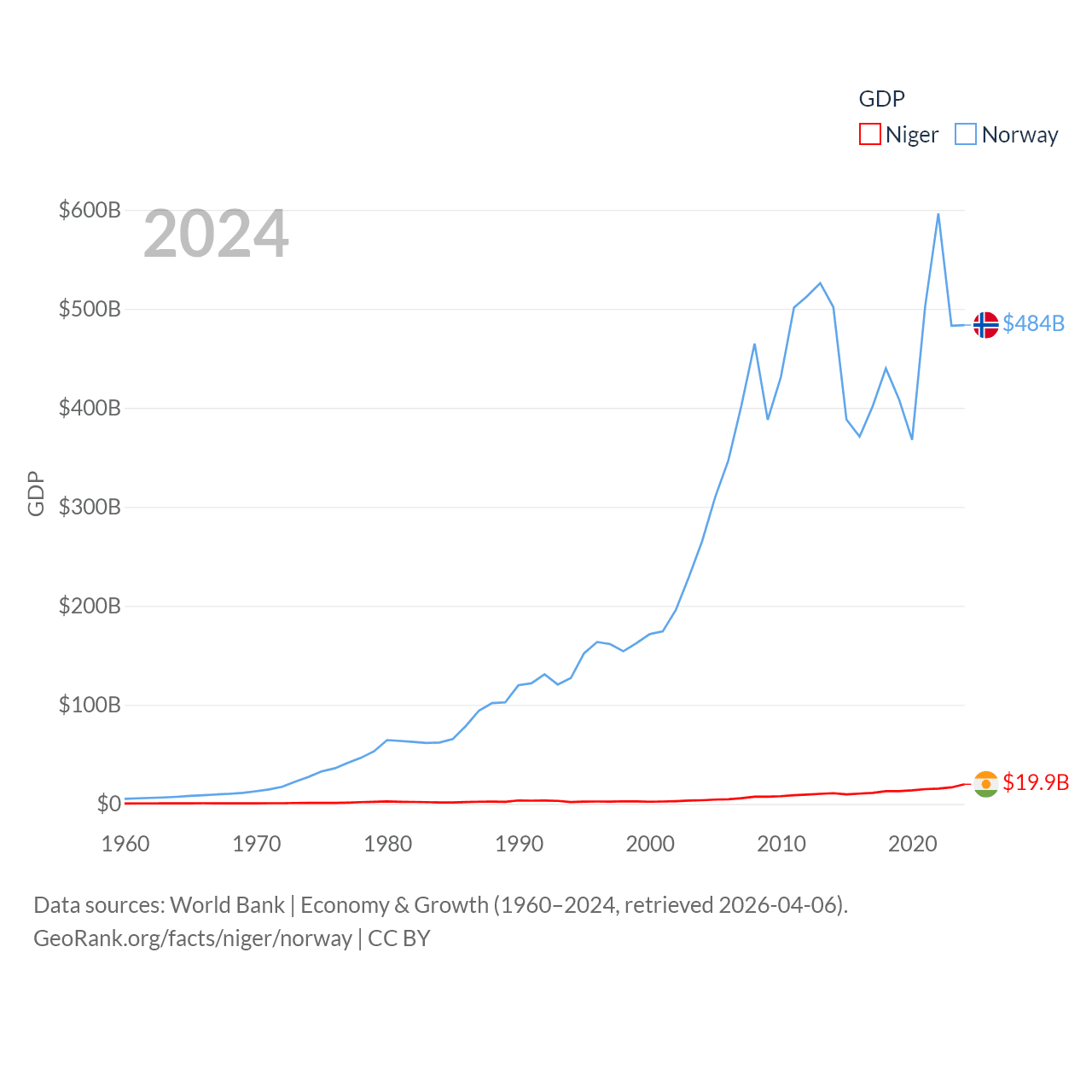 By GDP, Niger ranks 130/197 ($19.9B) and Norway ranks 32/197 ($484B). By GDP per capita, Niger ranks 187/197 ($735), while Norway ranks 8/197 ($86,785).