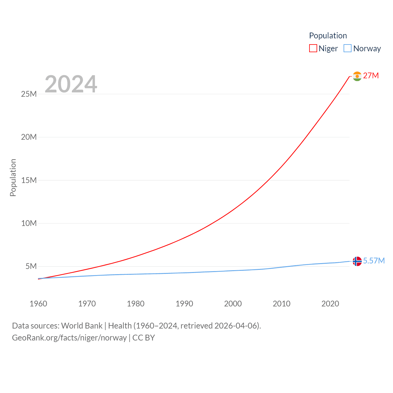 Niger has a population of 27M (ranked 55/197), compared with 5.57M in Norway (ranked 118/197). Niger's land area is 489,076 sq mi versus 140,645 sq mi for Norway (ranked 20th vs. 62nd).