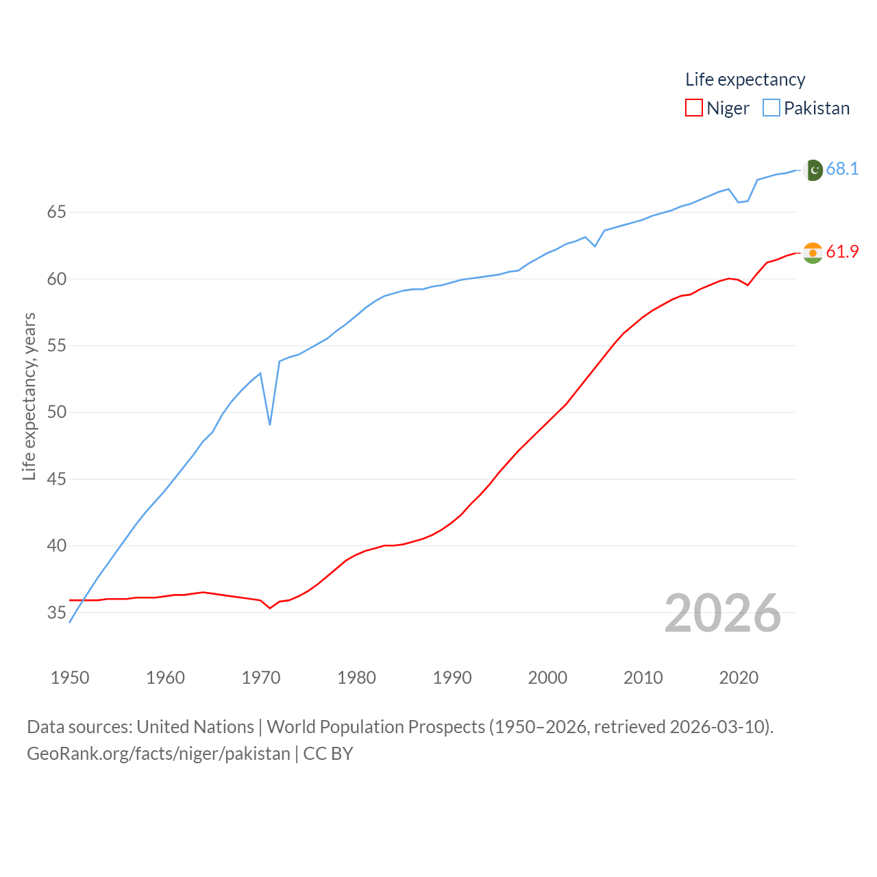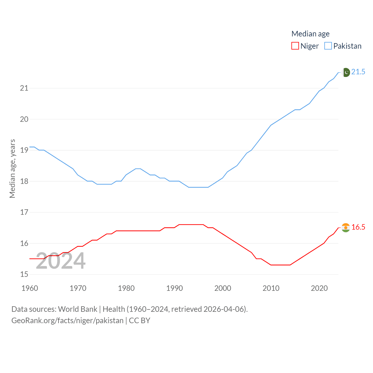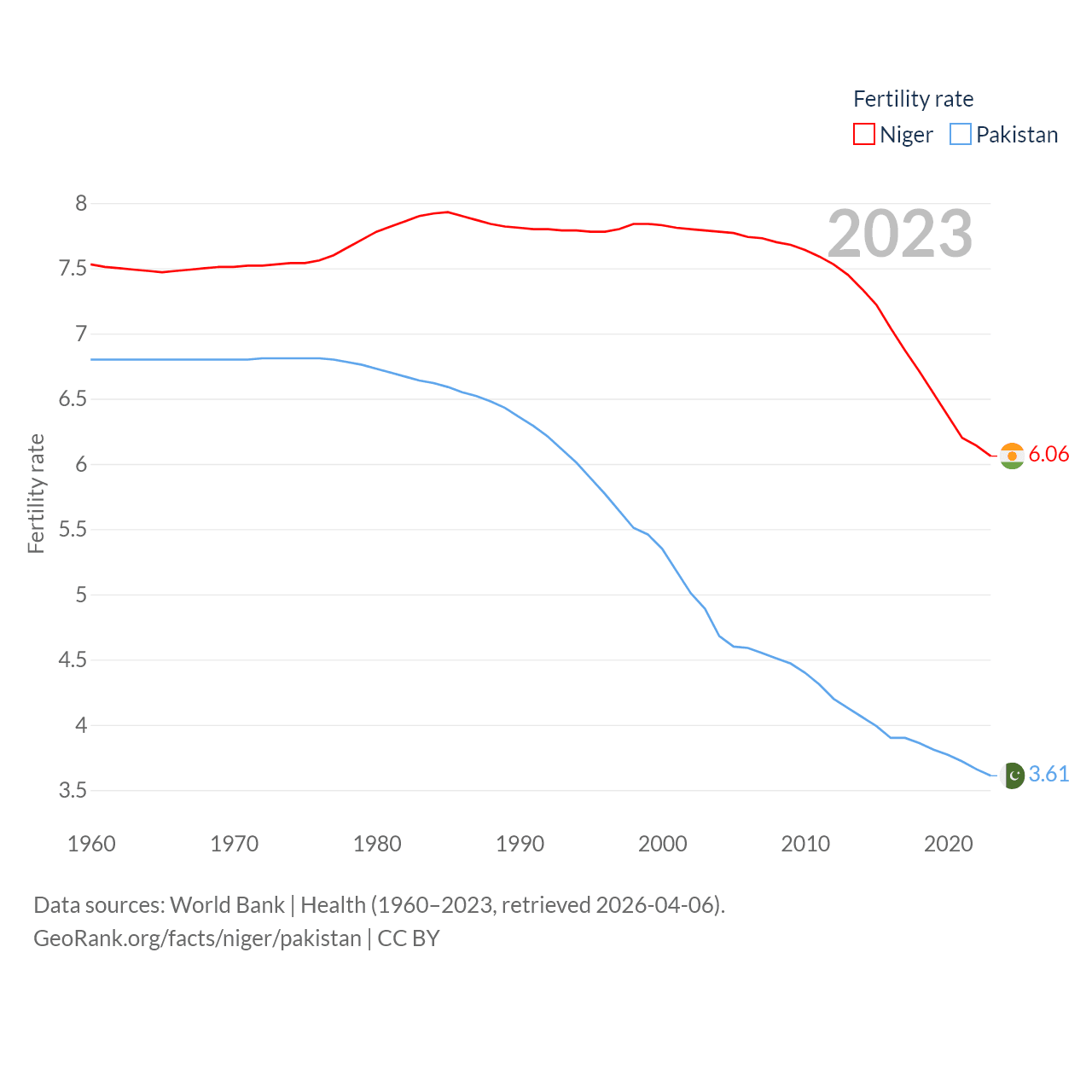 Niger has a population of 27M (ranked 55/197), compared with 251M in Pakistan (ranked 5/197). Niger's land area is 489,076 sq mi versus 297,638 sq mi for Pakistan (ranked 20th vs. 35th).