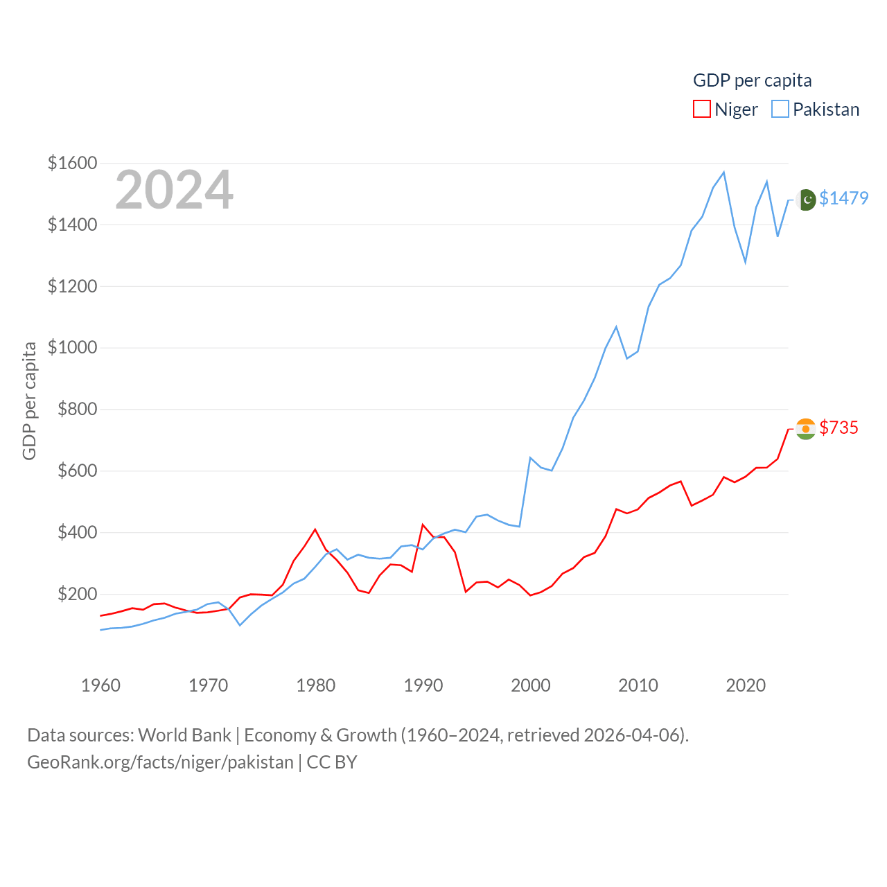 By GDP, Niger ranks 130/197 ($19.9B) and Pakistan ranks 43/197 ($372B). By GDP per capita, Niger ranks 187/197 ($735), while Pakistan ranks 163/197 ($1,479).