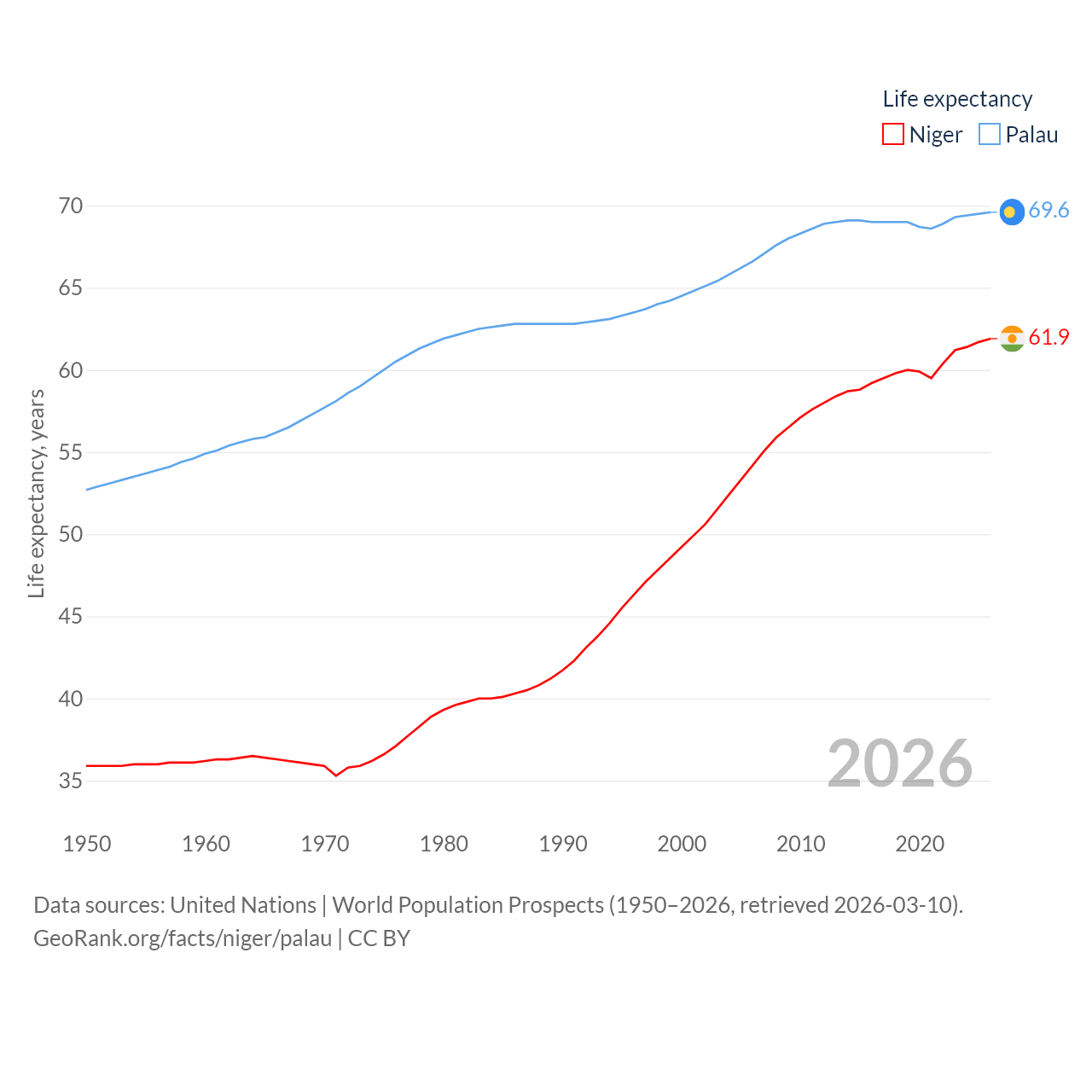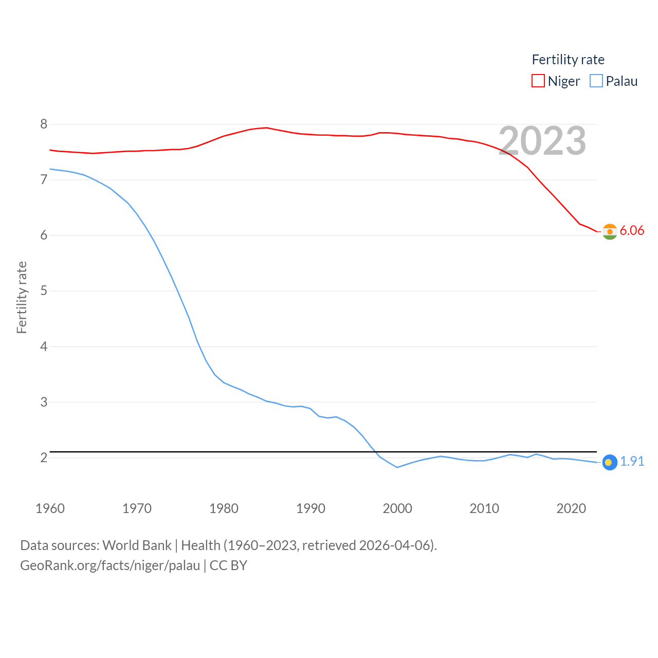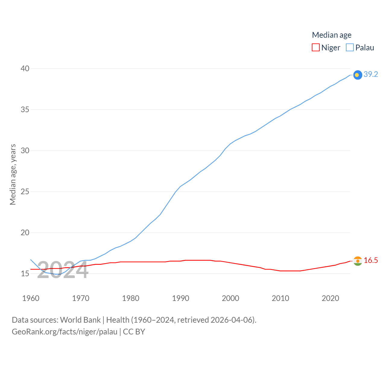 Niger has a population of 27M (ranked 55/197), compared with 17.7K in Palau (ranked 194/197). Niger's land area is 489,076 sq mi versus 177.6 sq mi for Palau (ranked 20th vs. 180th).
