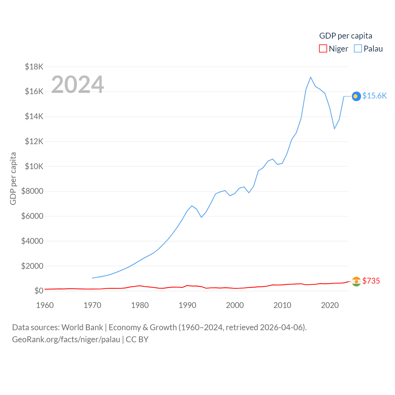 By GDP, Niger ranks 130/197 ($19.9B) and Palau ranks 194/197 ($277M). By GDP per capita, Niger ranks 187/197 ($735), while Palau ranks 67/197 ($15,611).